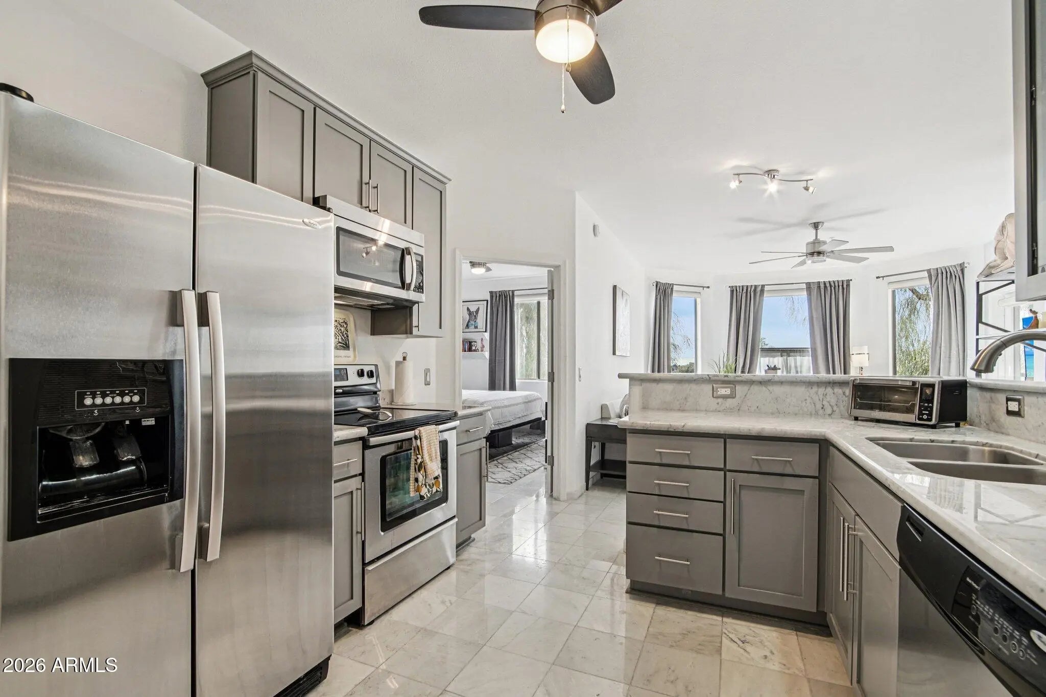 Beautiful mountain view condo in a gated community on Central Avenue in the heart of Phoenix. Featuring a bright, open living area filled with natural light and marble flooring throughout. The open kitchen features stunning marble countertops, stainless steel appliance, and abundant storage. A separate desk area provides the perfect space for a home office or study nook. The desirable split floorplan ensures privacy, with a spacious primary bedroom showcasing an updated walk-in shower and double vanity. A good-sized secondary bedroom is ideal for guests or additional workspace. 1 assigned garage space. Enjoy relaxing outdoors on the covered patio, plus take advantage of the sparkling community pool, spa, and fully equipped workout facilities for resort-style living. Mortgage savings may be available for buyers of this listing.