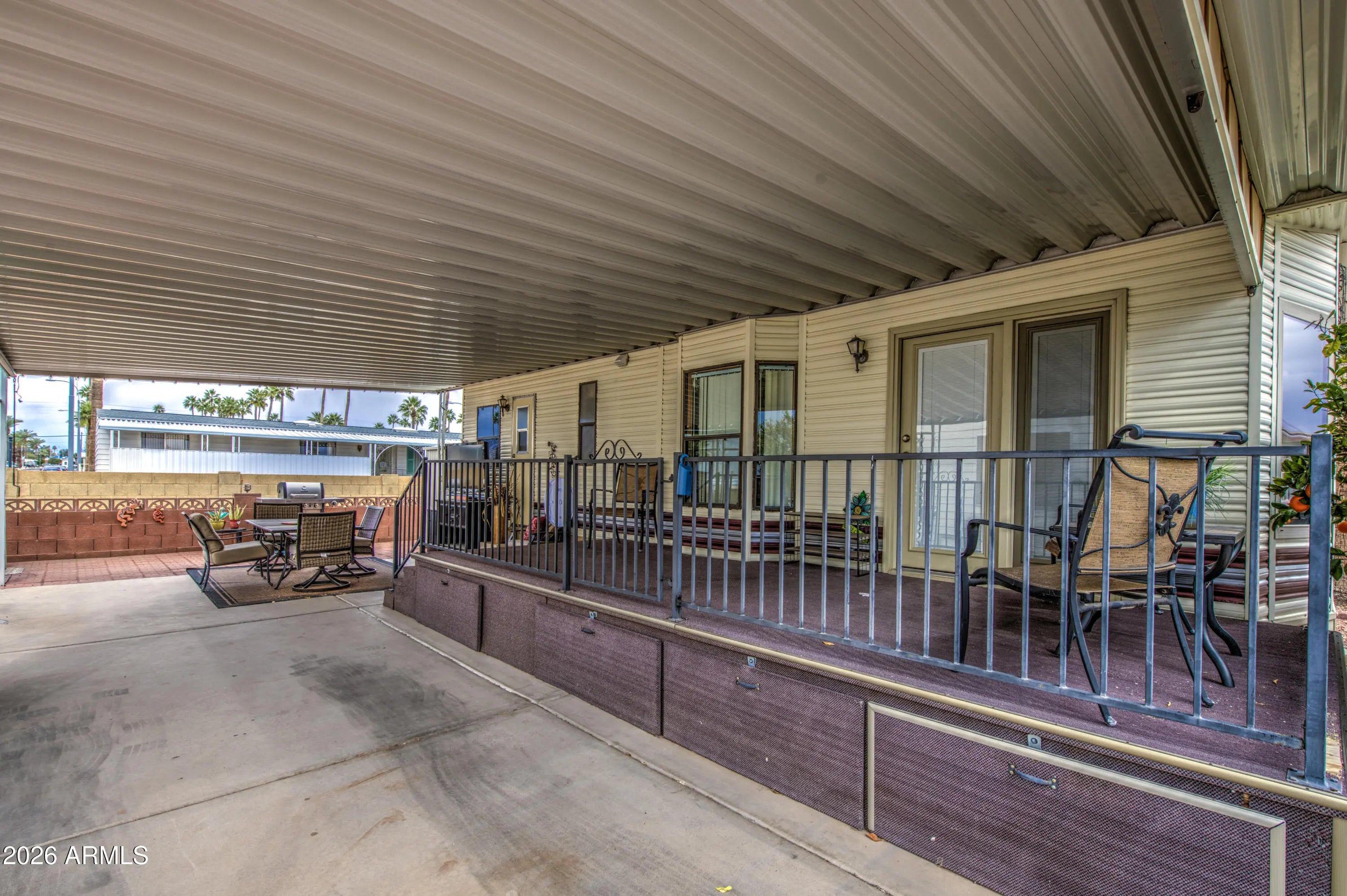 This is a great south facing Park Model in Carriage Manor Resort, a premier 55+ Community where you OWN THE LAND! Most of the windows in this home have been replaced with dual pane. Newer fridge and a ceiling fan in the bedroom and living room. Bathroom has a great walk in shower. Outside you have a very large trex deck with a side gate to unload your groceries. 2 sheds and an amazing outdoor area with a table, chairs, large screen TV and a mini fridge. Carriage Manor has 24/7 on site security, a heated SALTWATER pool/spa, fitness facility, Tennis, Pickleball, Bocce, Shuffleboard, Golf Club, Billiards, Lapidary/Silversmith, Ceramics, Glass Art, Sewing, Wood shop, Bingo, Dances parties & many more activities & amenities.