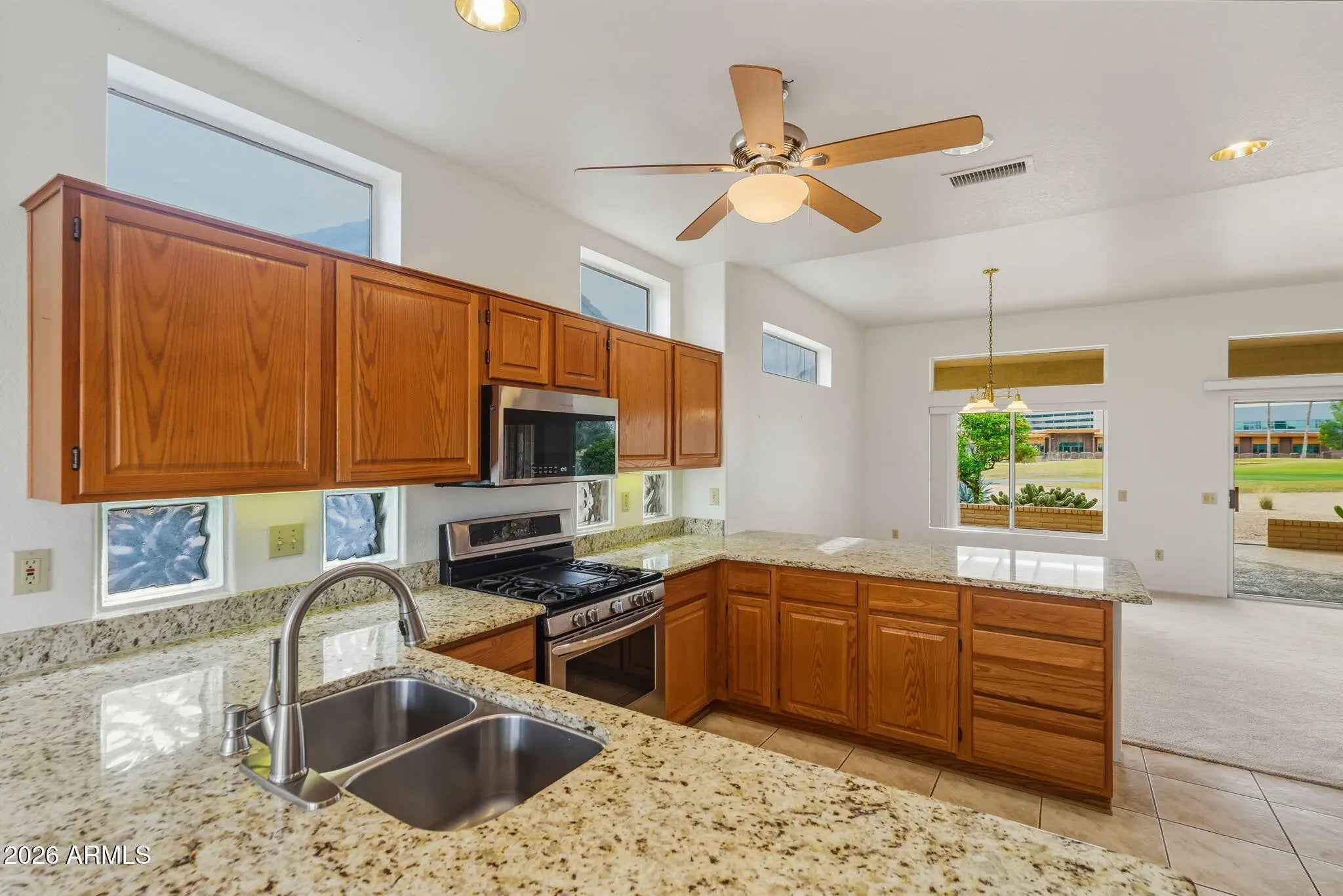 Huge price reduction!!! Beautiful home on Grand View Golf Course! Lovely lot with 3 smaller citrus trees, and large patio with knee wall. Patio, front walk and driveway are all cool decking. Charming living room/dining room with gas fireplace flanked by two bookshelves/storage cabinets has great golf course views including the mountains in the west!!. Kitchen has breakfast room, large two-door pantry and like-new cabinetry and appliances. Large primary bedroom has security door going onto rear patio. Bay window with view of golf course and mountains is a perfect decorator's location! Newer HVAC, roof replaced 2015. Recently painted interior and exterior. Everything is ready for you!