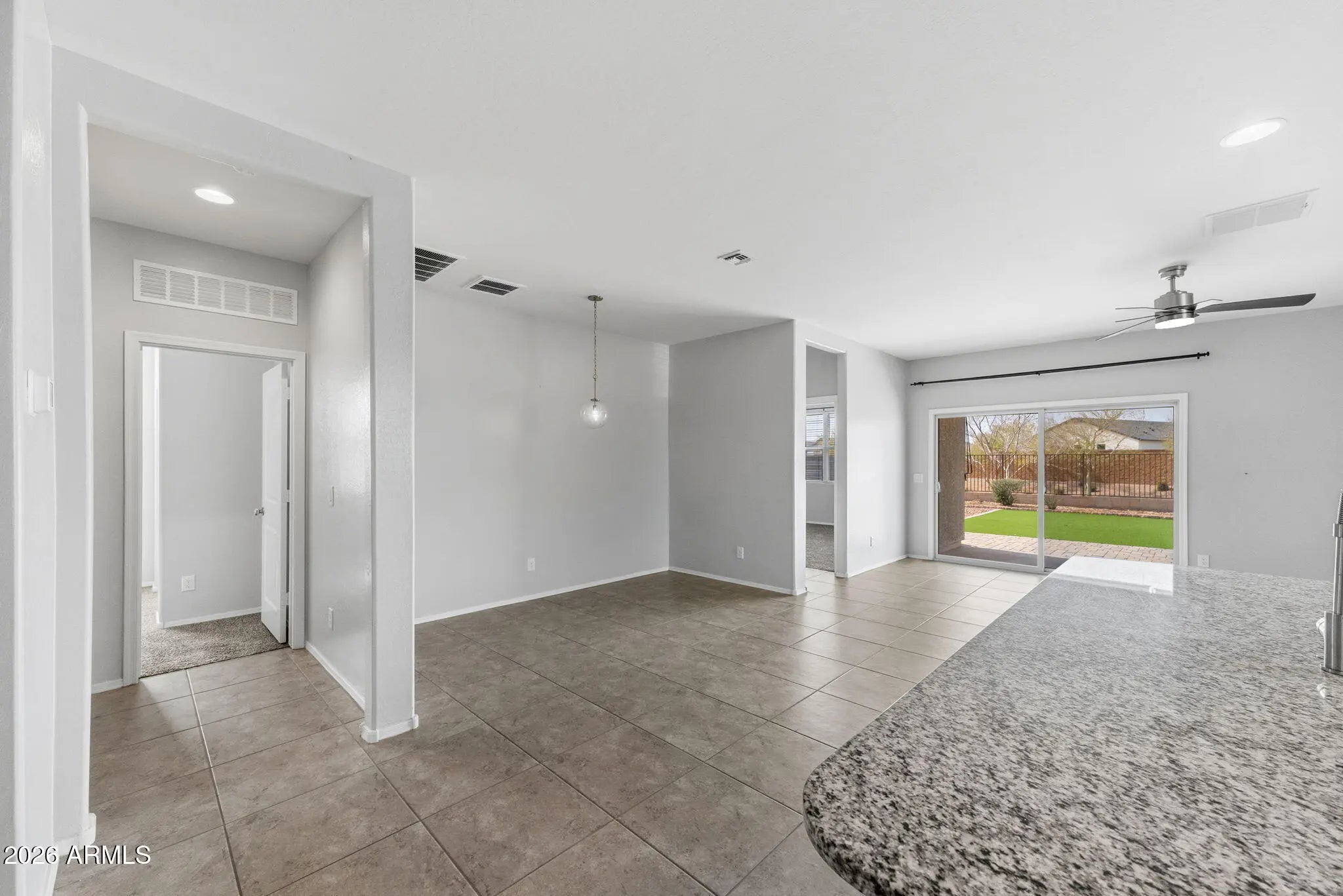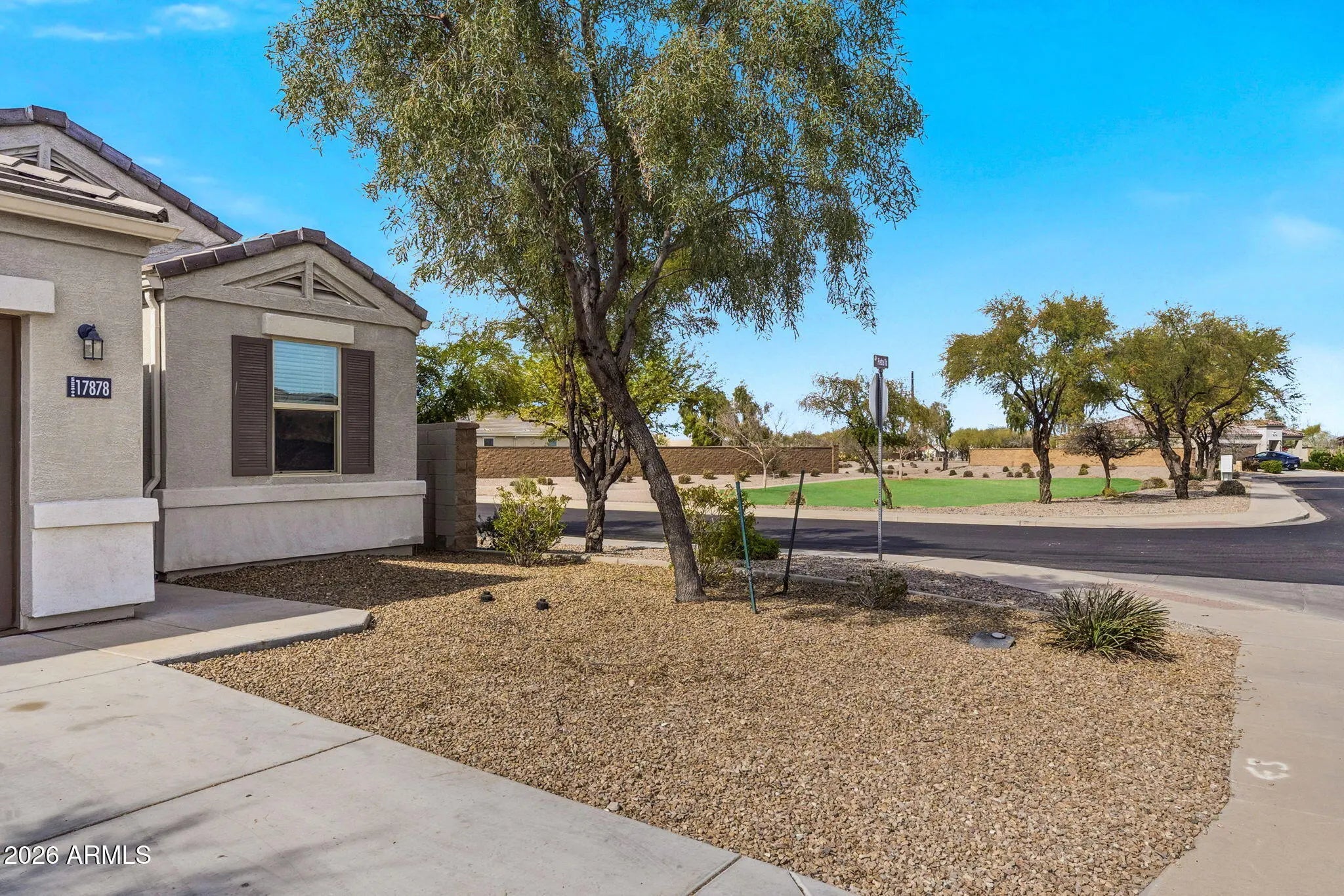 This corner lot features the ''Hummingbird'' model, a spacious open-concept home with a triple split design. Includes three large bedrooms and two baths. The interior boasts 18-inch tile flooring throughout, with carpet in the bedrooms. The kitchen showcases granite countertops and dark cherrywood cabinets. Ceiling fans throughout. Home is equipped with smart home technology, a 14 SEER HVAC system, and energy-saving features. It comes with stainless steel appliances, 2-inch window blinds, a garage door opener, and rain gutters. The front and back yards are designed for low maintenance with desert landscaping and artificial turf. Ponds and Lakes, 3 parks, basketball and tennis courts, and numerous walking paths. Backs to a walking path and is just 100 yards from a park. Sorrentos the