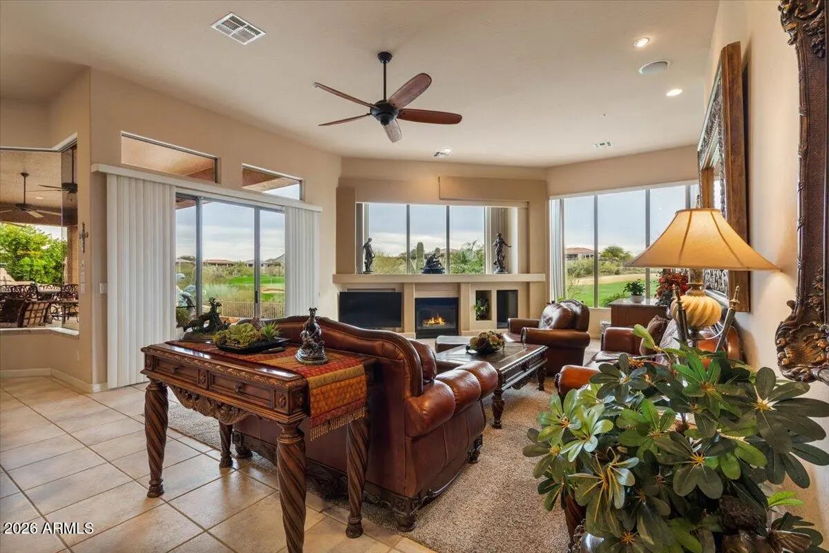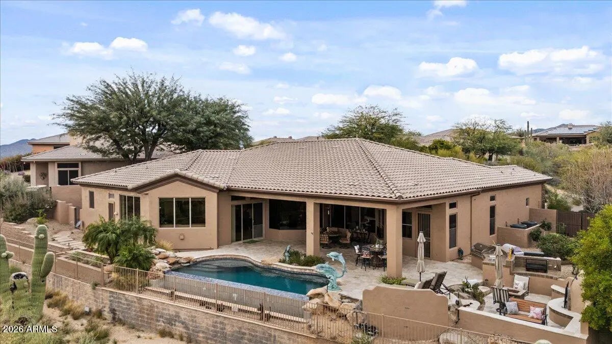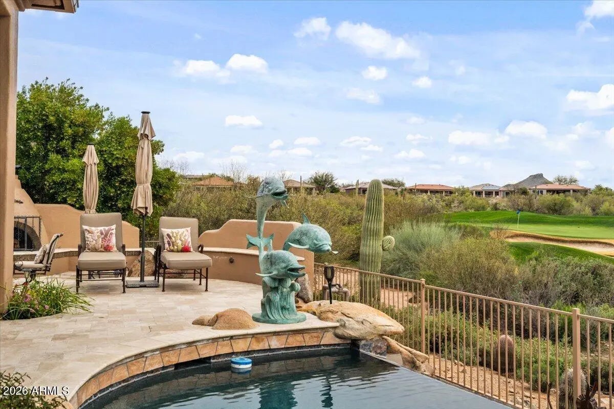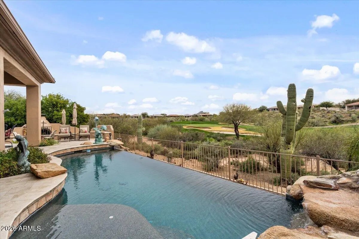 Situated on the premier 11th hole of Legend Trail, this exceptional residence occupies a hand-selected golf course lot offering sweeping fairway + green views and rare privacy, with a wash separating the property from neighboring homes to the east. The thoughtfully-designed floor plan features a temperature-controlled wine cellar, movie theater, a wet bar, and a dedicated home office, providing versatile spaces for both everyday living and entertaining. The chef's kitchen is equipped with Wolf appliances, generous counter space, and a seamless flow into the main living areas. The back yard is designed for true Arizona outdoor living, featuring a heated infinity-edge pool, an outdoor kitchen, fireplace, and ideally laid out gardening areas, all positioned to capture panoramic golf course views and stunning desert sunsets. Recent improvements include a newer roof with a 20-year warranty, newer HVAC units, a brand new water heater and water softener, along with fresh interior and exterior paint. A redesigned front patio and a striking iron front door enhance both efficiency and curb appeal.