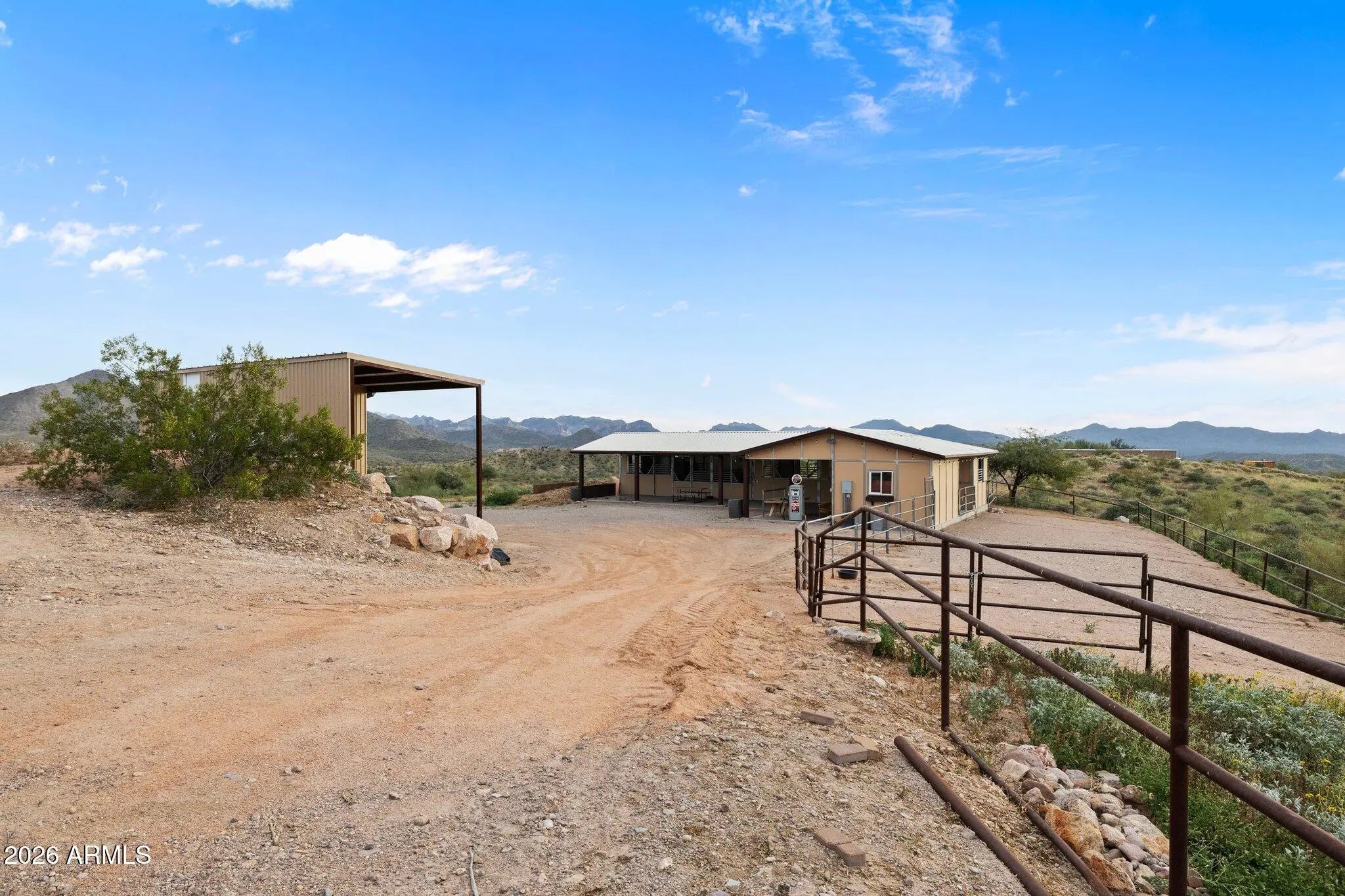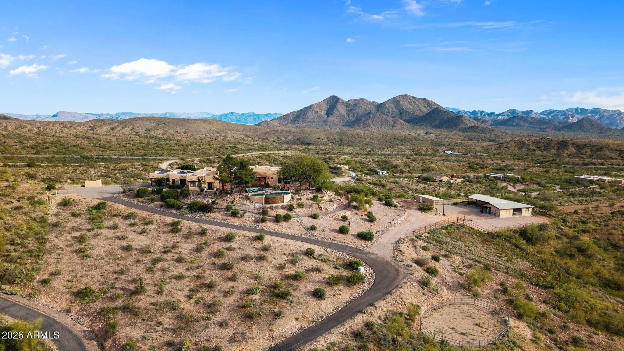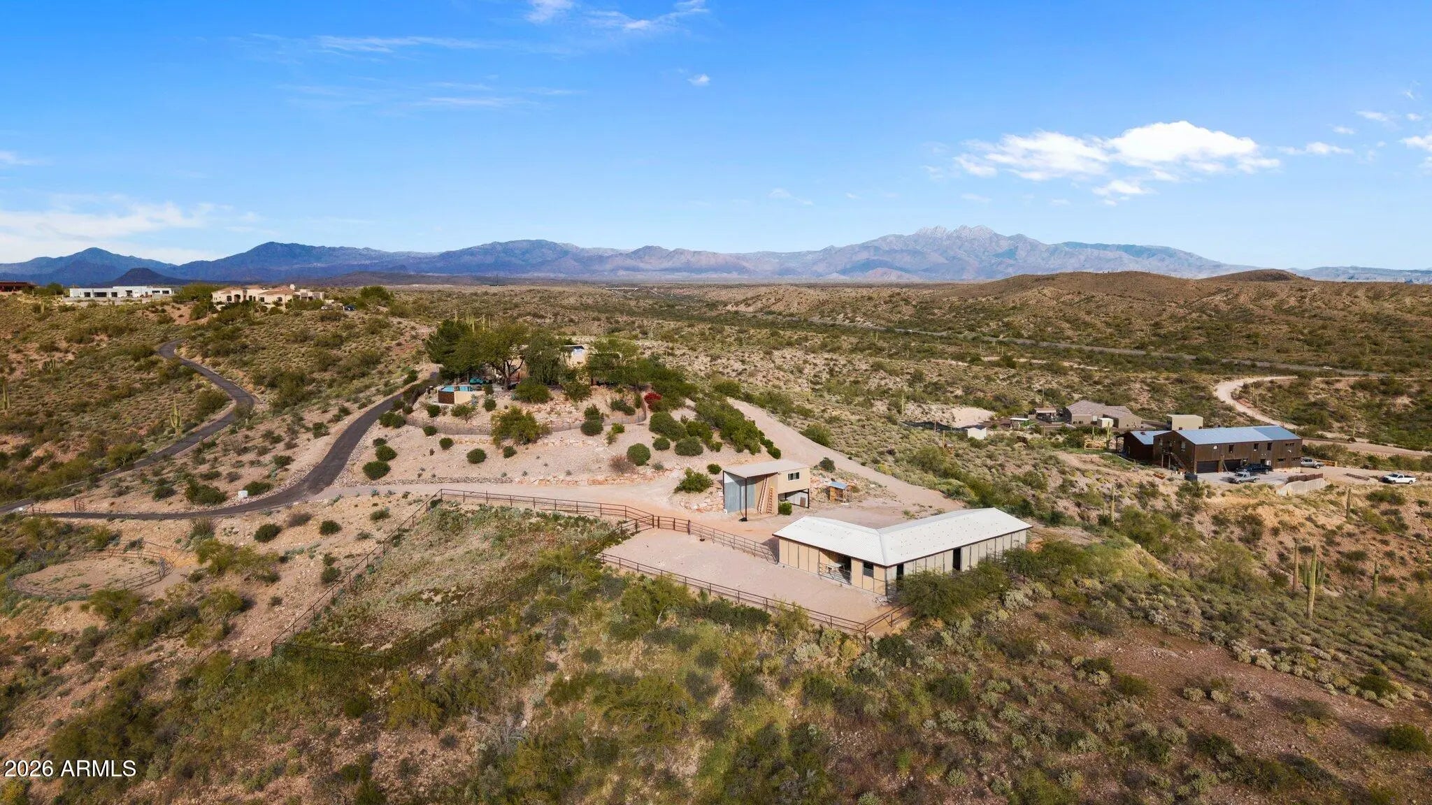 Perched atop a private hilltop in prestigious Goldfield Ranch, this luxury equestrian estate offers breathtaking 360° panoramic views of mountains, desert landscapes, and Arizona sunrises and sunsets from 6+ pristine acres at 2,000' elevation. Designed for upscale ranch living, the single-level home features a negative-edge PebbleTec pool, owned solar with Tesla backup batteries, EV charging, new HVAC (2025), updated well pumps, and a 3,000-gallon cistern. Horse amenities include a 6-stall barn, tack room, paddock, round pen, hay storage, and direct access to Tonto National Forest riding trails. Showcasing territorial architecture, Rhino Shield exterior, custom lighting, secure snake fencing, and exceptional privacyâ€''just 35 minutes to Sky Harbor and minutes to Saguaro Lake and We-Ko-Pa