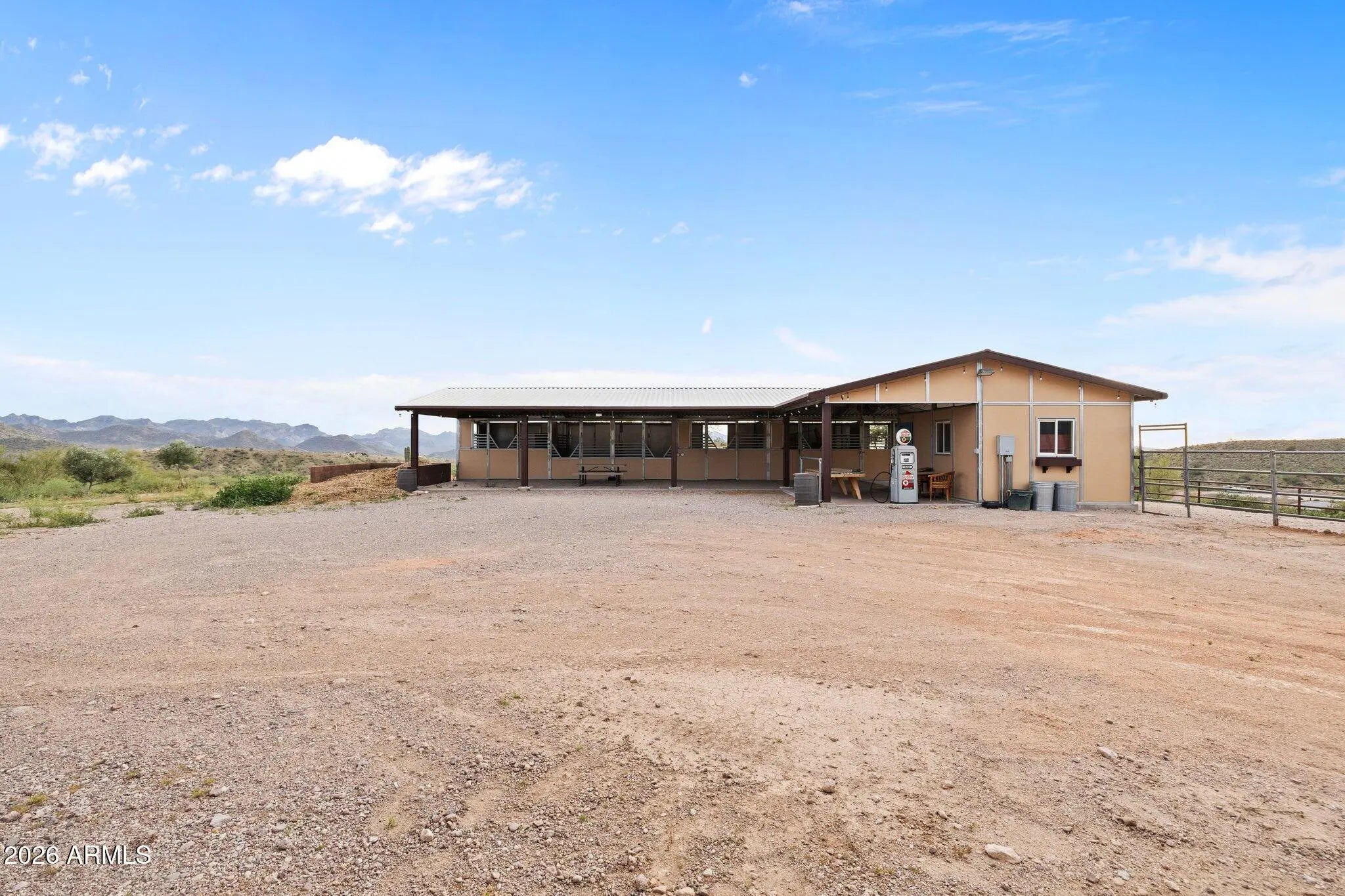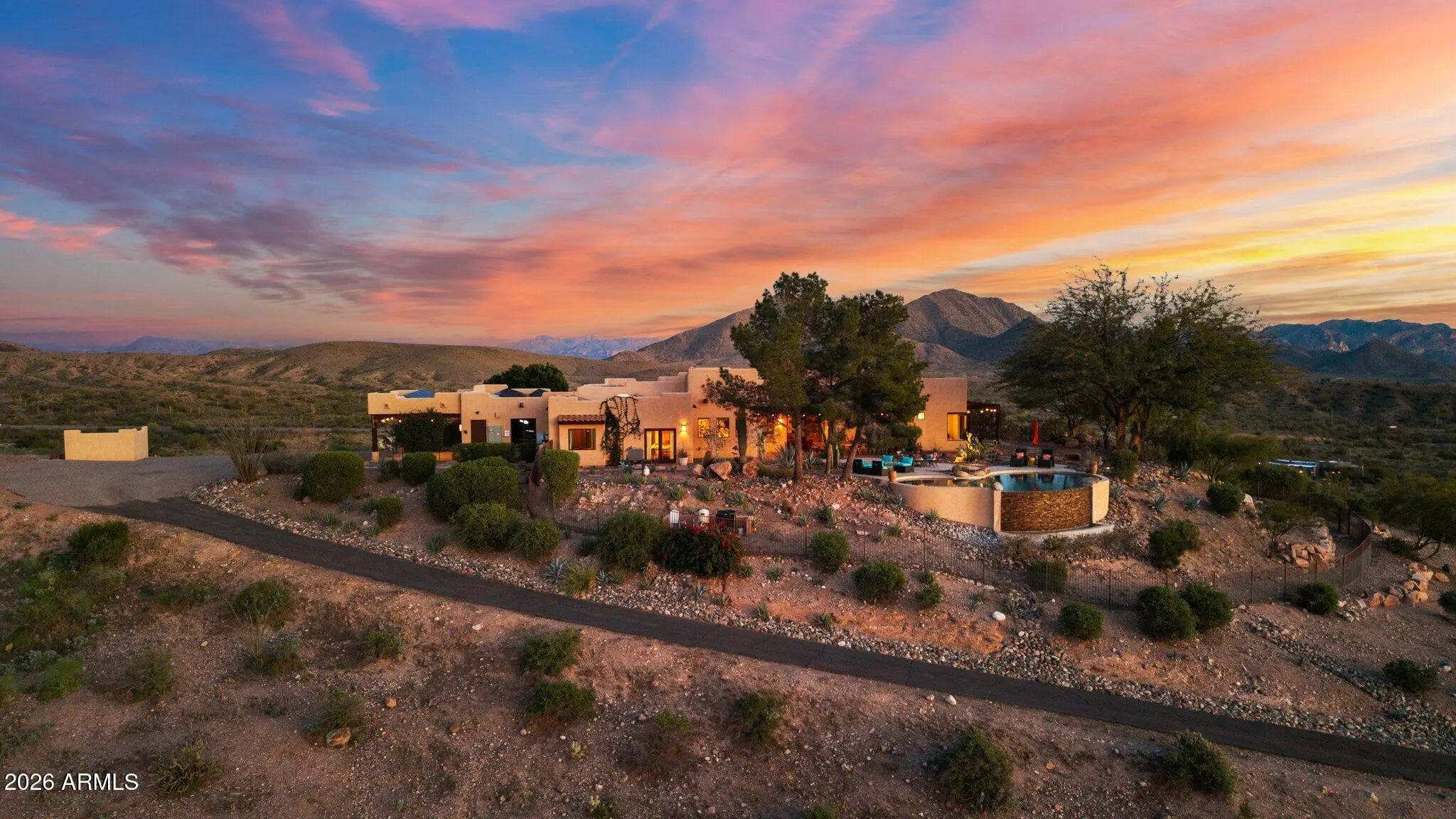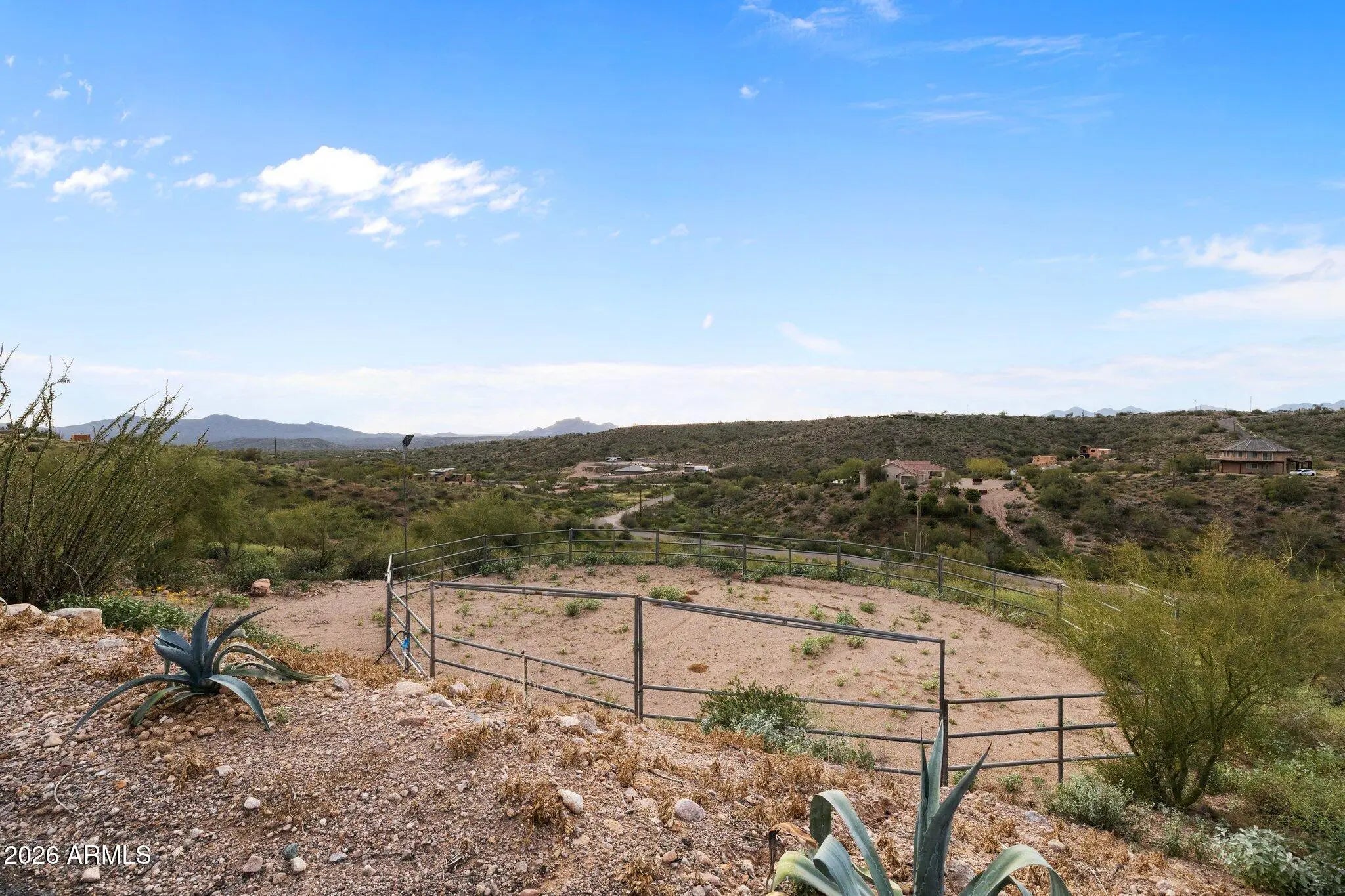 Perched atop a private hilltop in prestigious Goldfield Ranch, this luxury equestrian estate offers breathtaking 360° panoramic views of mountains, desert landscapes, and Arizona sunrises and sunsets from 6+ pristine acres at 2,000' elevation. Designed for upscale ranch living, the single-level home features a negative-edge PebbleTec pool, owned solar with Tesla backup batteries, EV charging, new HVAC (2025), updated well pumps, and a 3,000-gallon cistern. Horse amenities include a 6-stall barn, tack room, paddock, round pen, hay storage, and direct access to Tonto National Forest riding trails. Showcasing territorial architecture, Rhino Shield exterior, custom lighting, secure snake fencing, and exceptional privacyâ€''just 35 minutes to Sky Harbor and minutes to Saguaro Lake and We-Ko-Pa