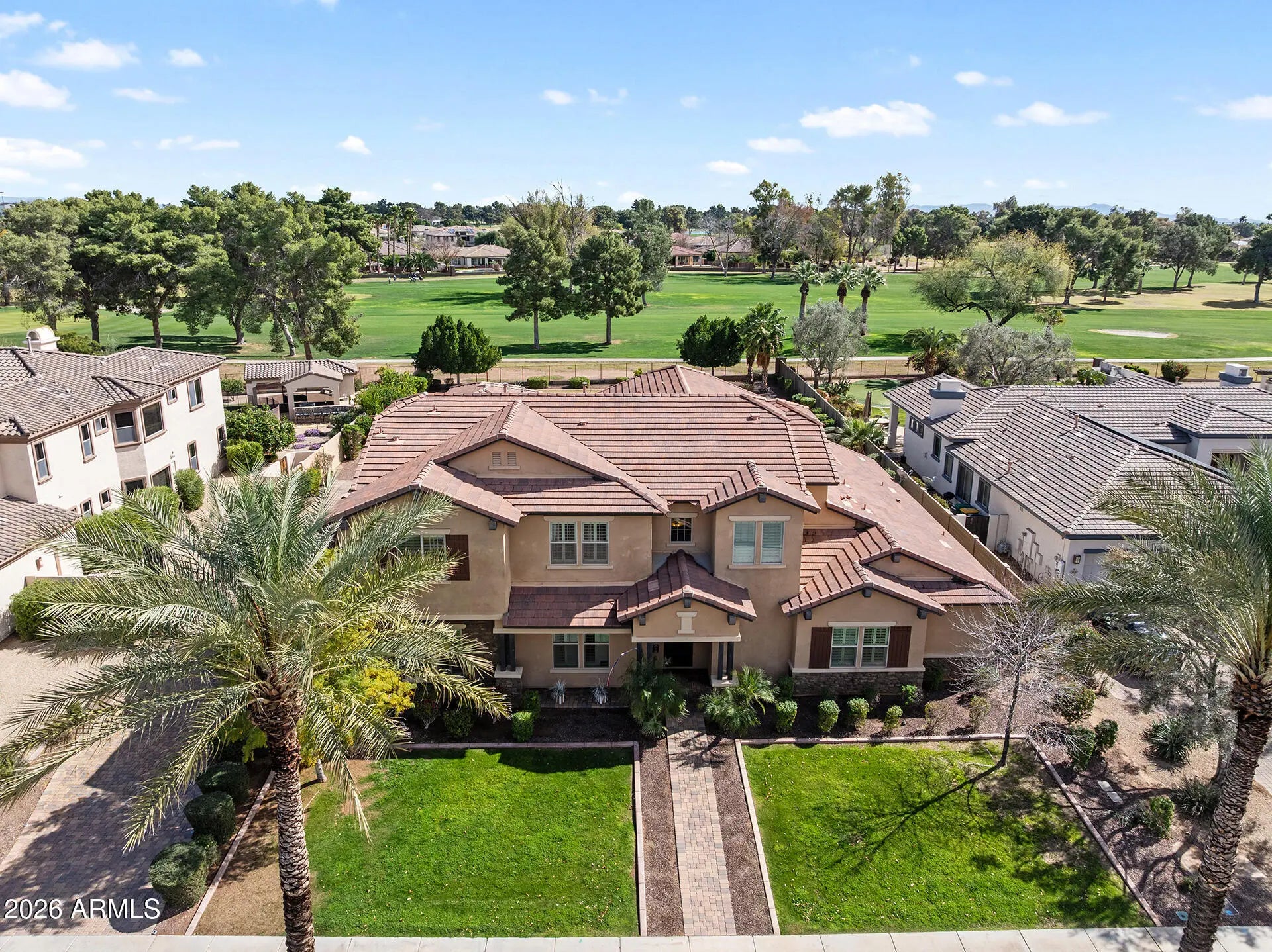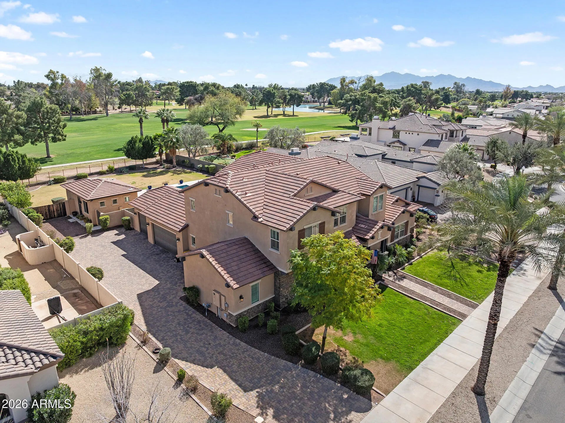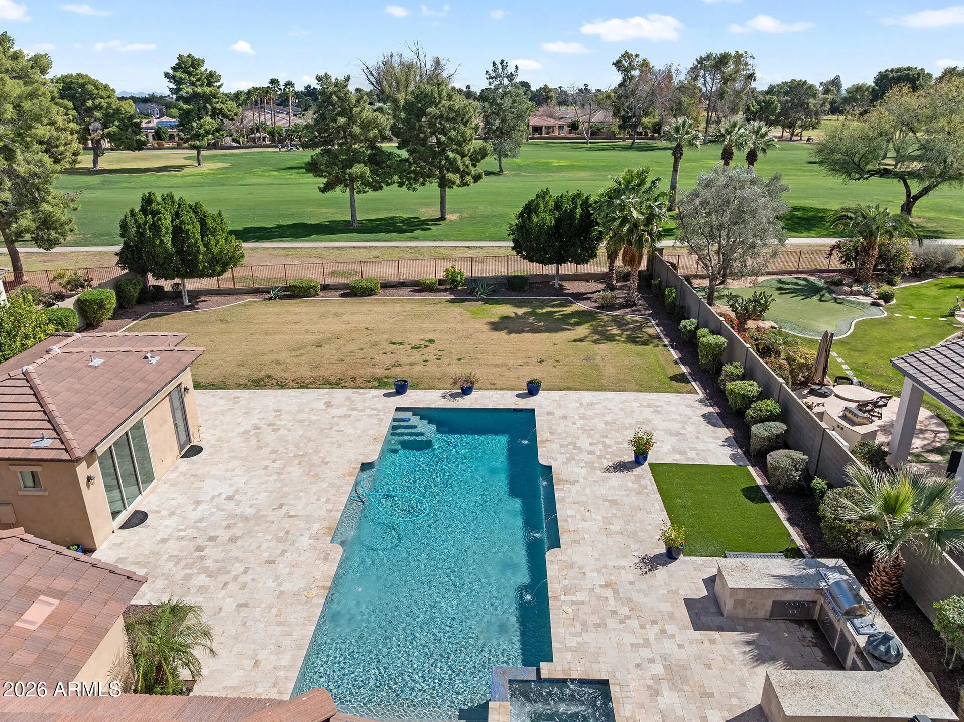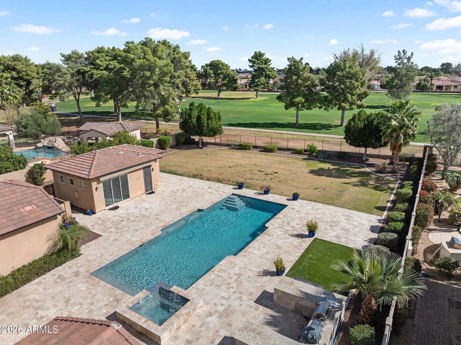 Prepare to be captivated. Perfectly positioned on one of the largest golf course lots in all of The Village at Litchfield Park, this extraordinary estate commands sweeping views of the lush fairways of the Wigwam Golf Club and offers a lifestyle that feels like a permanent vacation. From the moment you arrive, the setting alone sets this home apart; expansive, private, and simply unforgettable. This 5-bedroom, 5.5-bath showpiece was masterfully designed to impress, blending refined elegance with effortless indoor-outdoor living and exceptional entertaining spaces. At the heart of the home, the chef's kitchen is a true standout, featuring a built-in refrigerator, double ovens, built-in ice maker, butler's pantry with beverage refrigerator, walk-in pantry, and endless custom cabinetry... Oversized sliding glass doors disappear to reveal a resort-style backyard complete with a lap-length heated pool with in-water seating, an oversized spa, multiple lounge areas, and a fully equipped outdoor kitchen with built-in grill, sink, and expansive granite prep space, all framed by breathtaking golf course views. The bright, ground-floor primary suite feels like a luxury retreat with a tray ceiling, new tile flooring, a spa-inspired snail shower, custom linen closet, and an expansive walk-in closet with built-in organization. Upstairs, a spacious flex area leads to a grand balcony where you can savor Arizona's vibrant sunrises, while three generous bedrooms each offer their own ensuite bath and custom walk-in closet, conveniently located near an upstairs laundry room with soaking sink and cabinetry. Guests will enjoy ultimate privacy in the 498-square-foot detached casita featuring a separate bedroom, sitting area, full bath, retractable awning, and two walls of oversized sliding glass doors. Complete with a 4-car garage with sink, workbench, and built-ins, a dramatic stone-framed electric fireplace, and custom library shelving and desk, this is more than a home--it's a rare golf course estate designed for those who expect the extraordinary.