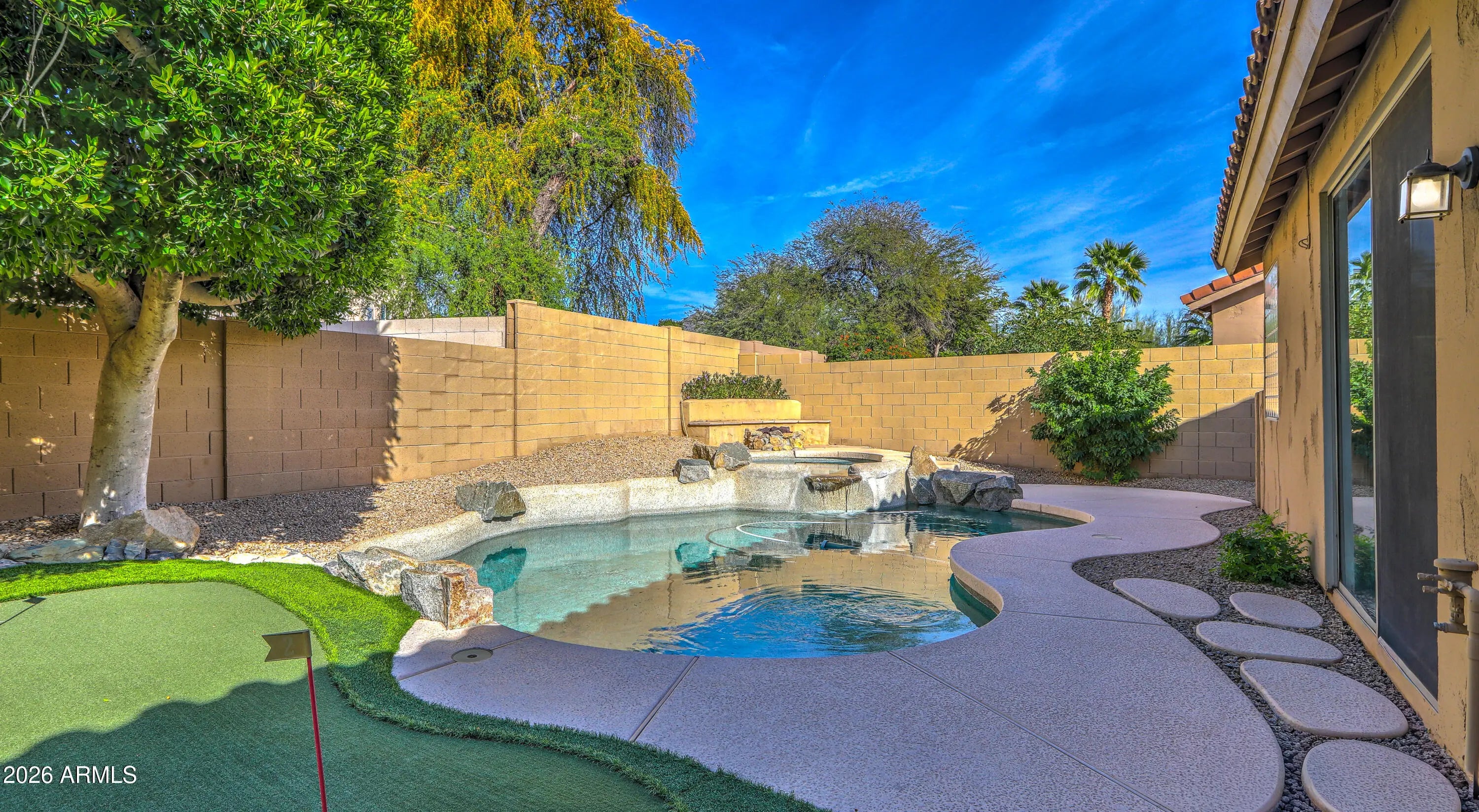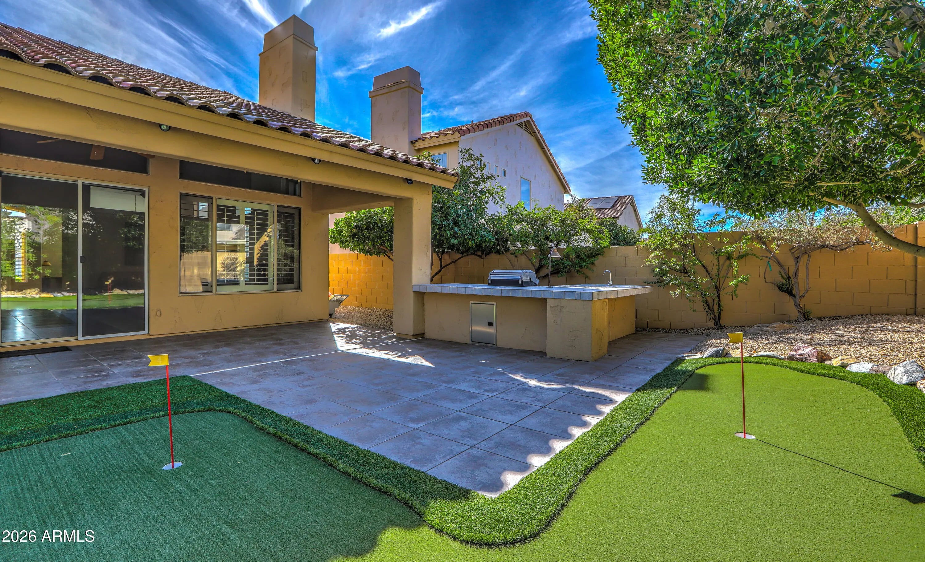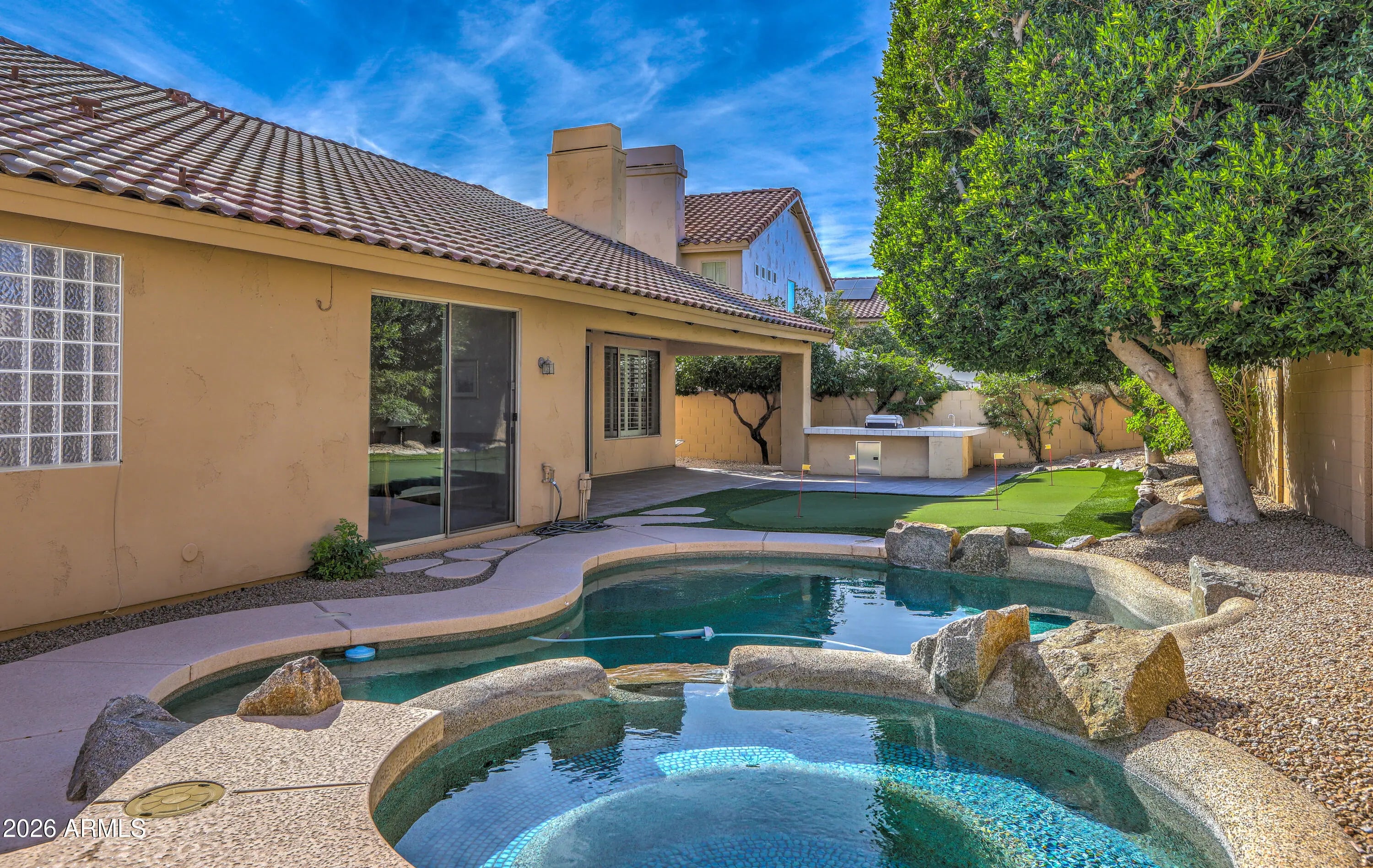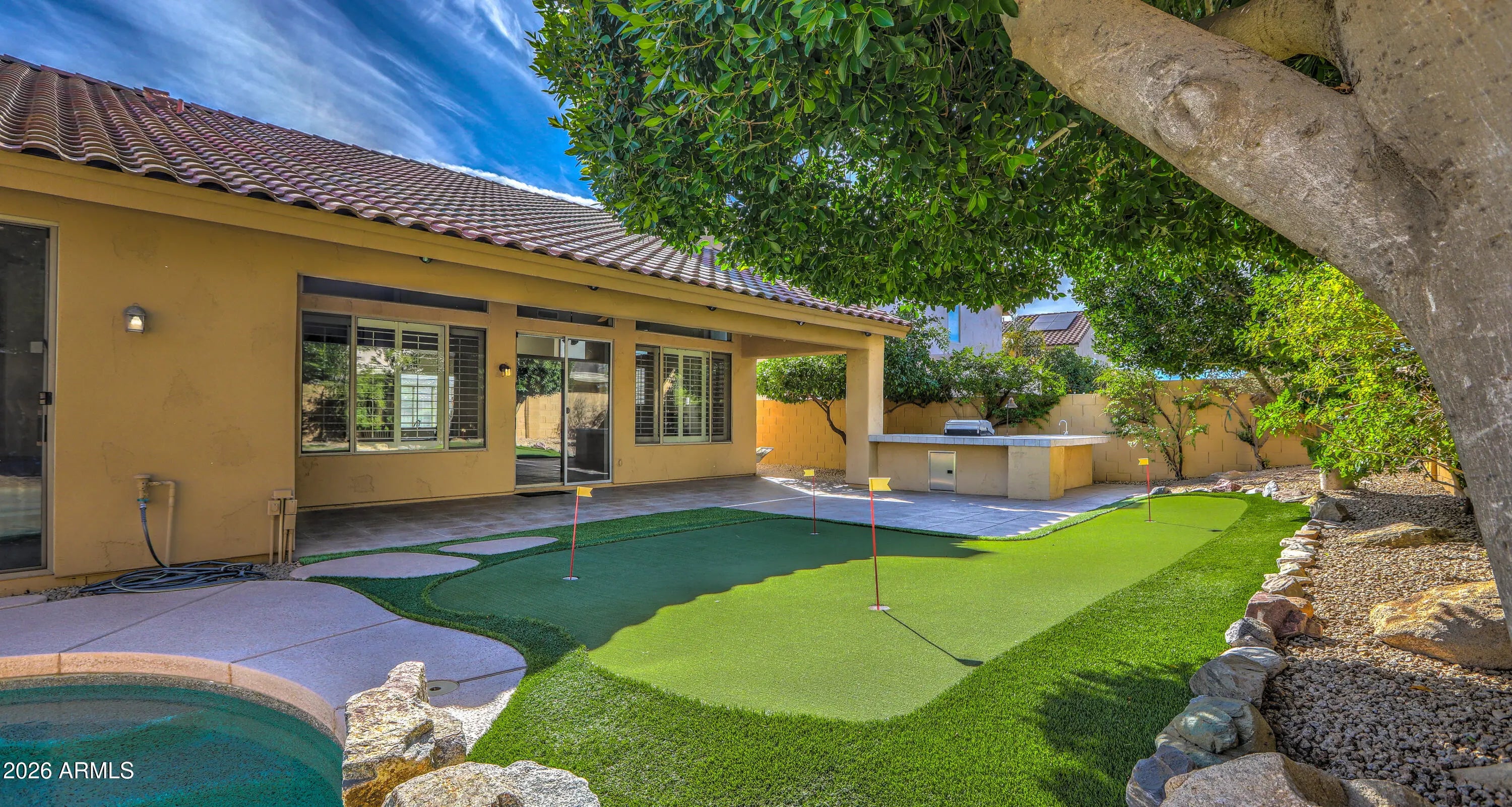 RARE FIND! Maybe the only 4 bdrm, 2 bath, SINGLE LEVEL, 3-CAR GARAGE/ POOL/SPA , home under 1M in all of Scottsdale! Set on PRIVATE/QUIET NORTH/SOUTH LOT, with shady trees, expanded covered patio, home is well cared for & IMMACULATE!!! LIGHT & BRIGHT, OPEN FLOORPLAN provides comfortable yet functional living. LOADED WITH UPGRADES INSIDE & OUT!: PUTTING GREEN, BUILT-IN OUTDOOR BBQ GRILL, Pebble-tec POOL/SPA, GAS FIREPIT AND MORE! granite countertops, stainless appliances, custom backsplash and soothing neutral paint PLUS!! Soaring vaulted ceilings clerestory windows. Spacious rooms and smart use of space make home play larger than sq ft. Primary Suite with custom closet built-ins overlooks sparkling heated pool/spa. COME SEE TODAY BEFORE ITS GONE