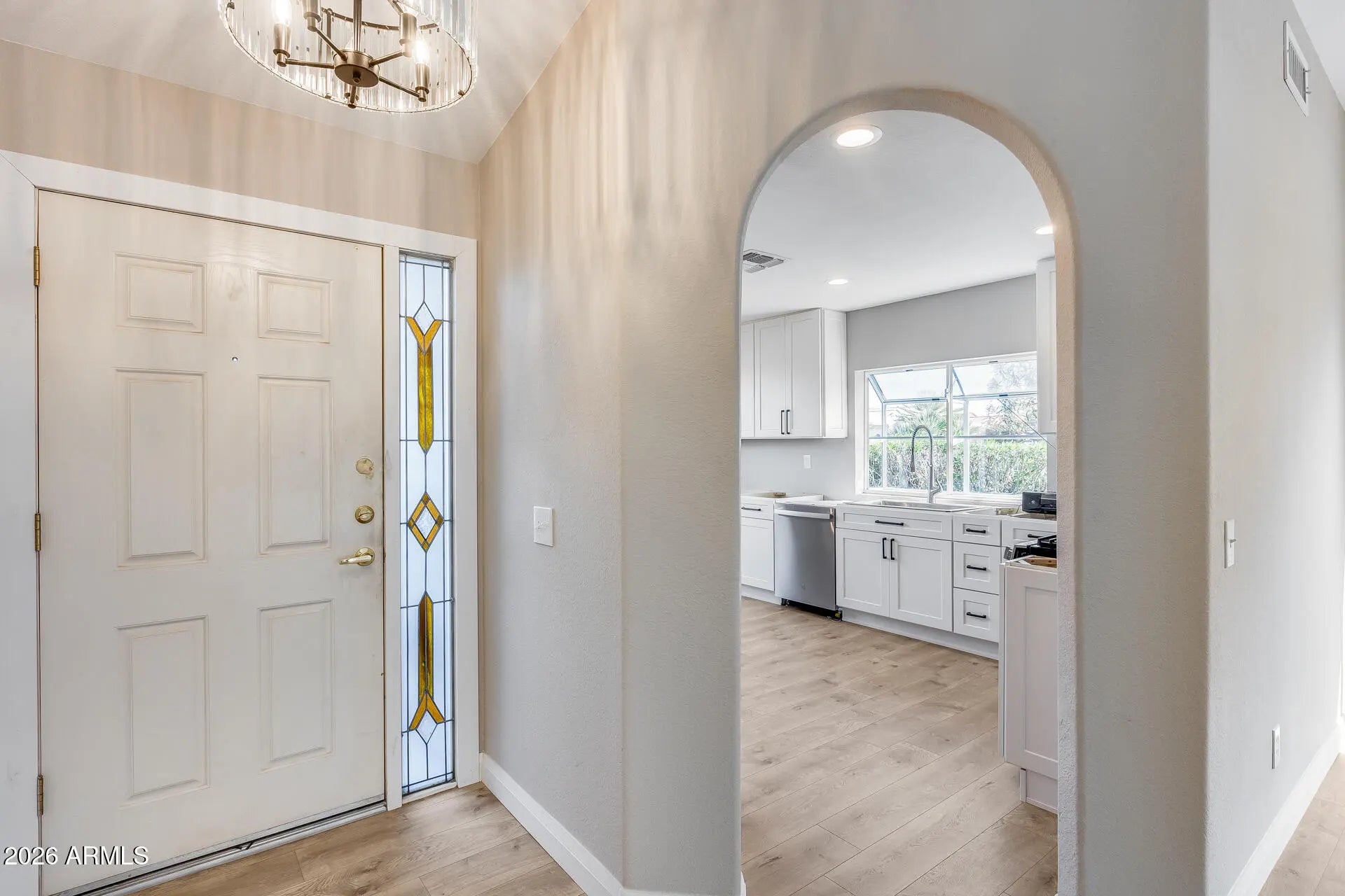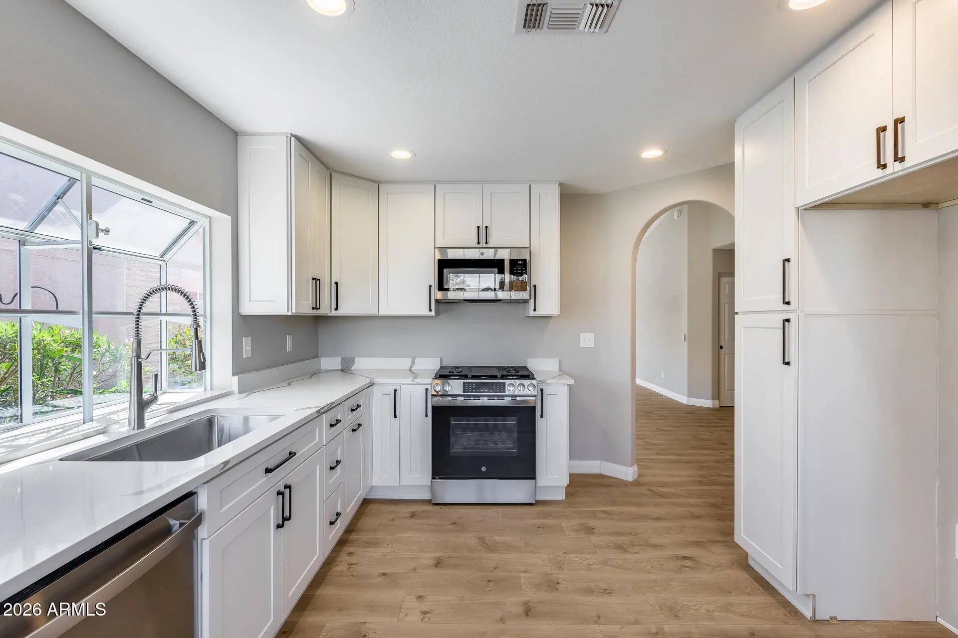 Welcome to your beautifully remodeled home in the highly sought-after active adult gated community of Sun Lakes! This spacious 2-bedroom, 2-bath residence offers 1,583 square feet of thoughtfully updated living space. From the moment you step inside, you'll notice the vaulted ceilings that create an open, airy feel, complemented by brand-new vinyl flooring that flows seamlessly throughout the entire home. The fully remodeled kitchen is a true highlight, featuring stunning white quartz countertops and brand-new white cabinetry, offering a clean, modern look with plenty of storage and prep space. Whether you're cooking for two or entertaining guests, this kitchen delivers both style and functionality.