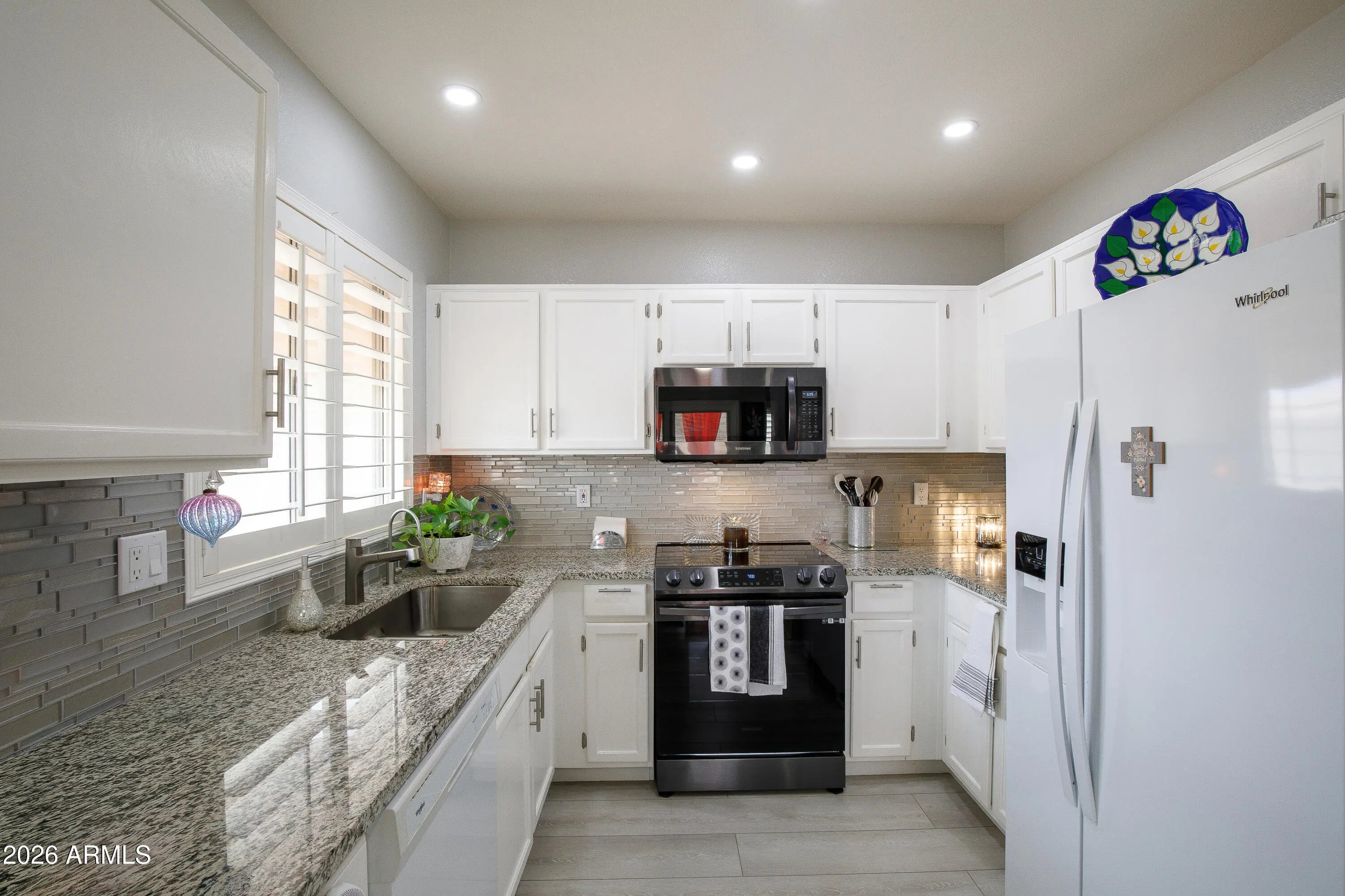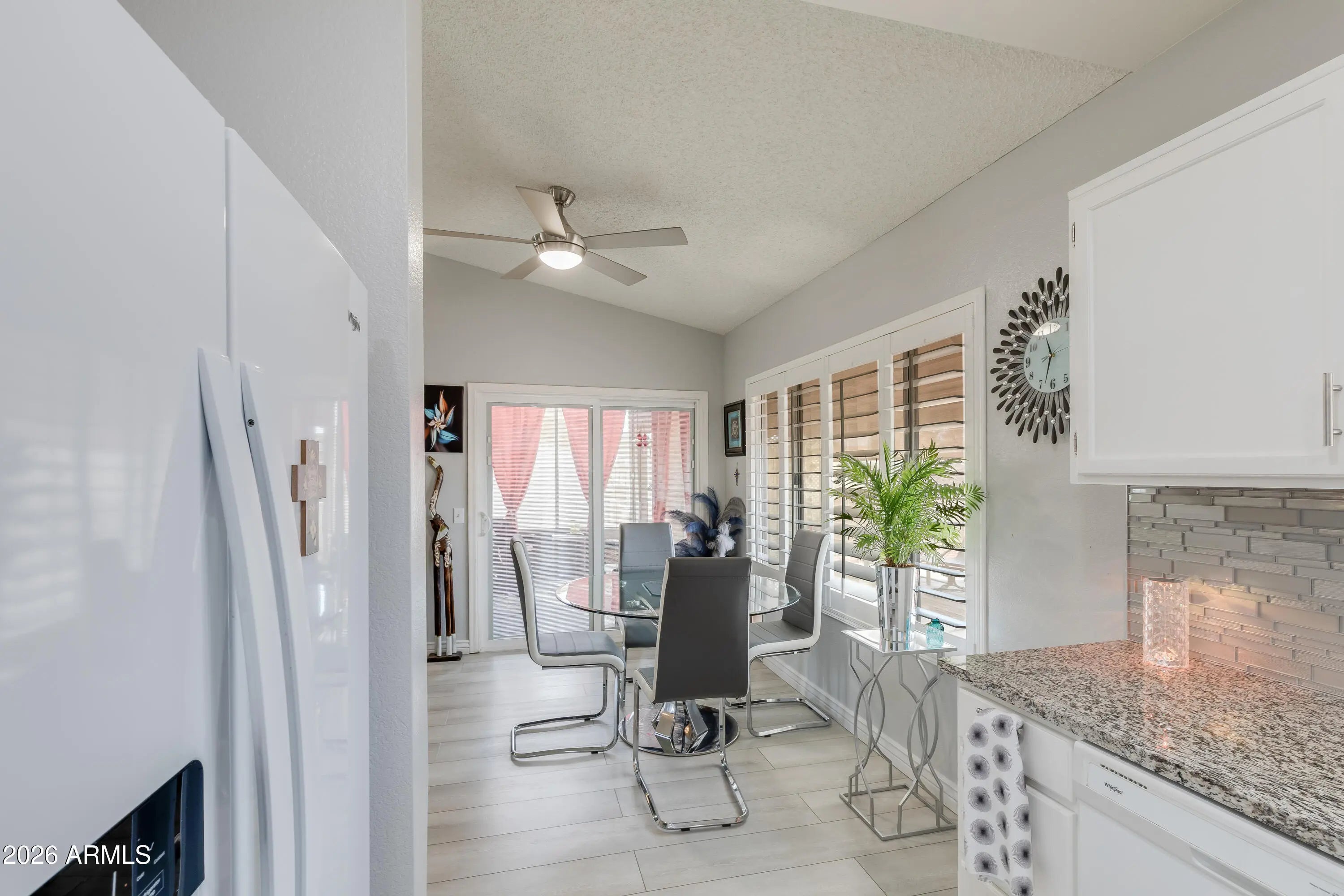 Exquisite 2BR/2BA Catalina model in the popular 55+ Sunbird Golf Community. Open floor plan, beautifully updated with fresh paint inside/out, shutters & LVP flooring/baseboards throughout. Updated white kitchen cabinets with attractive hardware, beautiful granite countertops and decorative tile backsplash finishes off this tastefully decorated home. Arizona room just off dining area opens to a covered patio and a private backyard that is fully enclosed with no neighbors behind. This home has a new roof, newer HVAC unit and hot water tank with home furnishings available; it truly is move-in ready. Sunbird amenities Clubhouse, Horizon Room restaurant & spirits, two pools, library, pool tables, cards, lapidary, ceramics, bocci ball, pickleball, tennis, post office & many more activities