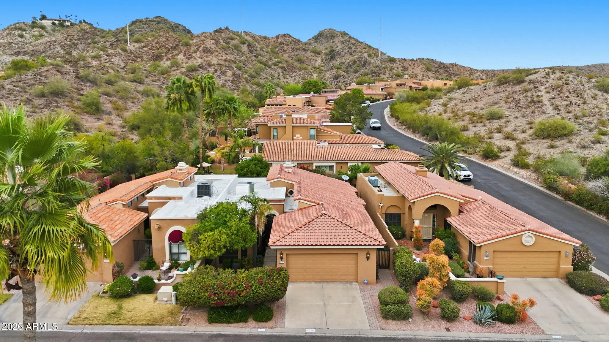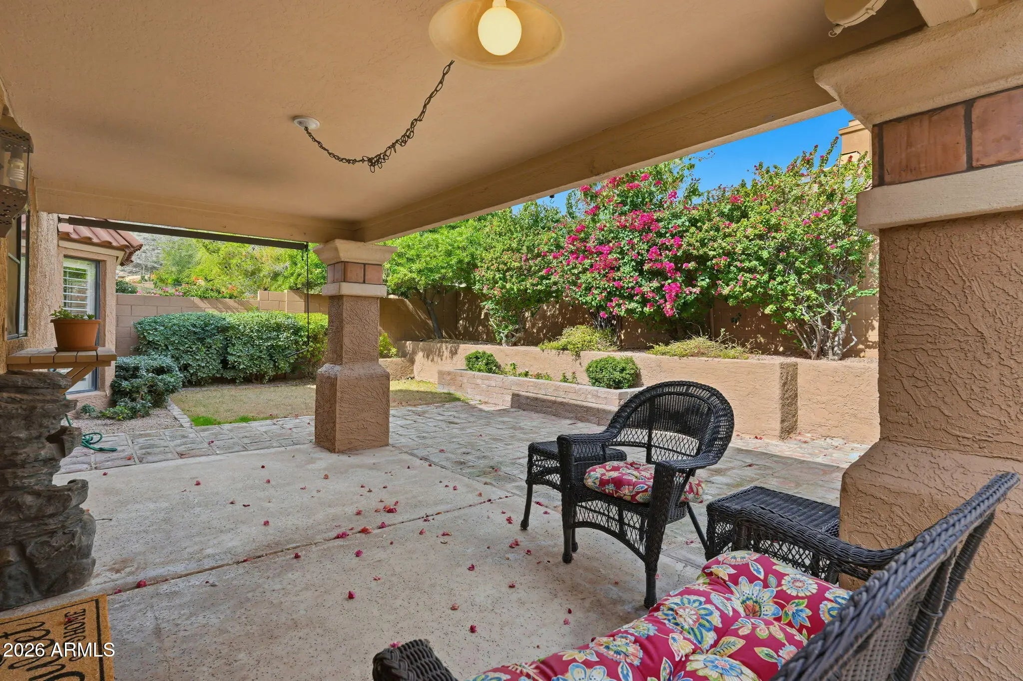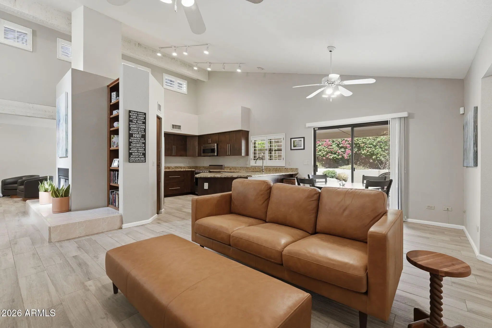 Panoramic mountain views surround this beautifully updated patio home, enjoyed from the private front courtyard and the back patio. Inside, a stunning fireplace with built-in bookshelves anchors the great room, featuring two spacious living areas, a large dining space, and a eat-in kitchen. Vaulted ceilings with wood beams add character, while the neutral palette and thoughtful upgrades make the home truly move-in ready. Offering 3 bedrooms and 2 bathrooms, this home blends charm, functionality, and scenic desert living. Conveniently located near the I-17, SR-51, and Loop 101 with easy access to hiking and biking trails.