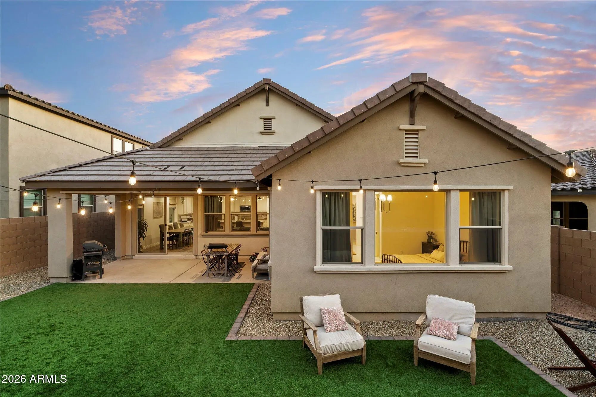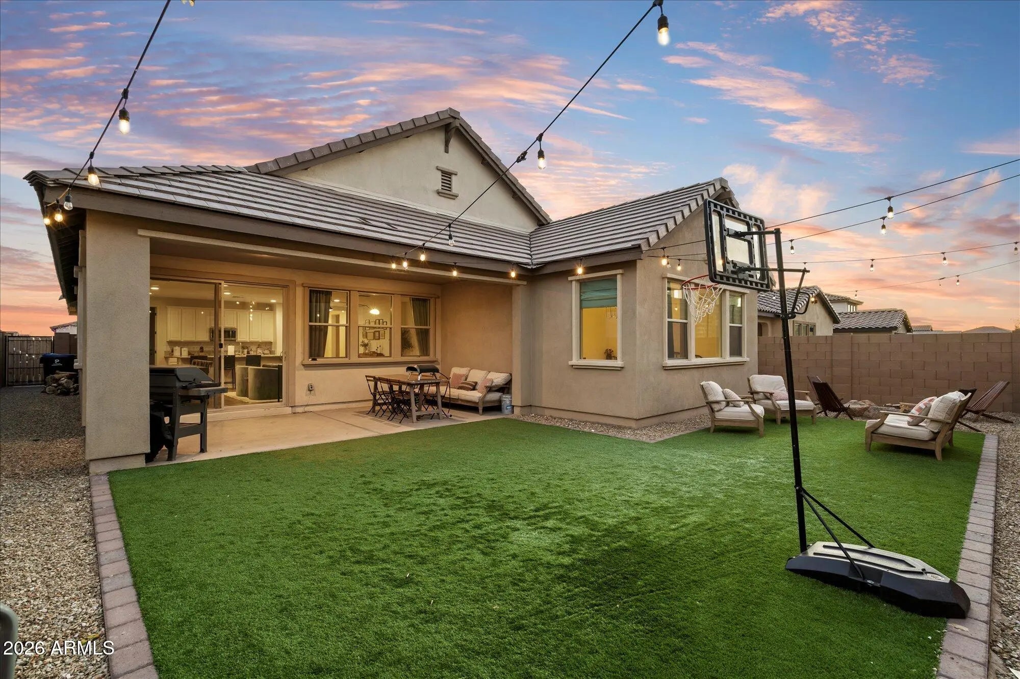 Step into immediate luxury in the heart of Alora Vida, without the wait or hidden costs of new construction. A fully landscaped yard and prime park-side setting make this home ideal for family living. Discover this 4-bedroom, 3-bath residence featuring over $75,000 in renovations that transform the home into a resort-style sanctuary. Inside, the upgraded designer kitchen showcases rare quartzite and sealed marble countertops, anchored by a stunning island with a classic ogee edge, Bedrosians Chloe tile, and designer Delta fixtures. Highlights include an oversized pantry, GE appliances, a Samsung smart refrigerator (2022), and luxury vinyl plank flooring (2022) throughout the main living areas. The sophistication continues in spa-inspired bathrooms, where 24x48 Italian porcelain tile pairs beautifully with timeless Taj Mahal stone. The primary suite offers a walk-in closet and private water closet, while custom sconces illuminate the foyer and living room and checkerboard tile upgrades (2022) add charm. Outside, enjoy a covered patio, turf yard (2022), fire pit, bistro lighting, and extended privacy wall, perfect for entertaining. This isn't just a house; it's a meticulously curated home where every upgrade has been thoughtfully completed, ready for you to enjoy.
