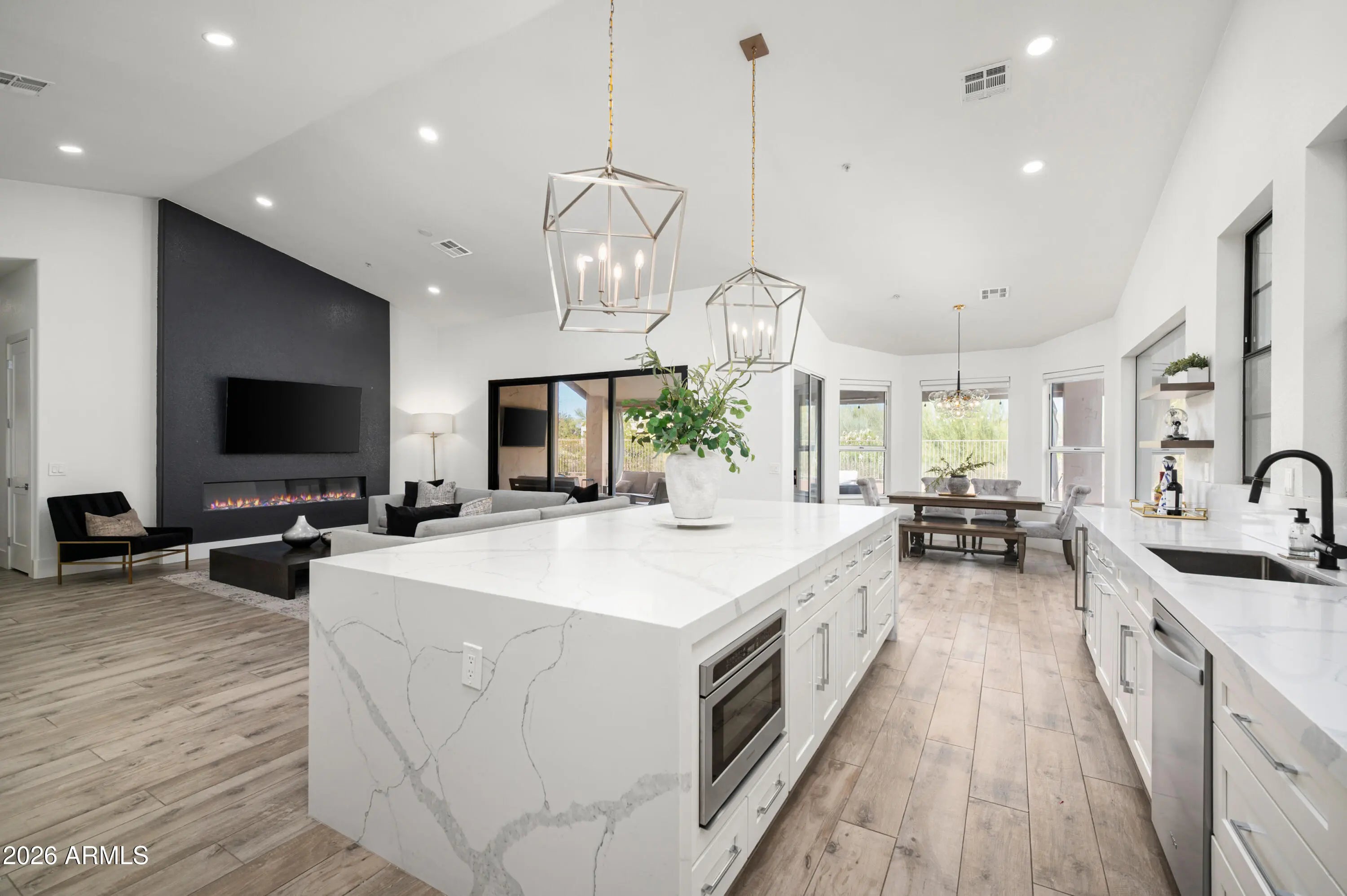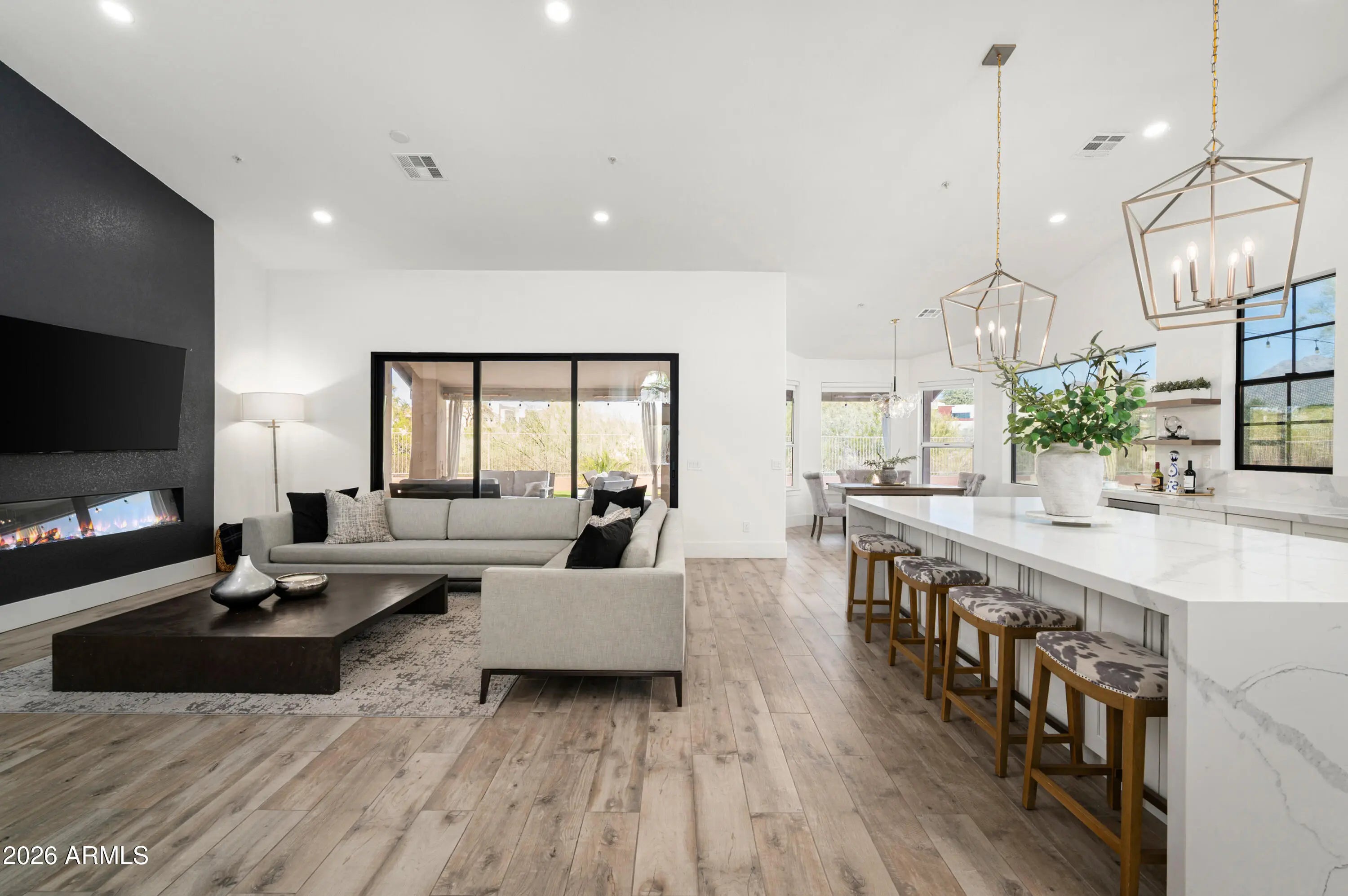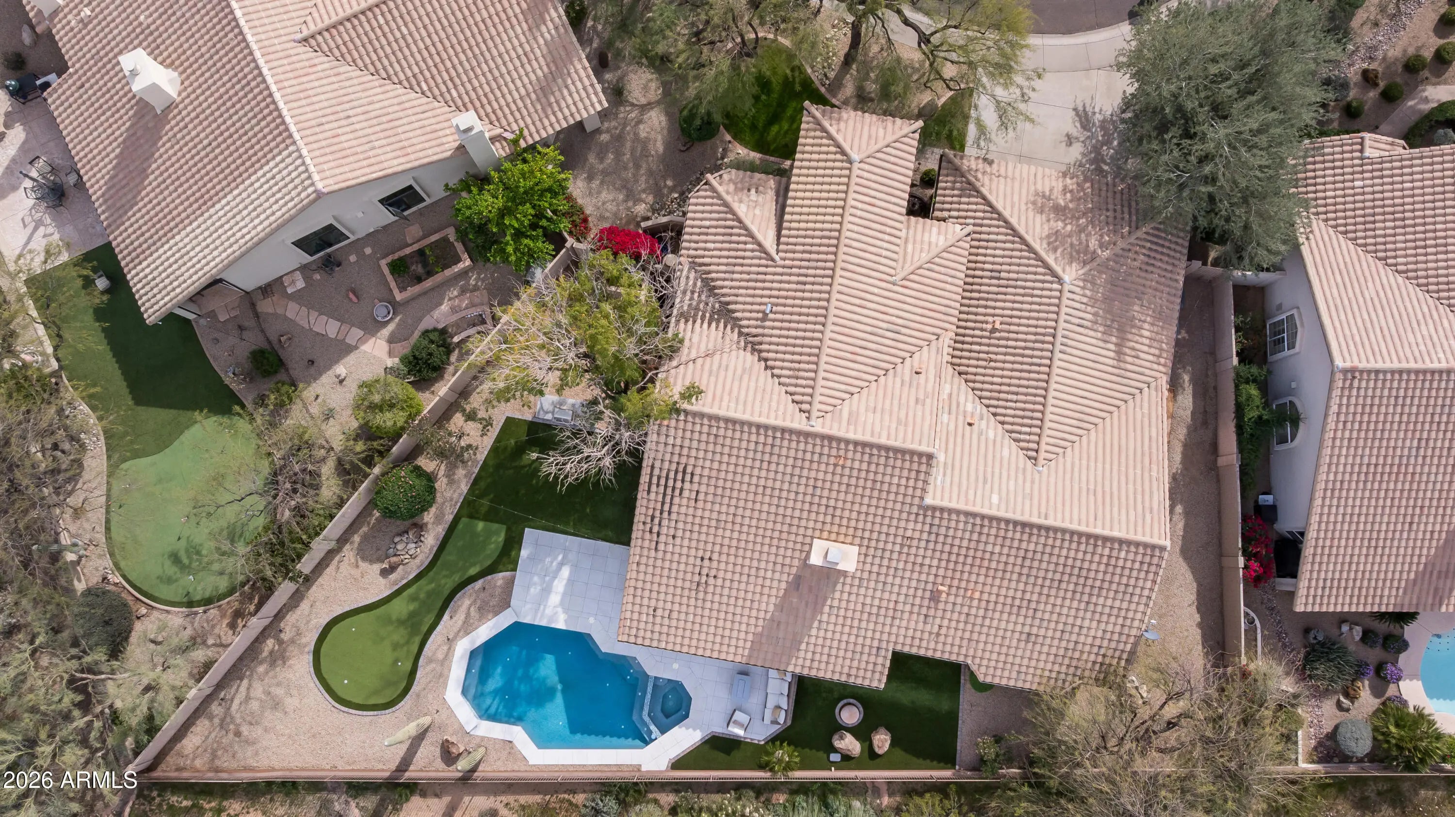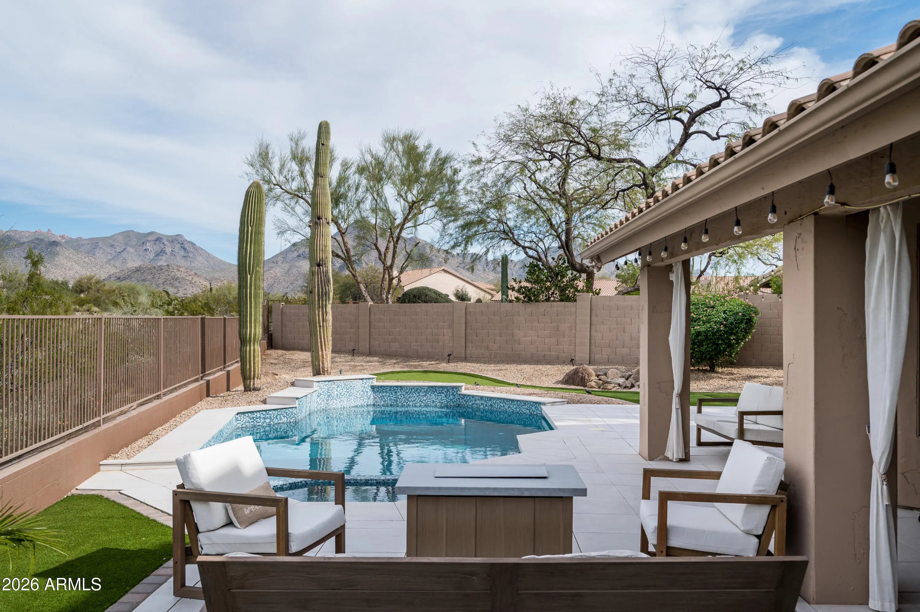 Situated on a quarter-acre lot within the sought-after Estates at Ironwood Village, this fully reimagined custom residence offers refined living with beautiful sunrise and sunset views from the heated pool and spa. Designed with an open-concept layout and no interior steps, the home features five bedrooms, three bathrooms, vaulted ceilings, an oversized sliding glass door, and a contemporary Modern Flames fireplace that anchors the main living space. Natural light fills the thoughtfully redesigned interior, highlighting the stunning chef's kitchen with white shaker cabinetry, Calacatta Laza quartz countertops, a custom waterfall island, and premium stainless steel appliances. A one-of-a-kind custom range hood frames the six-burner gas range, complemented by a 48-inch refrigerator, built-in microwave drawer, dishwasher, and wine fridgeperfect for everyday living and entertaining alike. Indoor and outdoor spaces blend seamlessly with covered patios, whitewashed stone pavers, a heated pool and spa with Azur mosaic tile, built-in BBQ, new putting green, and low-maintenance turf creating an ideal year-round setting. The spacious primary suite offers designer wainscoting, mountain and pool views, dual vanities, a freestanding soaking tub, seamless glass shower, and a generous walk-in closet. A split floor plan provides a private en-suite guest retreat, while three additional bedrooms complete the thoughtfully updated layout. Ideally positioned in the heart of North Scottsdale, residents enjoy access to scenic walking and biking paths, nearby parks and recreational amenities, and effortless connectivity to the area's premier dining, shopping, golf, and entertainment destinations. This exceptional property offers the perfect balance of privacy, convenience, and modern Arizona living.