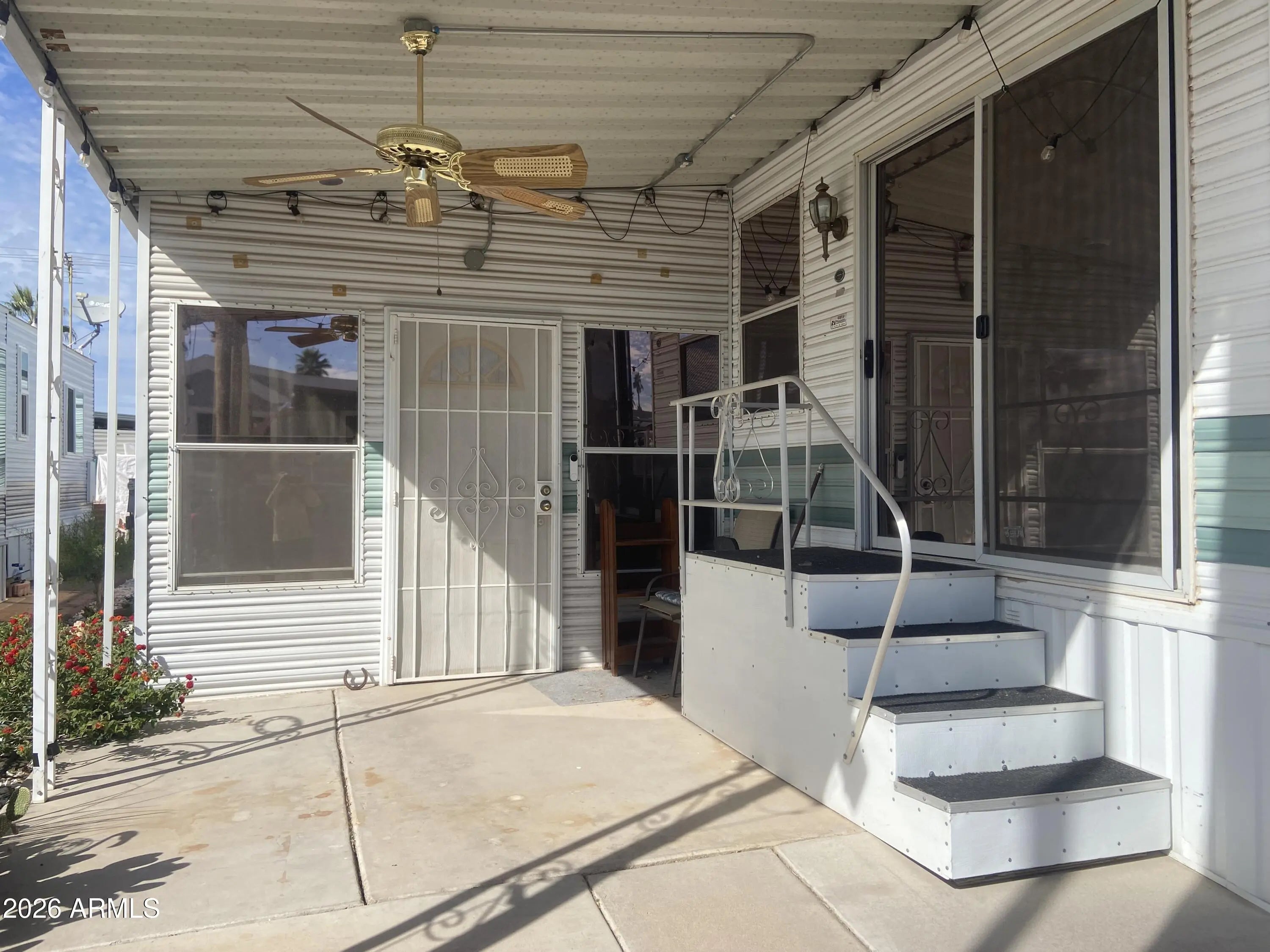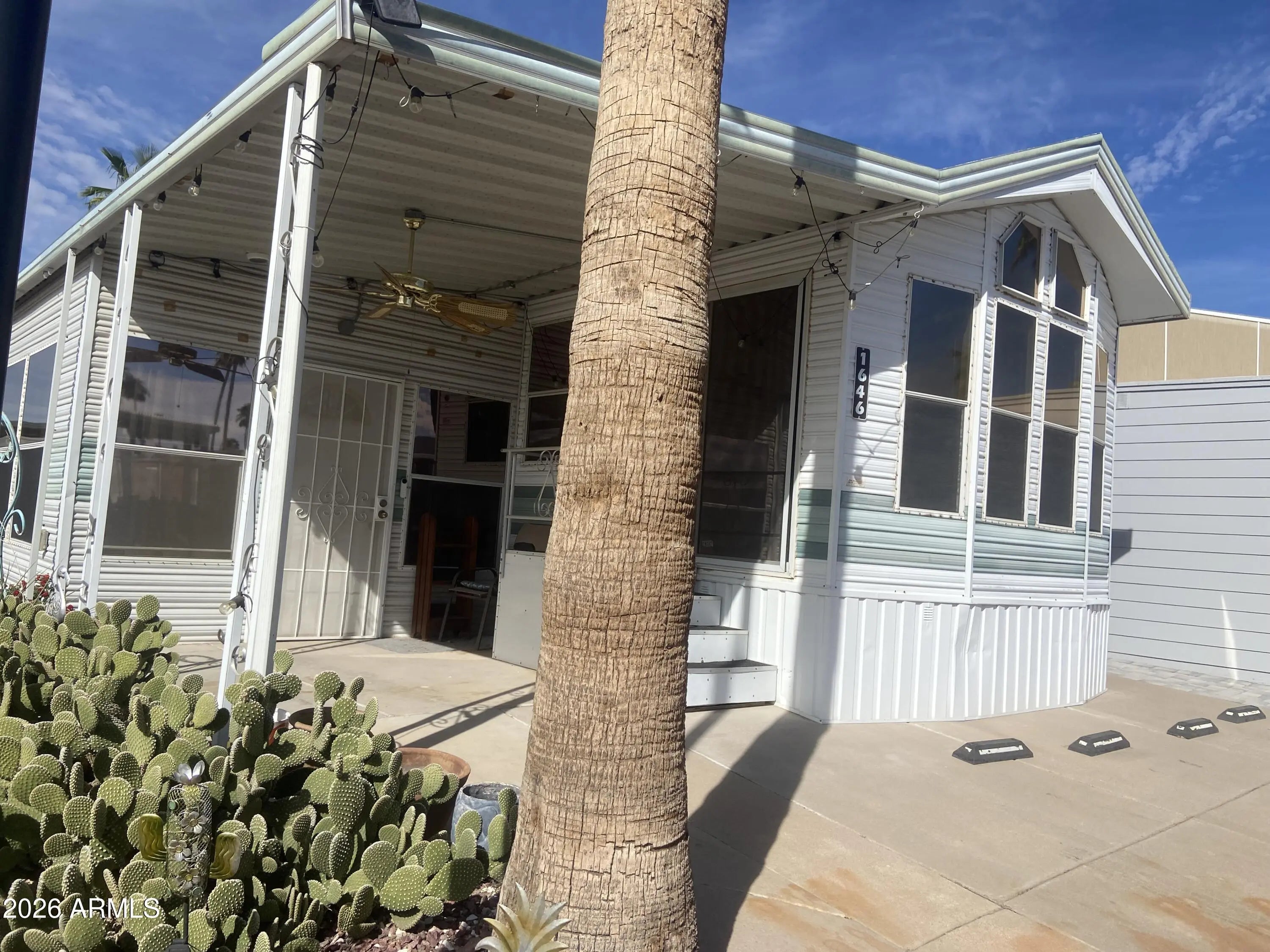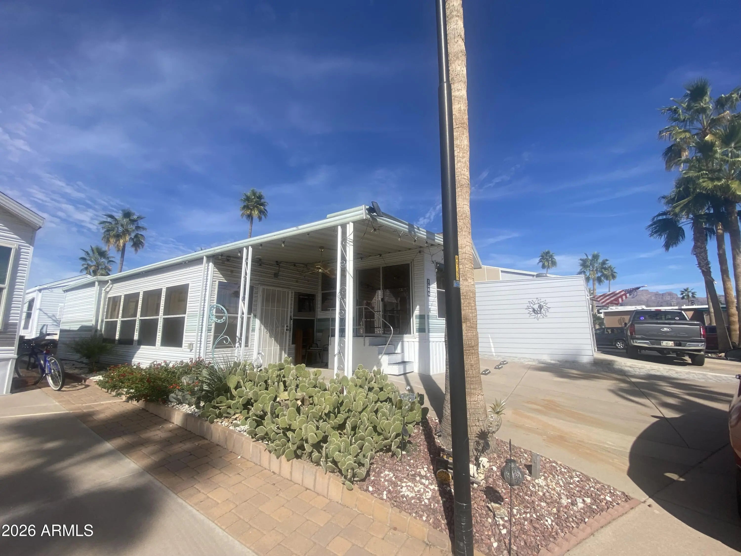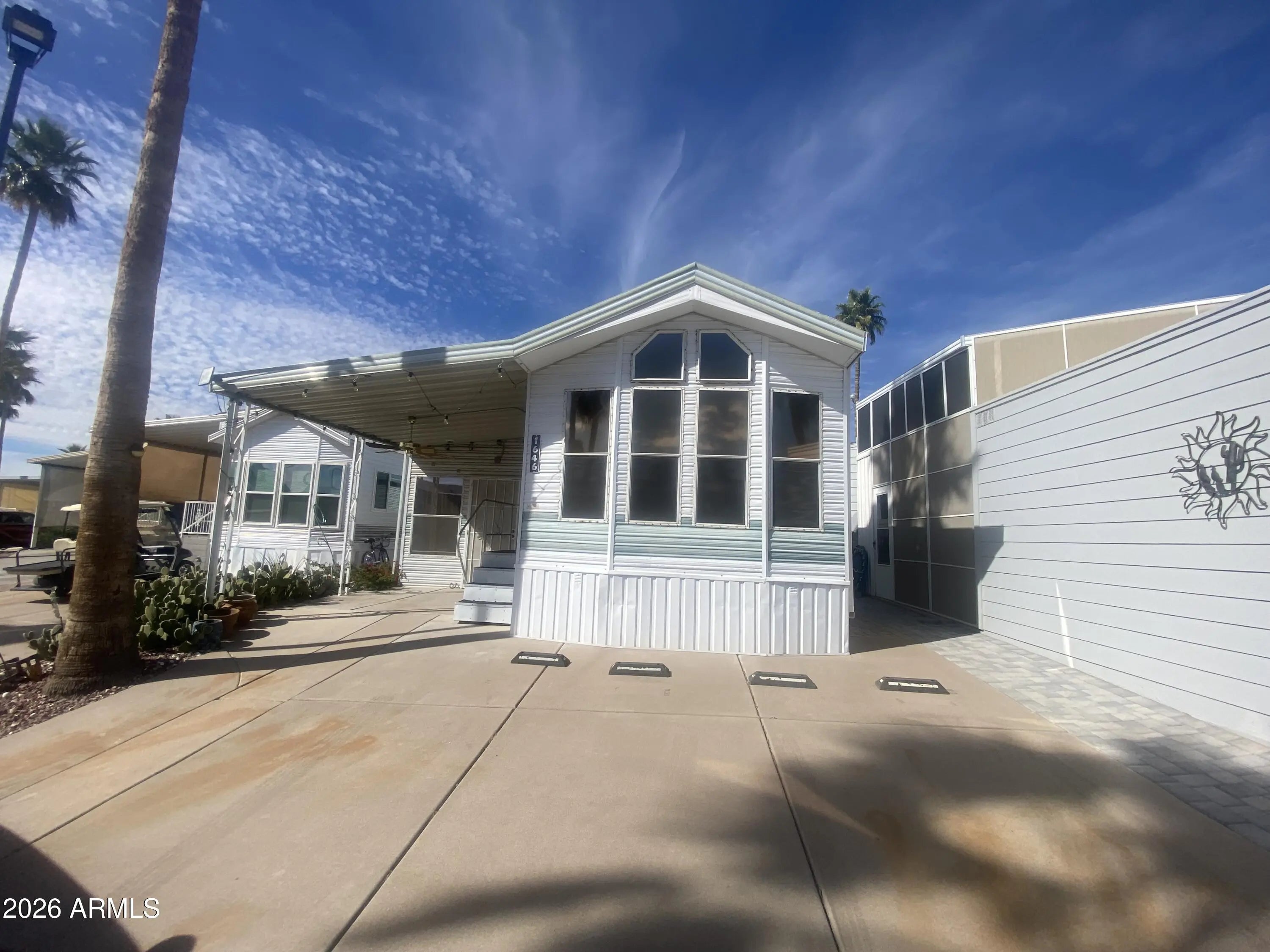 Own the land and this 1993 400 sq ft 1 bedroom 1 bath park model in the best 55+ golf course resort in the east valley. Enclosed porch style Arizona room and inside laundry and storage. Covered patio entry and plenty of room to park 2 vehicles PLUS a golf cart! Washer/dryer included and some furnishings. ac/heat was new in 2023. Ready for your remodel and priced right! This resort has multiple pools, spas, on-site restaurant, luscious green golf course 9-hole par 3, endless clubs and entertainment! You will love the youthful vibe in this park! Not your grandma's bingo park for sure! Free Park tours daily.