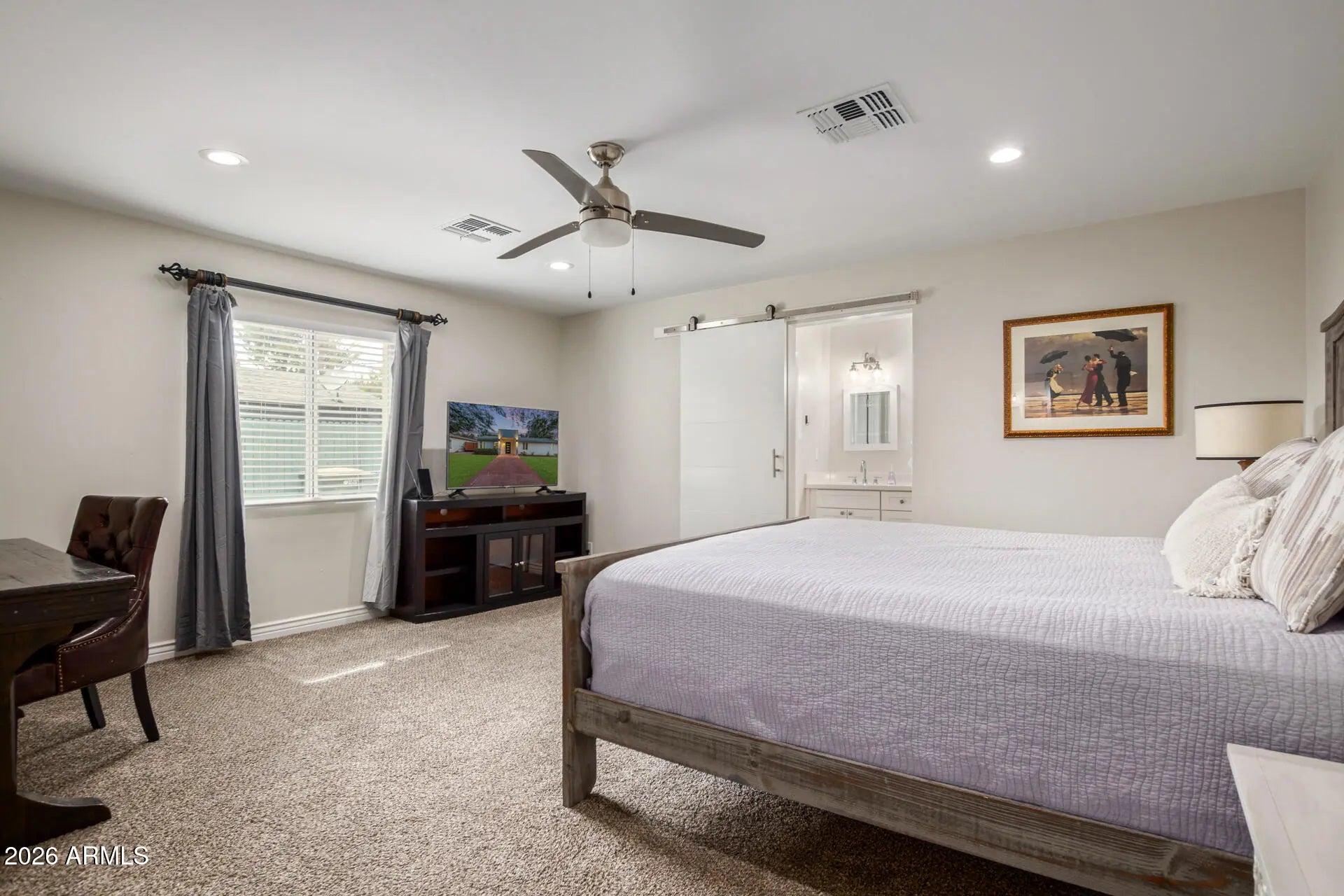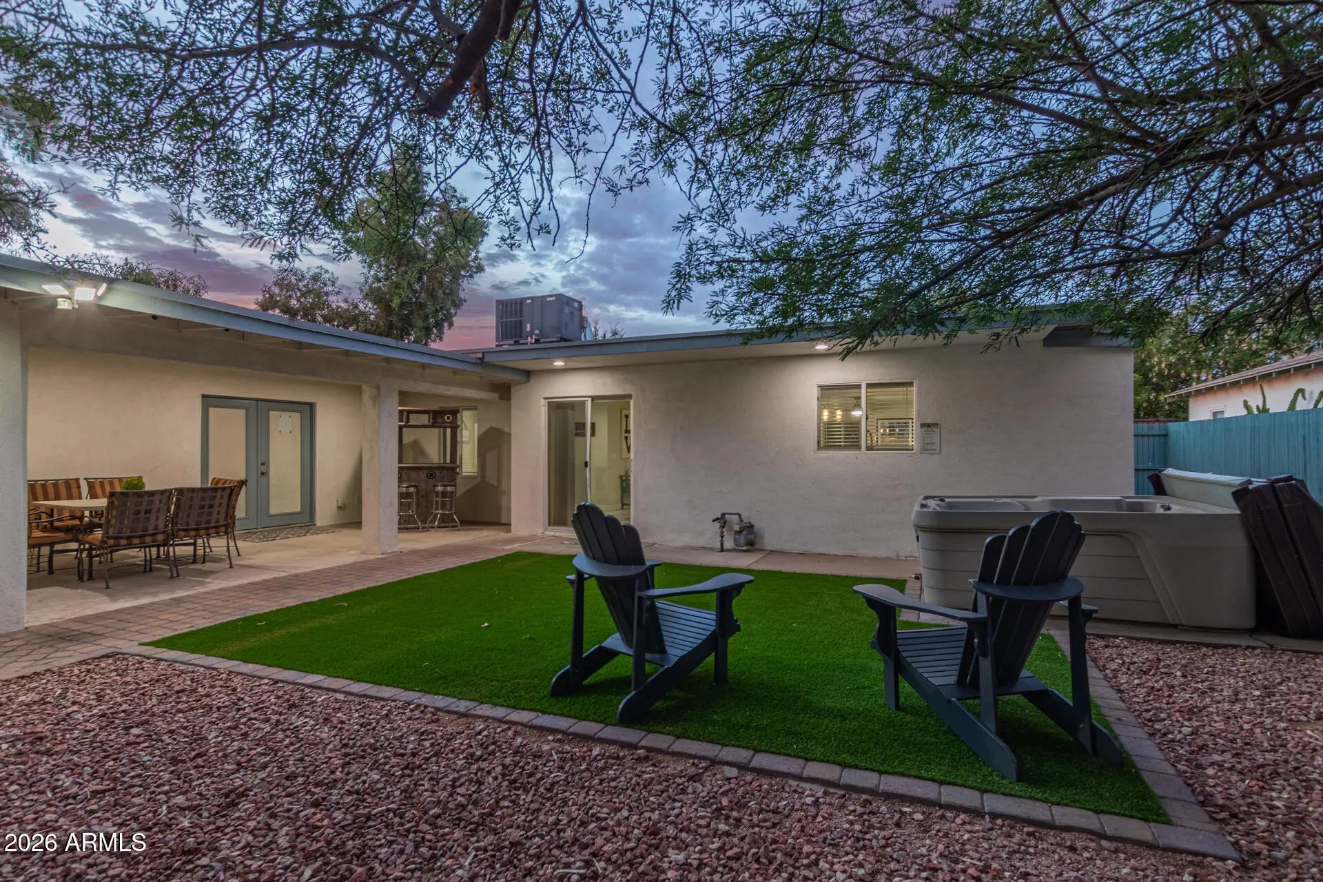 What a GEM! Comfort meets modern elegance in this beautiful home nestled on a large lot. Featuring a manicured landscape w/natural grass & mature trees, it offers a tranquil setting. Discover a desirable open layout paired with chic light fixtures, neutral palette, & tile flooring w/plush carpet in bedrooms. The kitchen boasts SS appliances, quartz counters, subway tile backsplash, white shaker cabinets, and an island w/breakfast bar. Two main bedrooms! One includes French doors to the back, and both feature a barn door that opens to the en-suite with dual sinks & a walk-in closet. You'll LOVE the peaceful backyard! A covered patio, artificial turf, elevated paver patio, & a hot tub complete the picture. PLUS! This value has a 2-car garage & 2 RV gates on both sides of the house. Just