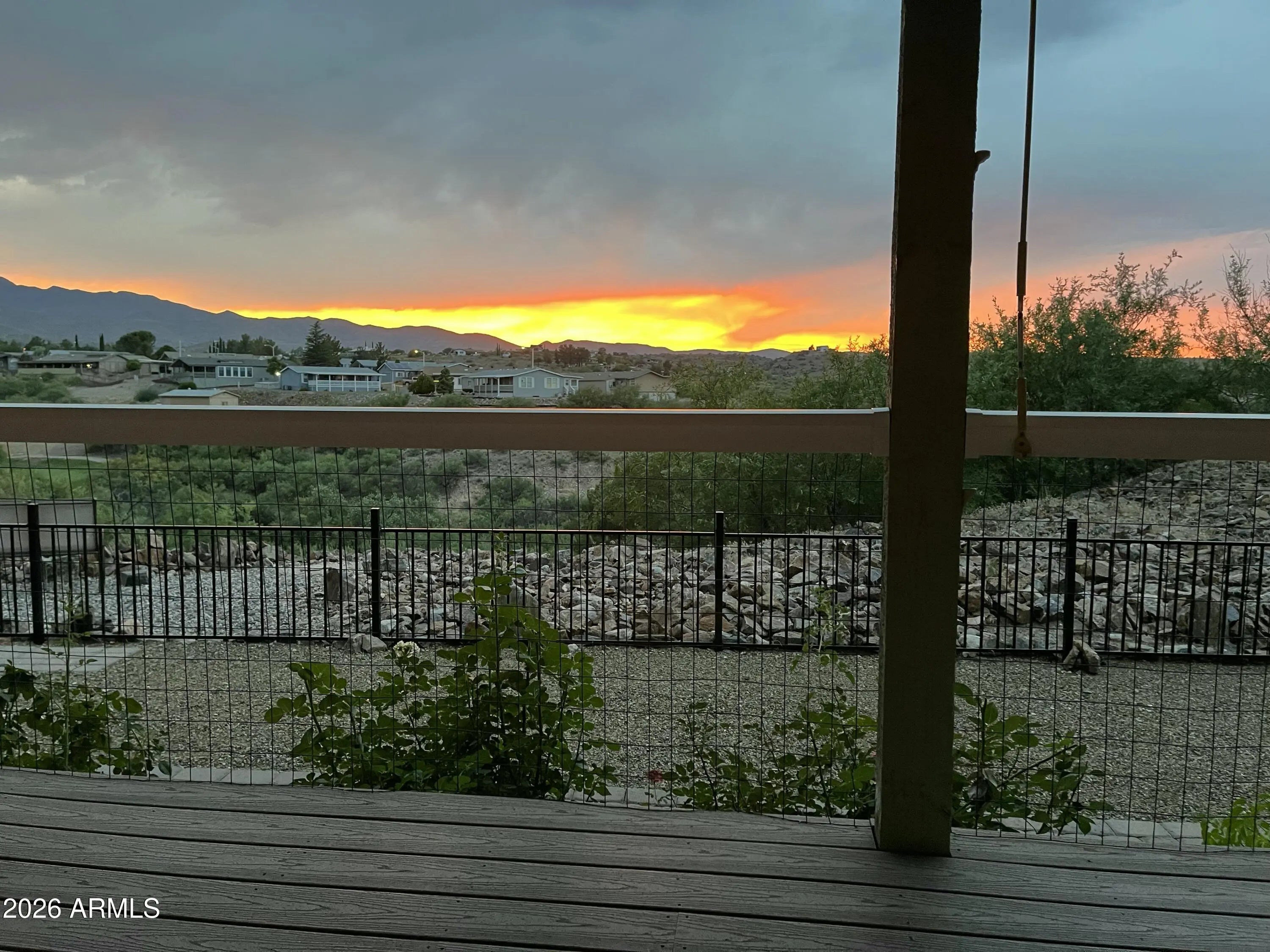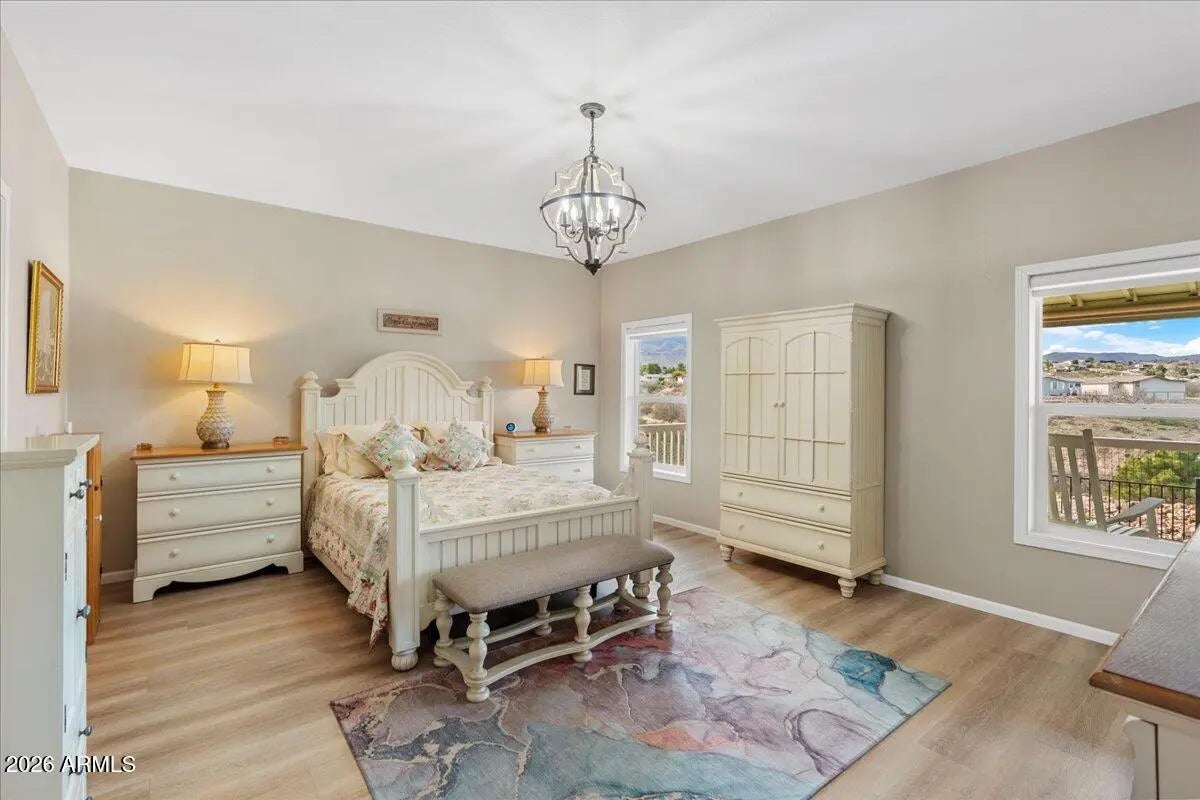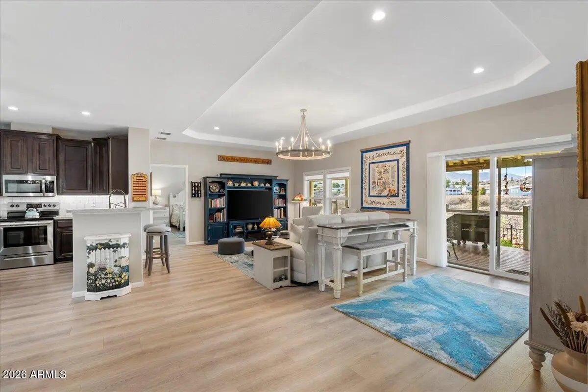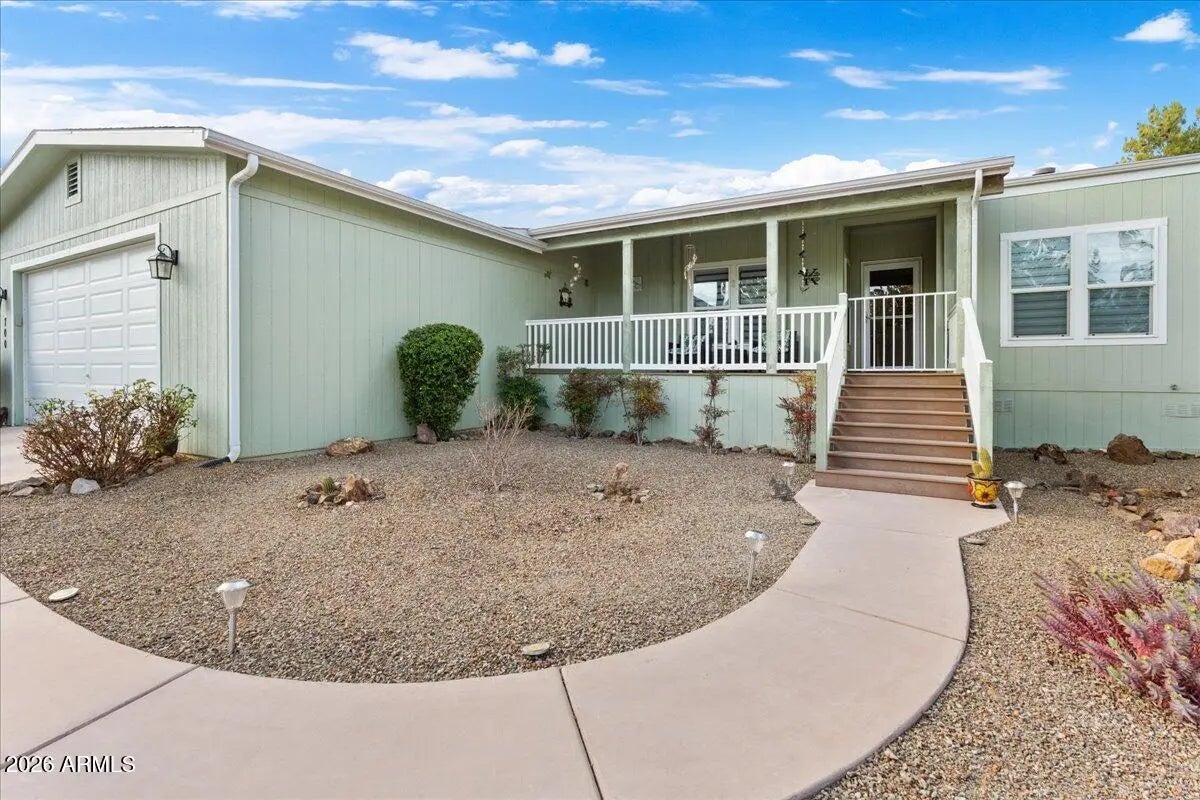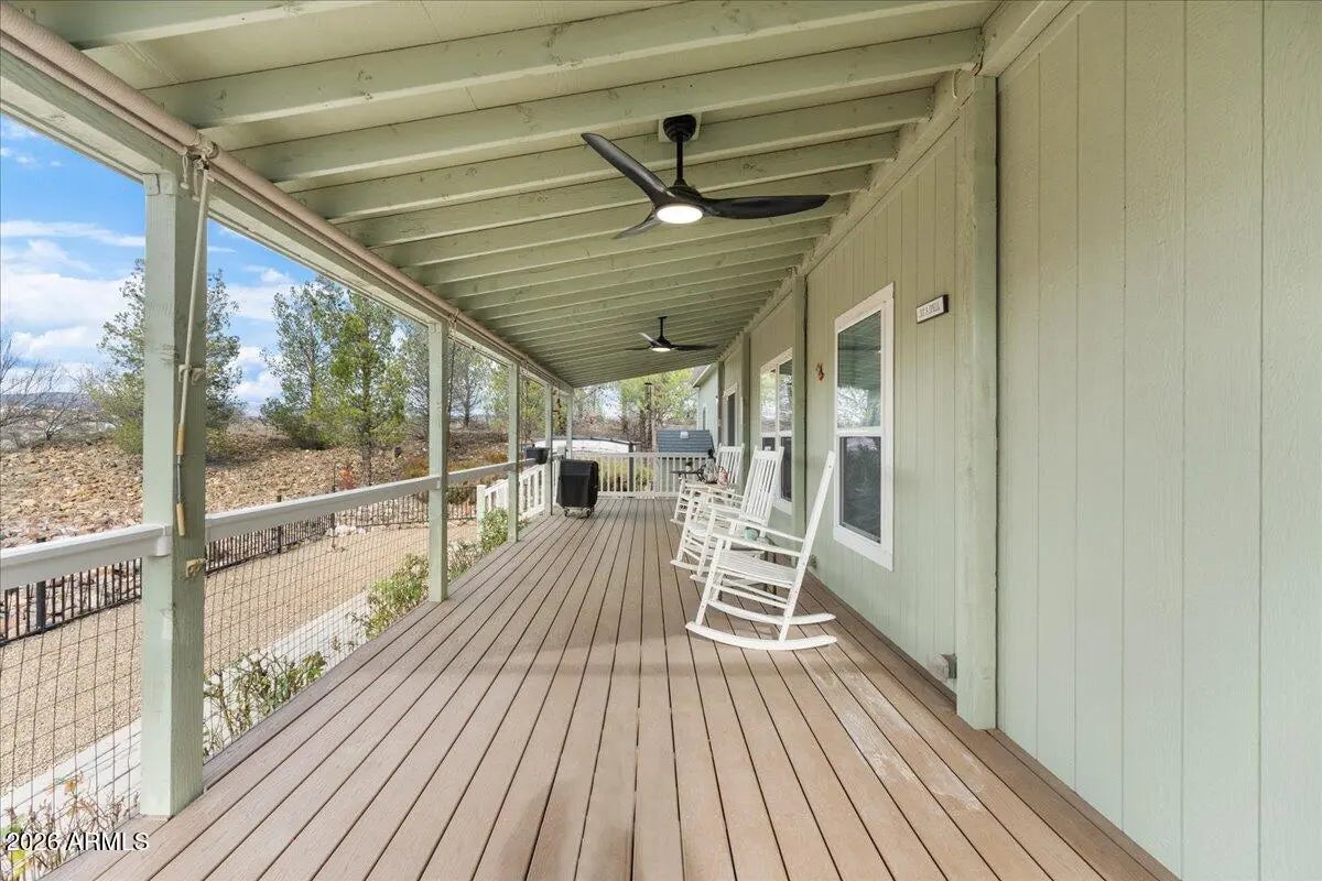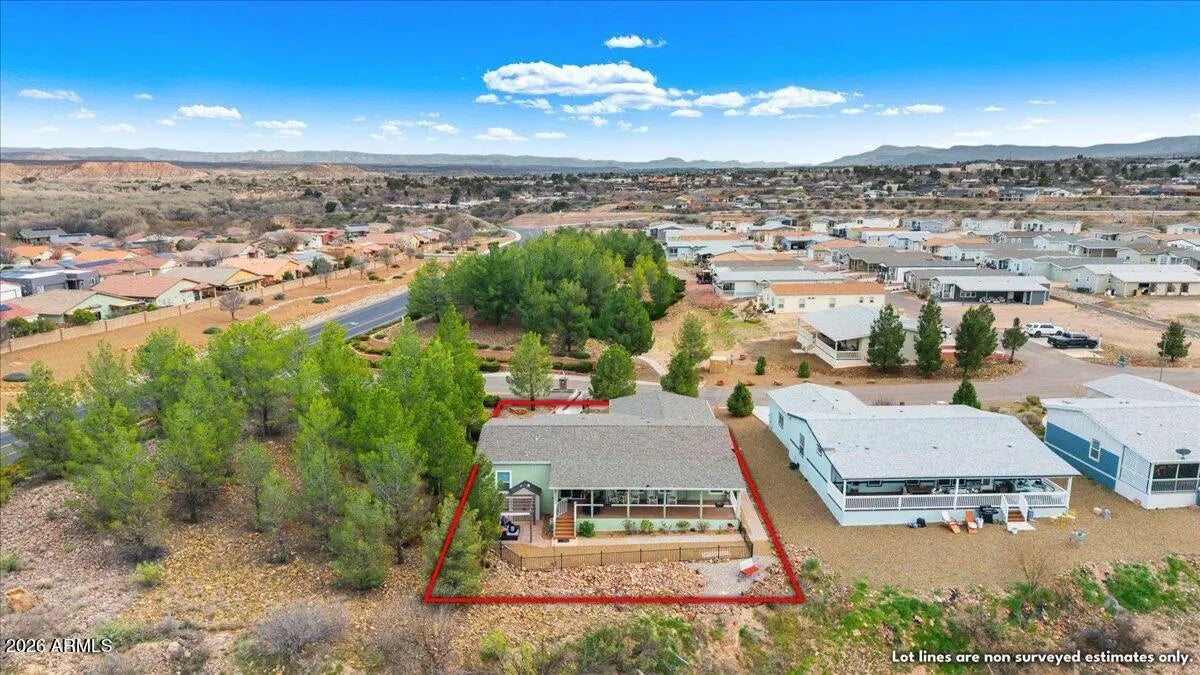 PRICE REDUCED! Elevated Luxury in a Premiere 55+ Community! Perched high above the lush fairways of Coyote Trails Golf Course, on one of the largest and most coveted lots in the neighborhood, this exceptional residence captures sweeping mountain vistas and the glittering evening lights of Jerome. A rare blend of elevation, privacy, and refined design--this is luxury golf course living at its finest. Residents enjoy a resort-caliber lifestyle with top-tier amenities including championship golf, yoga and fitness classes, on-site restaurant, indoor heated pools and spa, and a state-of-the-art fitness center--all just moments from your door. Plus, you're within walking distance to some of Arizona's finest dining experiences. Inside, the home has been thoughtfully upgraded from top to bott The extended split floorplan offers 2 bedrooms + den (with pocket door), 2 baths, soaring 9' ceilings, designer paint, luxury wood-plank, vinyl flooring throughout, wood-wrapped windowsills, dual zebra shades, and curated designer lighting. The light-filled great room makes a statement with oversized windows, additional recessed lighting, and a stunning chandelier. A dramatic sliding door opens to the expansive elastomeric deck, creating seamless indoor-outdoor flow for entertaining against a breathtaking golf and mountain backdrop. Chef-Inspired Gourmet Kitchen is a true showpiece designed for both elegance and function: 42" extended, staggered stained maple cabinetry with glass display doors & lighting Coffee Bar + step-in pantry Extensive soft-close drawer banks Thick, gleaming granite countertops Extended entertainer's bar Luminescent white block backsplash with under-cabinet illumination Deep composite farmhouse sink Gold smart-touch pull-out faucet Frigidaire stainless appliance suite Reverse osmosis system Custom pendant lighting on dimmers Bay dining area framed by expansive windows Owner's Retreat - Spa-Level Comfort The generously sized primary suite features oversized windows with mountain views, a custom chandelier, and a boutique-style walk-in closet with built-ins and shoe caddies. The spa-inspired primary bath offers: Executive-height Corian dual vanities Backlit mirrors Extra drawer storage & linen closet Easy care, walk-in shower with oversized glass barn-door slider Rain shower head, hand wand, bench seating & grab bars The guest bath mirrors the same elevated quality with a walk-in shower, bench, and rain shower head. New faucets and fixtures throughout enhance the home's polished finish. Elevated Functionality Spacious laundry suite with extended cabinetry, hanging rods & pocket door Brand new LG washer & dryer 2.5-car garage with insulated 8' doors Keyless entry + side service door Garage sink with pull faucet Extensive garage cabinetry Whole-house water softener & purification system Resort-Caliber Outdoor Living Expansive elastomeric deck overlooking the fairway Private pergola-covered patio Roll-down patio blinds Rose garden on drip irrigation Extended paver walkways View fencing Charming backyard shed This is more than a home, it is an elevated, lock-and-leave luxury lifestyle within a vibrant 55+ community offering premier amenities, walkability, and unmatched golf course positioning.