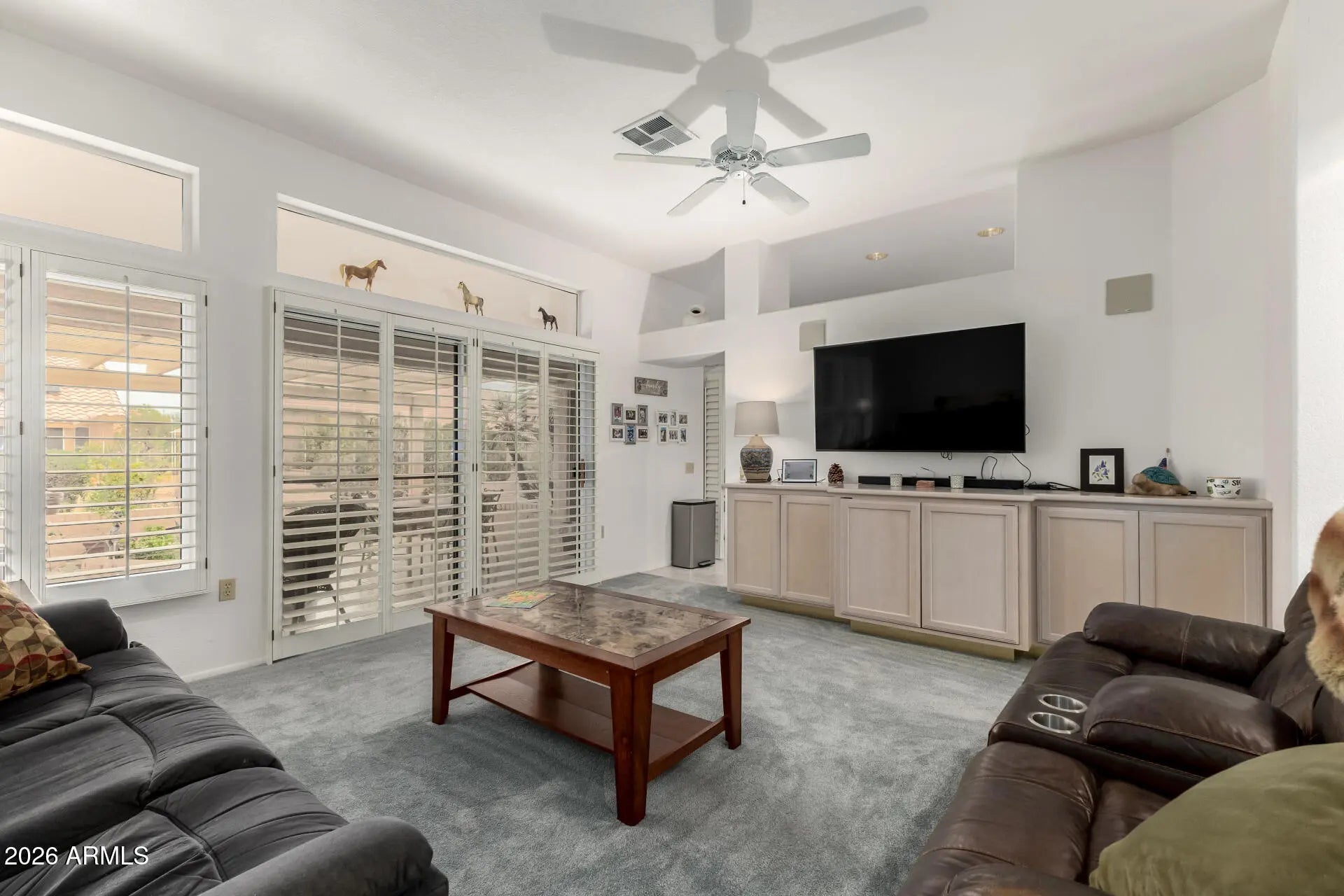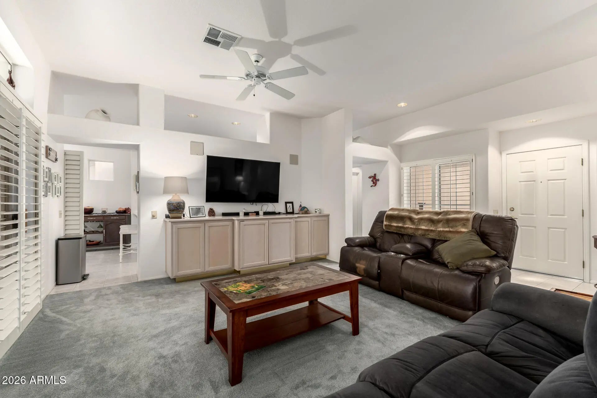 Discover this lovely 2-bedroom home in the sought-after Sun City West! Great curb appeal, featuring a mature landscape and a 2-car garage with attached cabinetry. Inside, you'll find sizable living spaces with tile flooring, carpet in select areas, soaring vaulted ceilings for an airy feel, plantation shutters, plenty of natural light, and a soothing palette that makes you want to stay. The well-appointed kitchen displays ample cabinetry, tile backsplash, a spacious peninsula with a breakfast bar, and built-in appliances for a seamless cooking experience. The main bedroom offers a closet, a bathroom with dual sinks, and a private exit for added convenience. Out back, you can enjoy your morning brew under the cozy covered patio and spend peaceful evenings. Hurry up, this gem won't last!