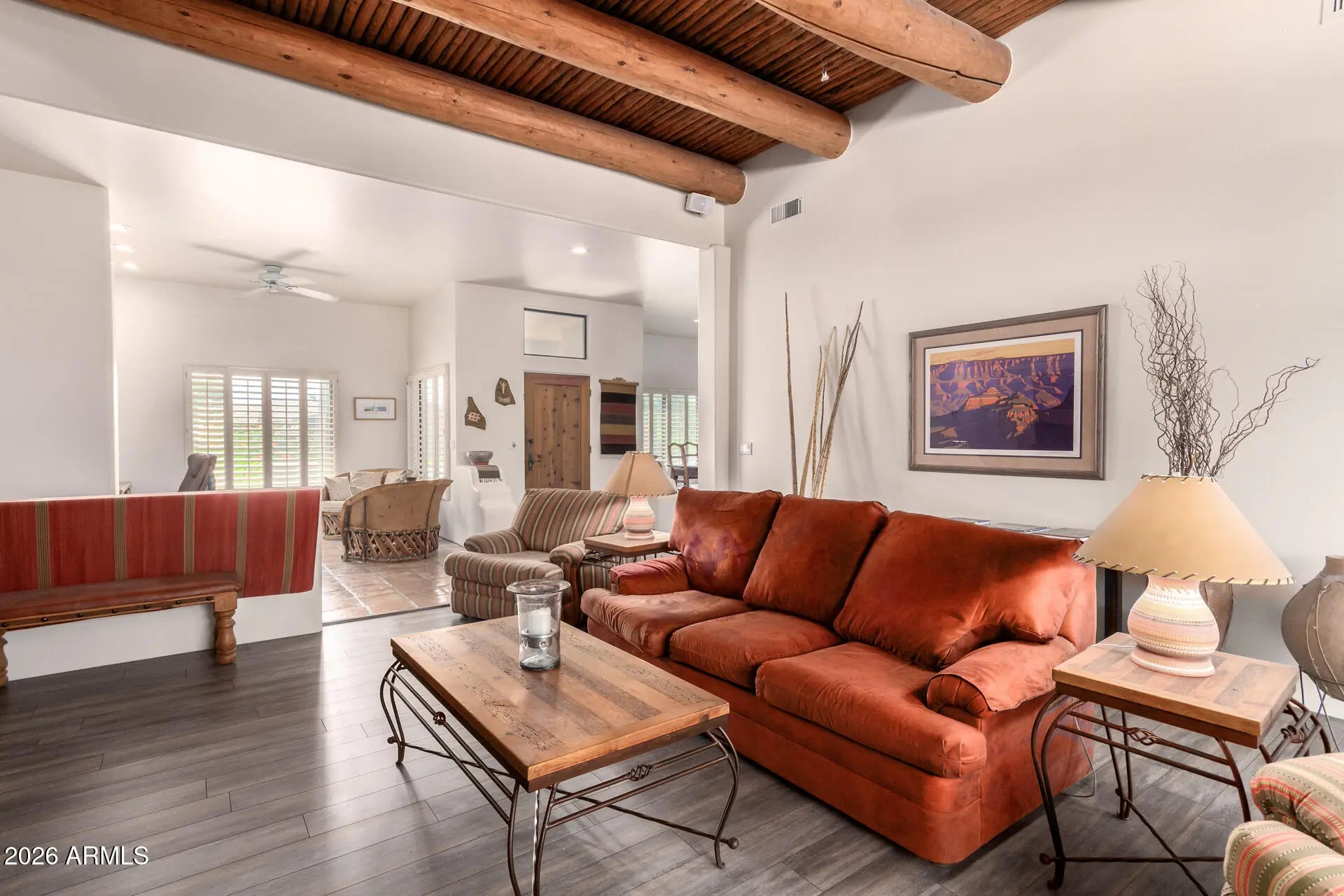 This stunning 3 bed, 2.5 bath home sits on a massive corner lot, adjacent to Crossed Arrows Park. With a split floor plan, and 12-ft ceilings, this home has the perfect combination of style and functionality. The backyard enhances the property, featuring a custom pool w/ Saltillo tile texturing, a built-in BBQ, and an enormous covered patio. Inside you'll find beautiful Saltillo tile through most of the home, with new wood laminate flooring in the living space and bedrooms. Regular maintenance and upkeep performed includes both HVAC systems regularly serviced, a new irrigation drip system, pool & equipment service, and entire exterior home painted. If you're looking for a Southwest vibe in the heart of Scottsdale, then look no further.
