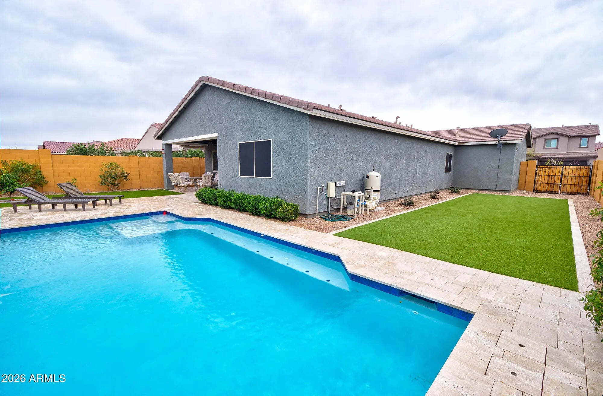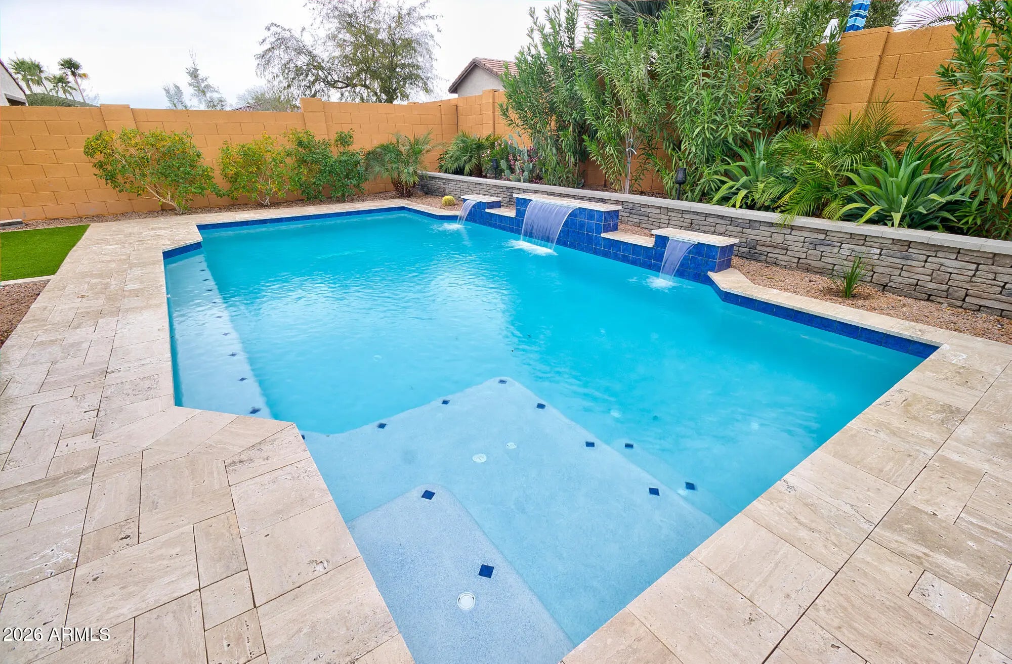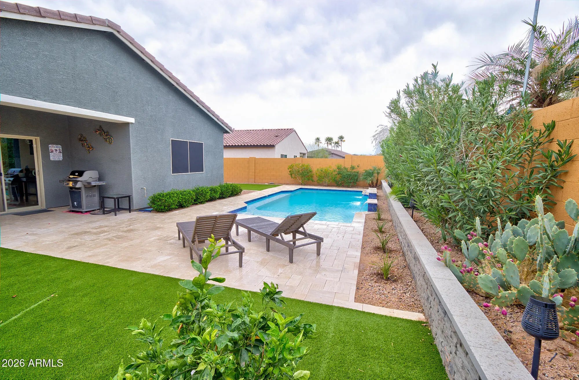 Immaculate 4-bedroom, 2-bath, 3-car garage home with a resort-inspired backyard in the desirable McCartney Ranch subdivision! You'll love it the minute you walk through the front door. The kitchen offers a modern design with granite countertops, espresso-tone cabinetry, stainless steel appliances, and a spacious island that provides additional seating and prep space. The open layout flows seamlessly into the living areas, making it perfect for family gatherings. The private backyard oasis features a custom sparkling pool with elegant water features, expansive travertine paver decking, and multiple lounging areas. The low-maintenance design includes artificial turf, raised planter beds with a mix of desert and lush landscaping, and a covered patio ideal for outdoor dining & entertaining.