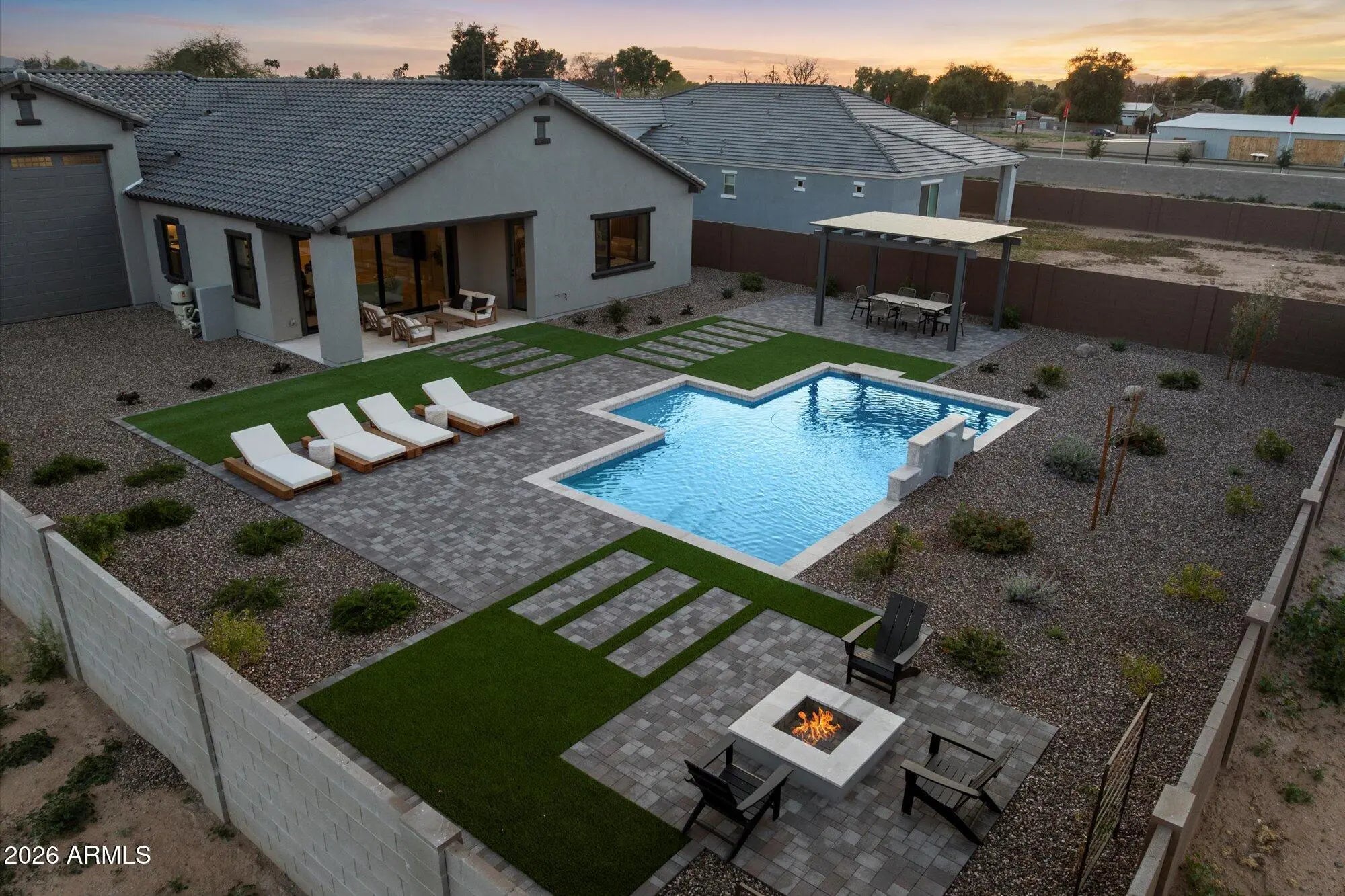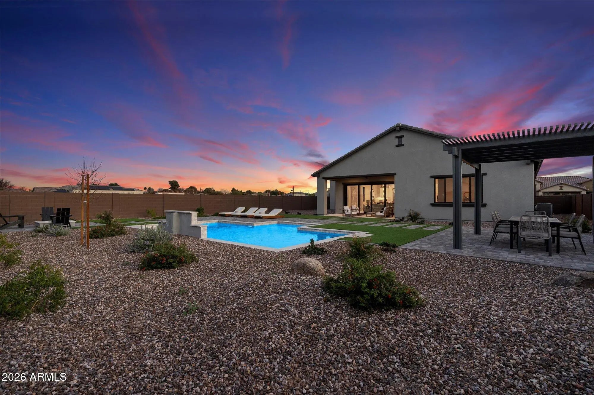 Discover Modern Luxury Living with RV Garages in the Gated all Single Level Community of Acoma Estates by Lantana Homes, where luxury is redefined with high-end finishes at an exceptional value. Designed for today's lifestyle, this open-concept floorplan creates a seamless flow between the kitchen, dining area, and family room--perfect for entertaining or comfortable everyday living. A private den/office adds flexibility for working from home, studying, or creating a quiet retreat. A standout feature of this home is the impressive 46-foot RV garage--a rare find offering exceptional space for recreational vehicles, boats, additional cars, storage, or even a workshop. Step outside to your own backyard oasis featuring a sparkling pool, expansive covered patio, and a cozy fire pit ideal for year-round relaxation and entertaining. Thoughtfully crafted with quality construction and modern charm, this home offers the perfect blend of style, practicality, and secure gated living.