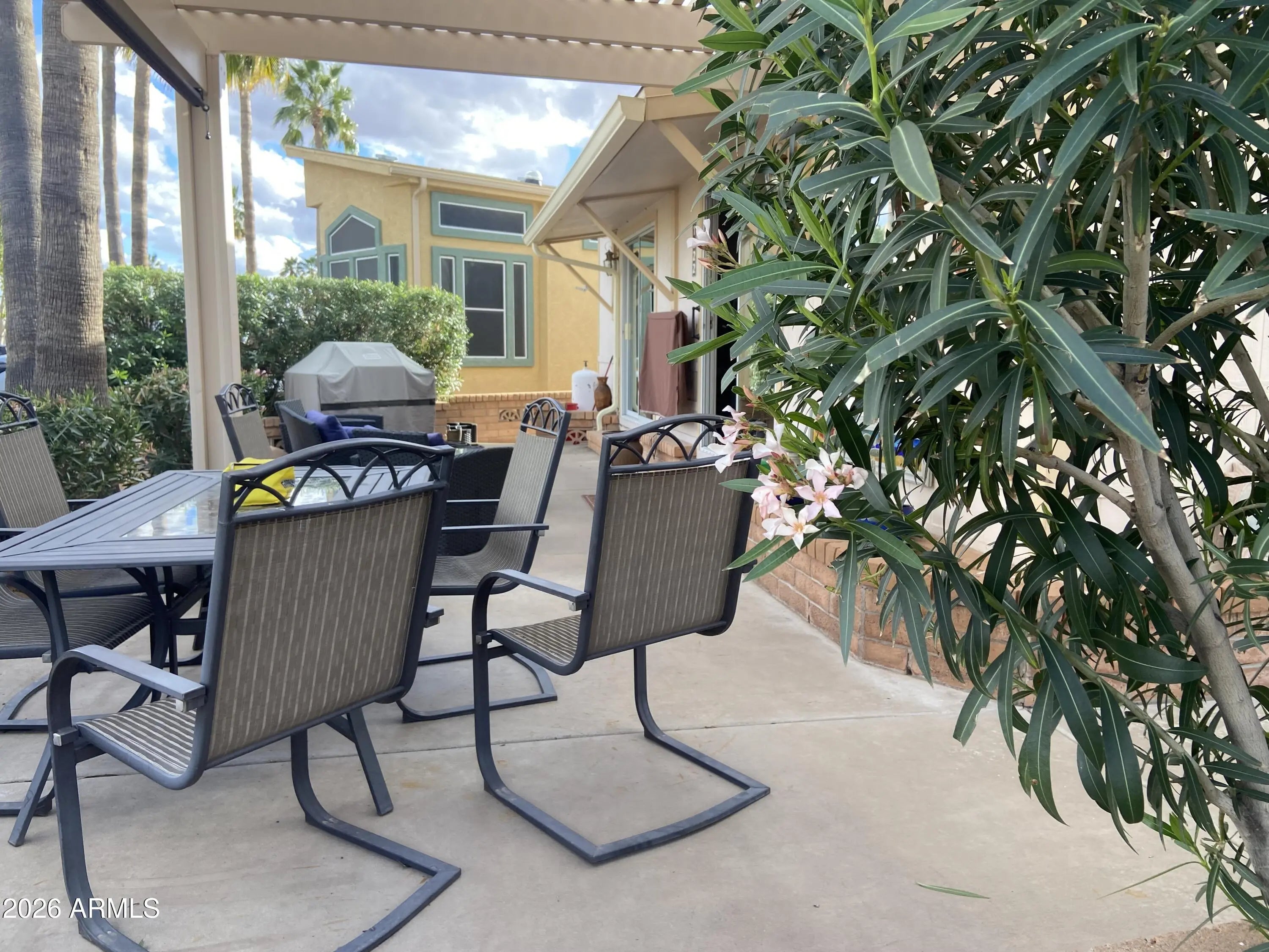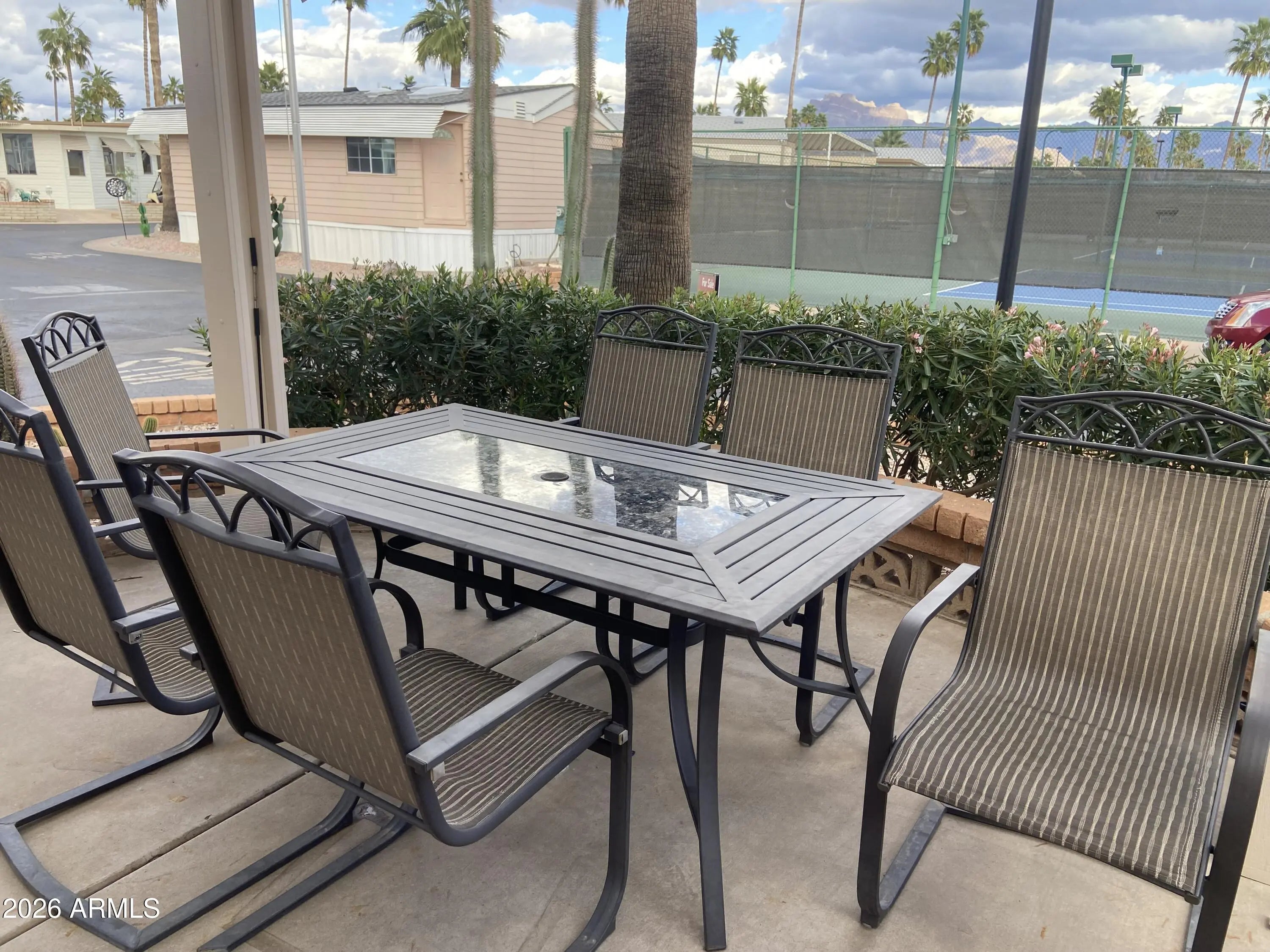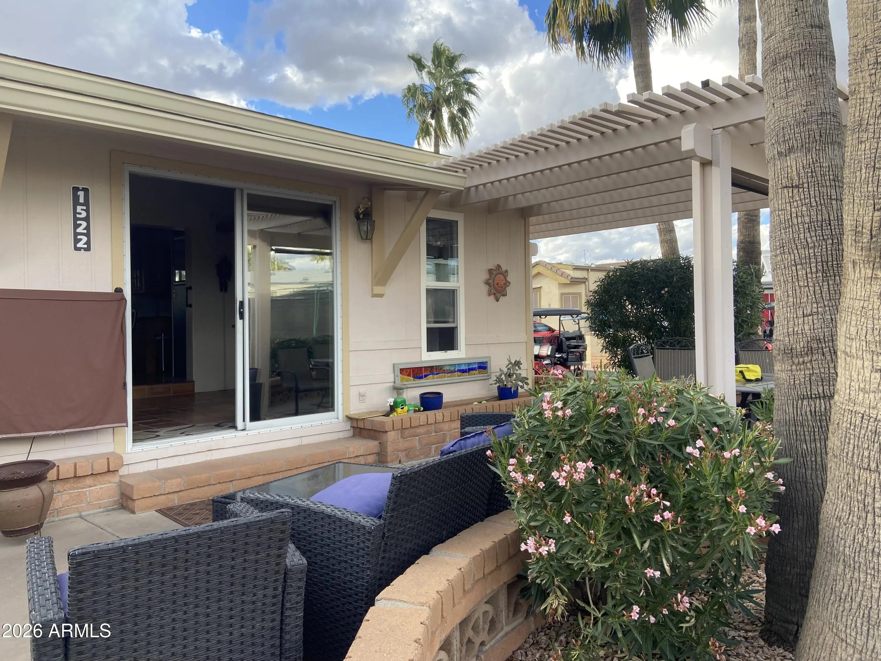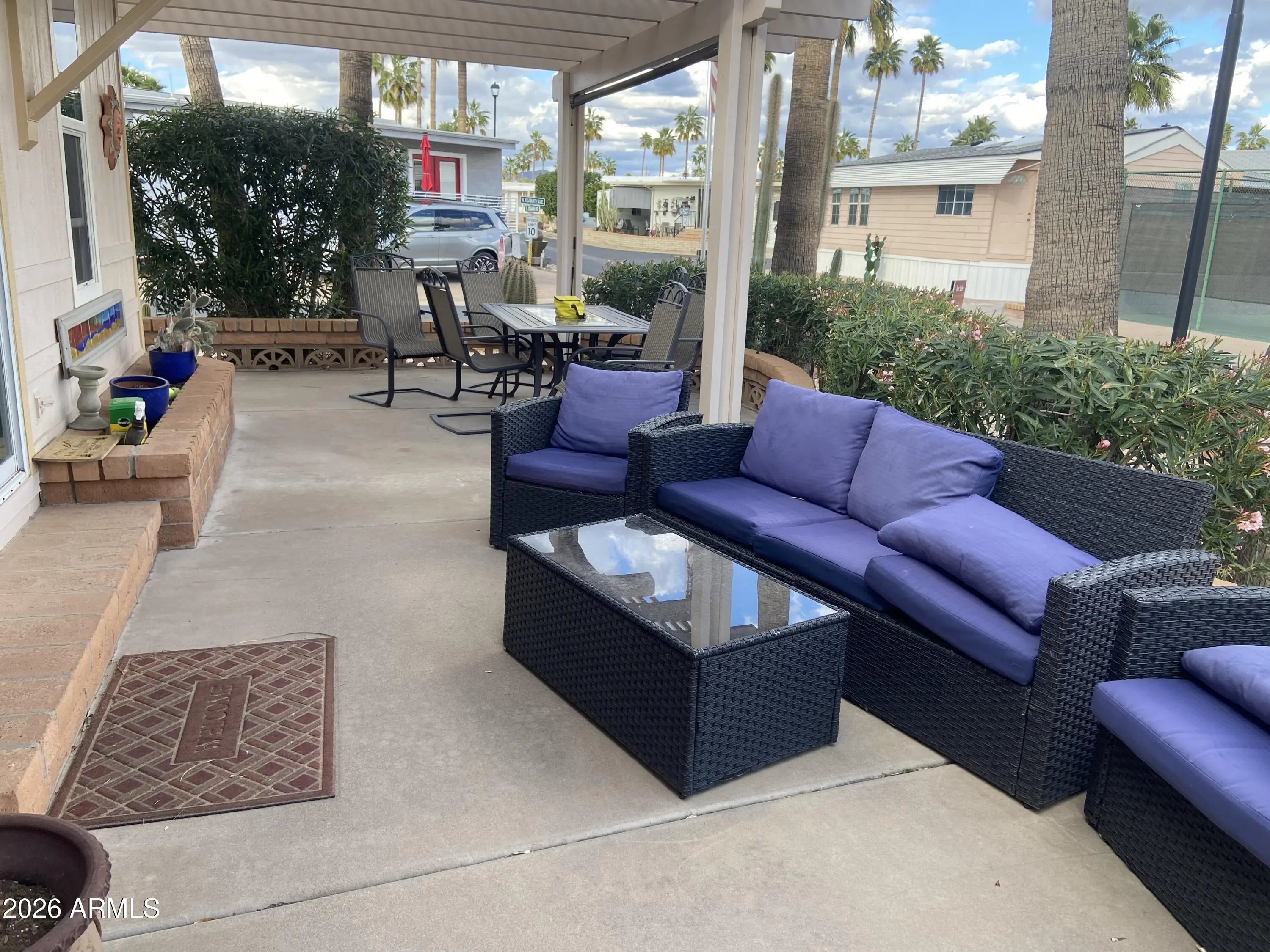 Large Corner Lot! The best patio space imaginable with stylish pergola and outdoor living area complete with television and relaxing outdoor furniture to enjoy the Superstition Mtn Views or entertain friends and family. The inside is just as impressive! Large Arizona addition with propane fireplace, Saltillo floors freshly cleaned and sealed giving this winter retreat the flavor of old Mexico. Full size front kitchen with lots of counterspace and storage! 1.5 bathrooms and an inside laundry/storage/workroom with access to the back patio. This will truly feel like home the minute you walk in the door! Can be shown on short notice!