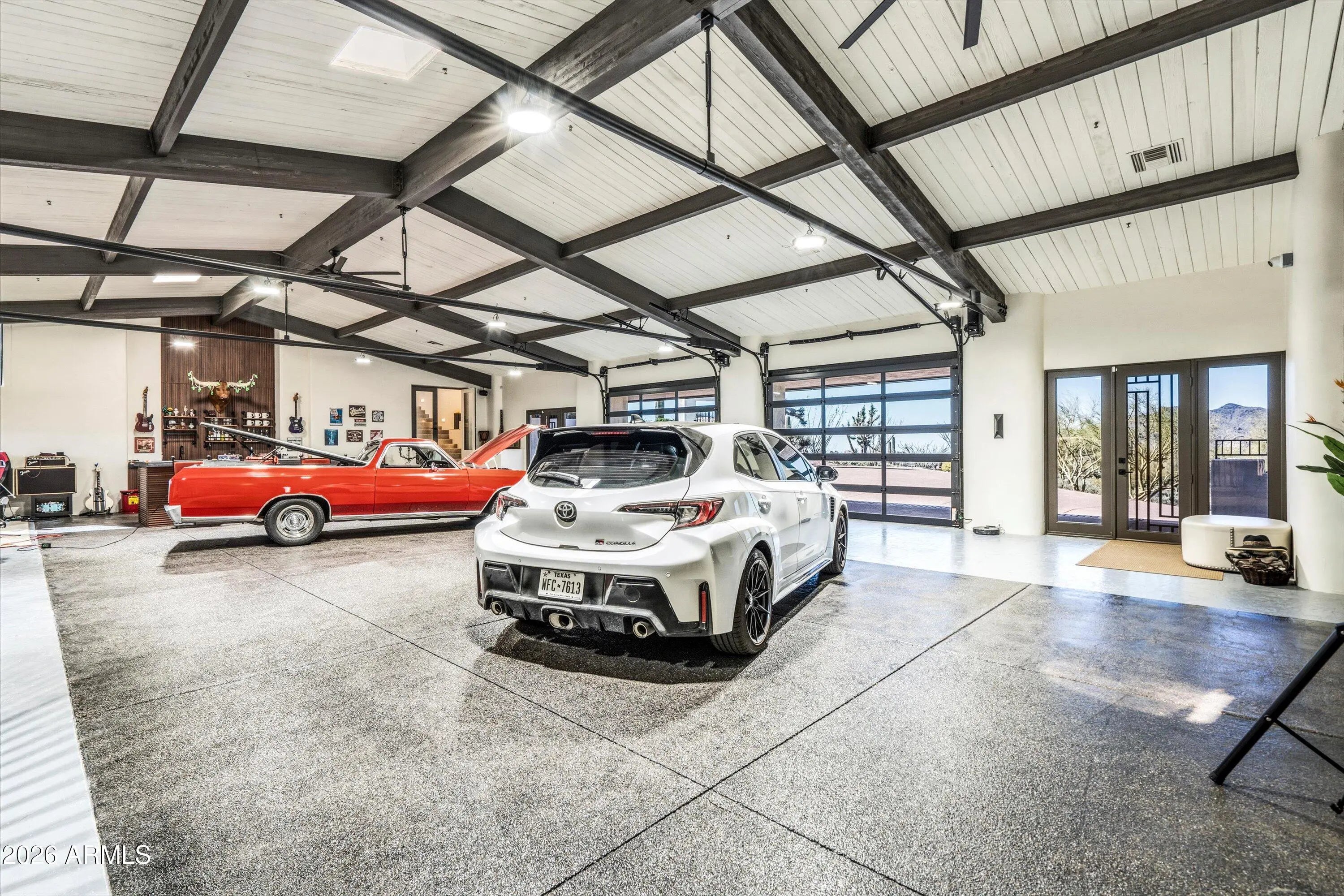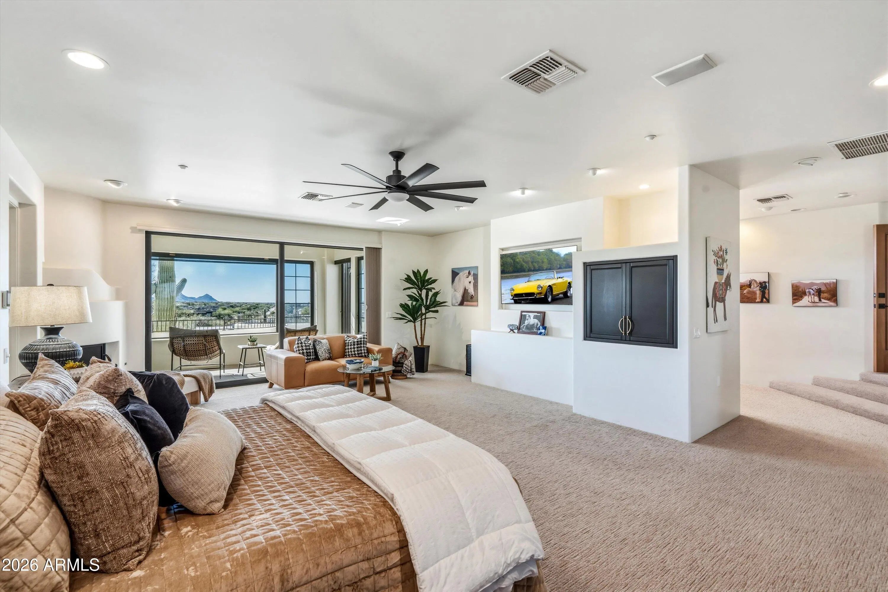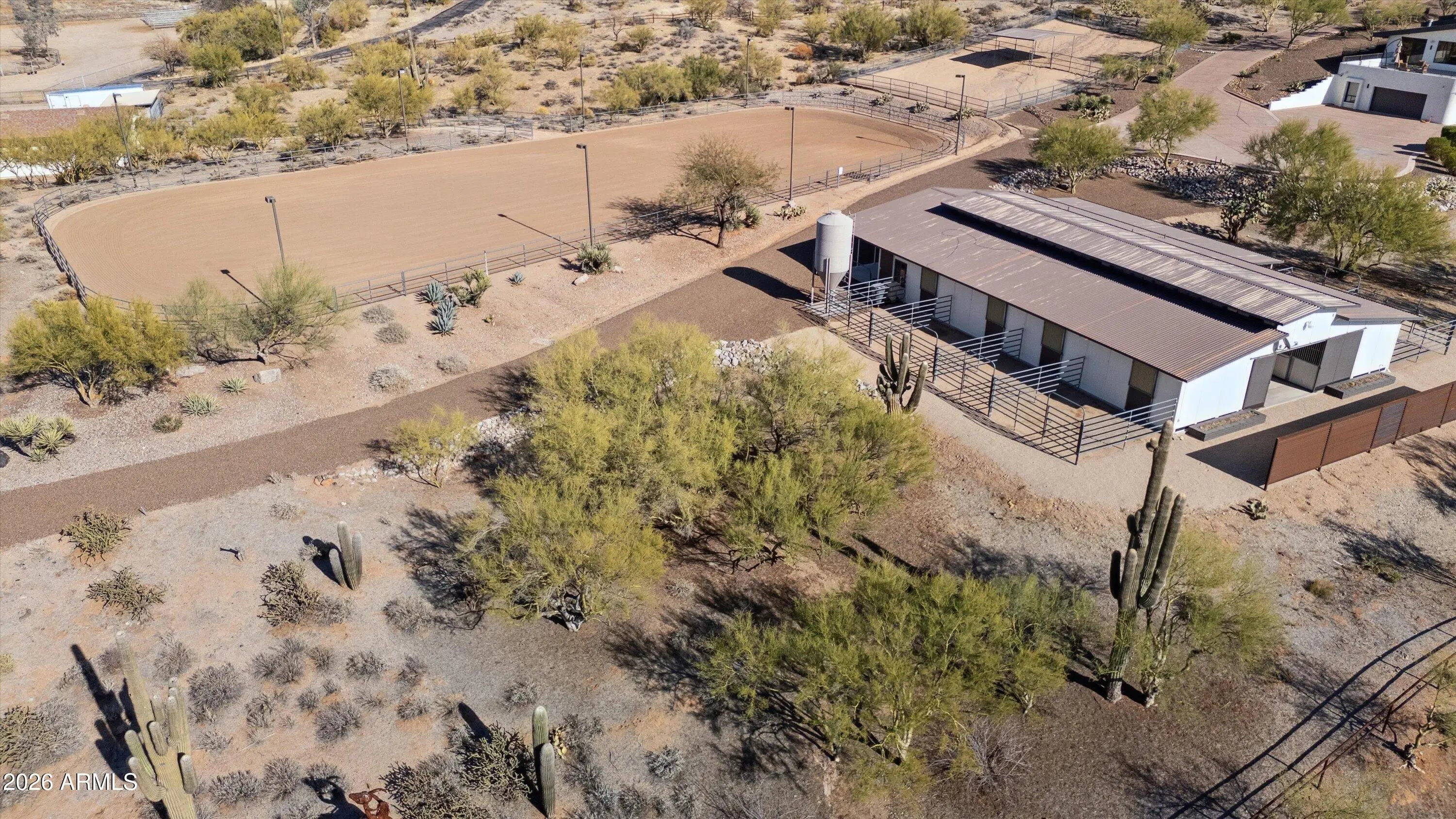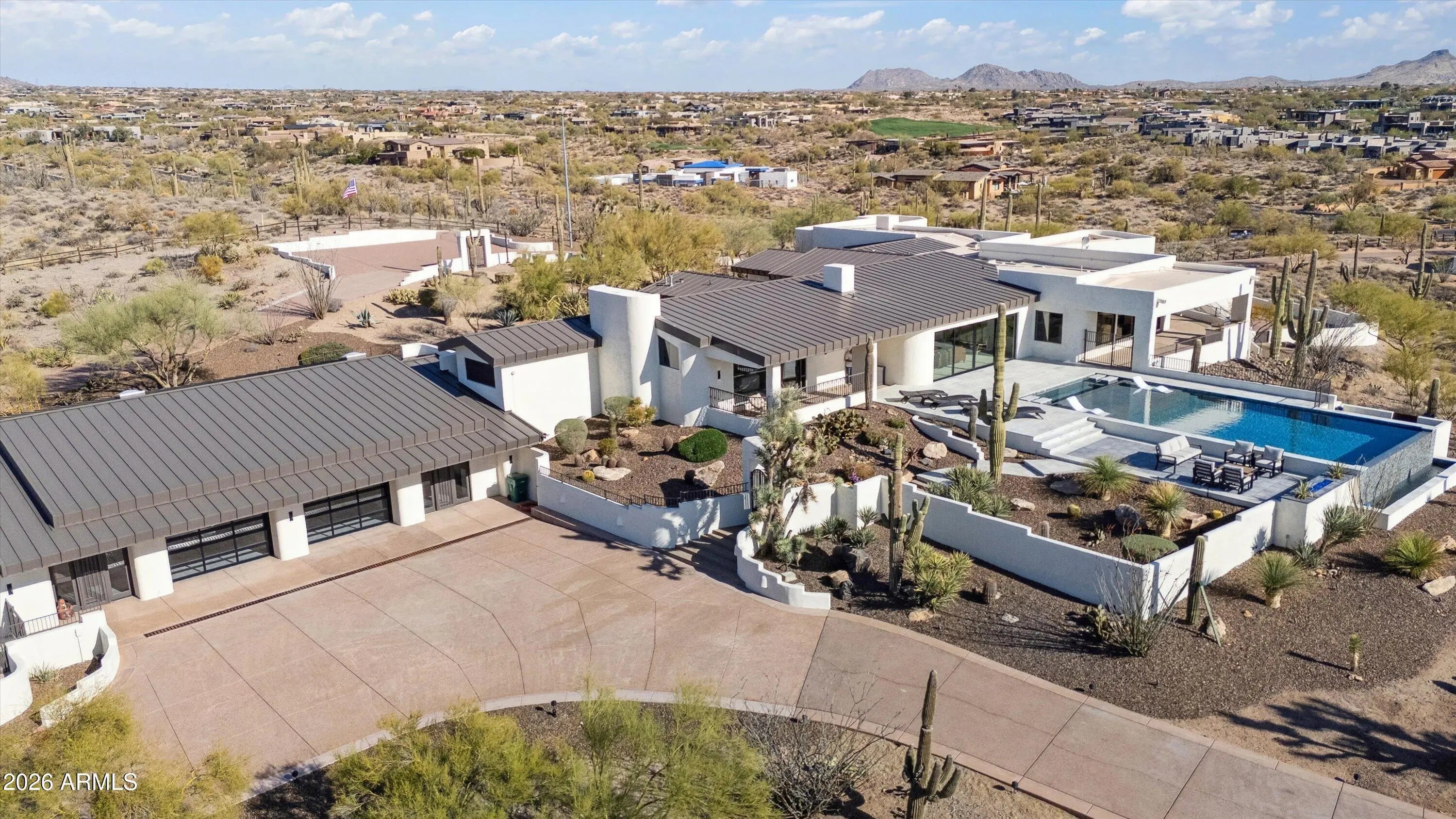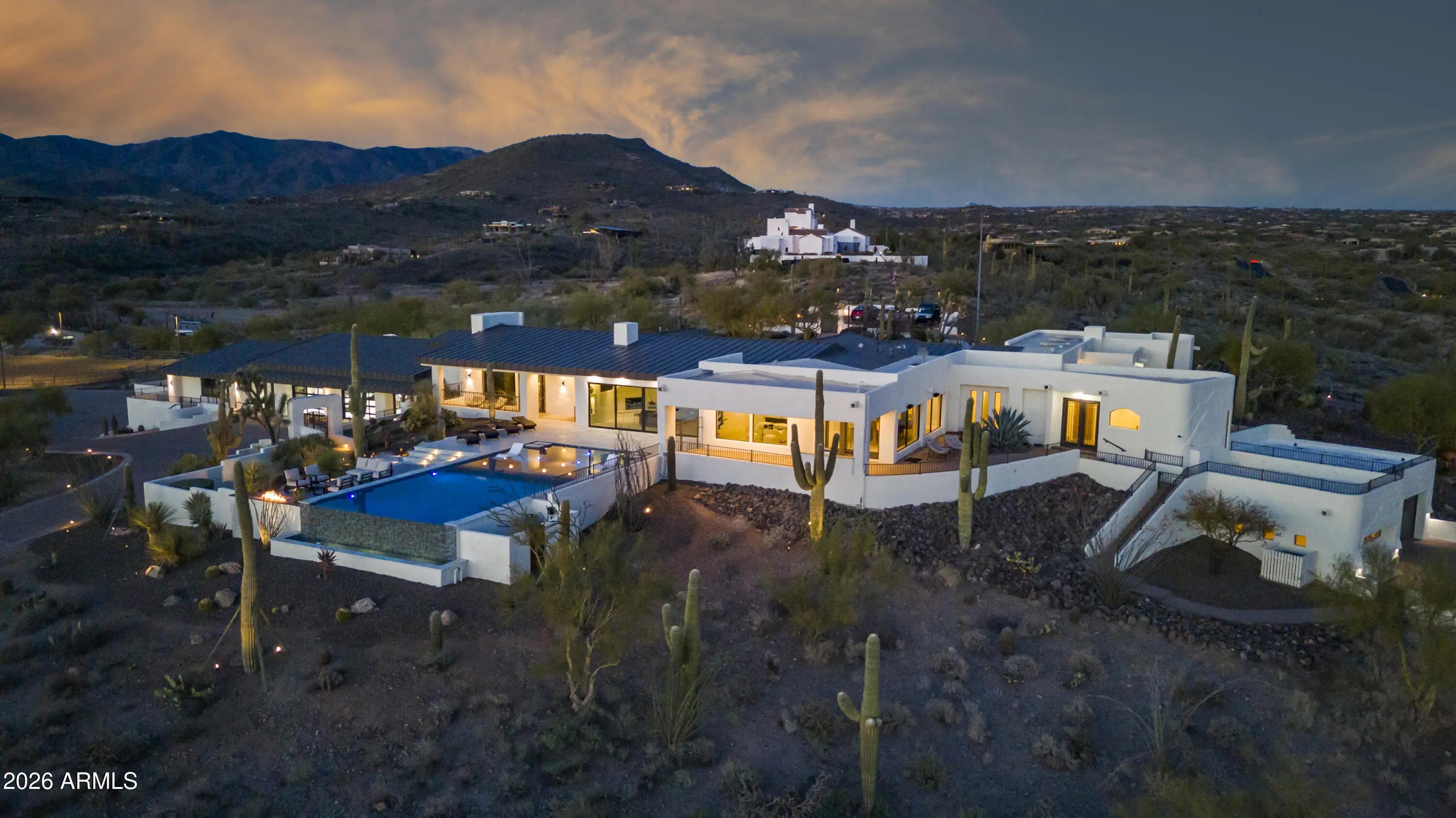 Exceptional 9.8 acre gated ranch estate with three private entrances, ideally positioned at the end of Pima Road in Carefree. Enjoy a rare blend of privacy and convenience with quick access to Scottsdale, the airport, and the small-town charm of Carefree and Cave Creek. The property captures sweeping 360-degree mountain views with stunning sunrises and Arizona sunsets from each window. An rare opportunity combining luxury living, equestrian facilities, and substantial car collector storage in one versatile compound. Resort style living unfolds at the spectacular elevated pool and spa patio, where an infinity edge pool draws your eye toward breathtaking sunsets and twinkling city lights, complemented by inviting firepit seating designed for memorable evenings of entertaining. More..... - 4 Separate Living Areas: Hilltop Main House: 9,392 SF, 3 Bed, 3.5 Bath, kitchen, 2 dining, 2 living Guest House: 3 Bed, 2 Bath, kitchen, living Guest Apartment by Pavilion: 1 Bed, 1 Bath, kitchen, living Barn Bunkhouse: 1 Bed, 1 Bath, kitchen, living, laundry Total Living Space: 11,481 SF - Elevated resort style pool and spa with Baja shelf, fire feature, multiple seating areas - Equestrian amenities: 6 stall barn, feed room, tack room, wash rack, 3 turnouts, 200 x 90 lighted arena - 4,600 SF of garages and shop space with 20+ car capacity, majority climate controlled - Total temperature controlled space: 16,595 SF A rare Arizona ranch estate offering acreage, panoramic mountain views, multi residence flexibility, horse facilities, and large scale climate controlled collector storage, all within convenient reach of city amenities.