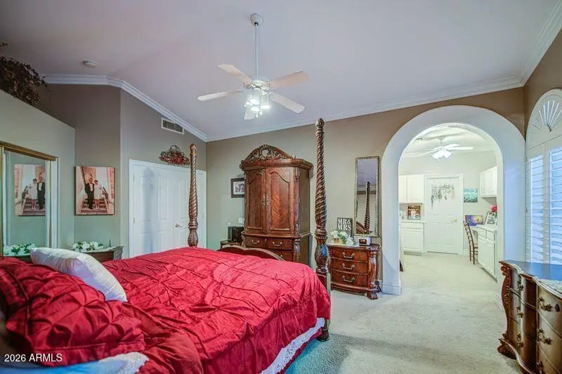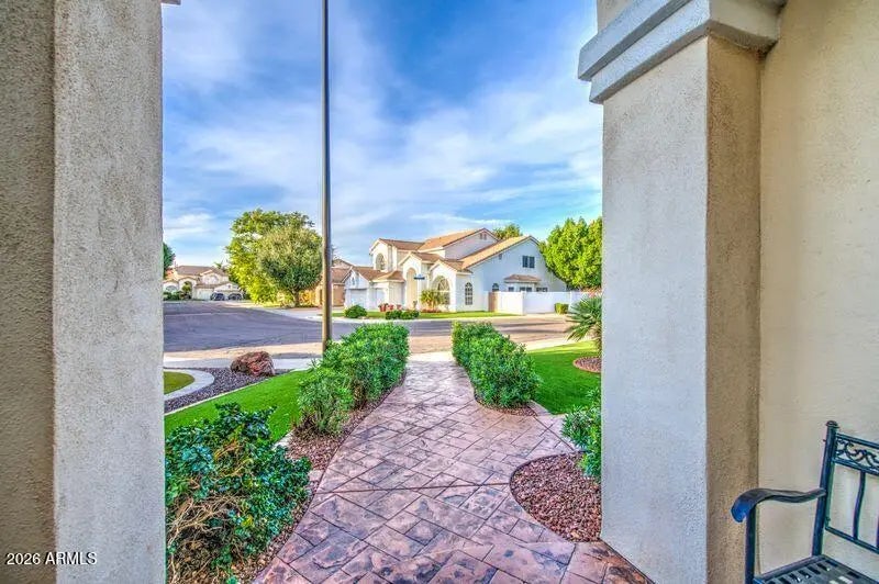 Gorgeous Home with Private 2 Bedroom Guest Suite in Prestigious Val Vista Lakes. Step into refined elegance through Magnificent 8-foot Carved Mahogany Entry Doors and experience the Grandeur of this Exceptional Residence in the highly sought-after Val Vista Lakes Community. Designed with impressive scale and architectural detail, this home features Soaring 10-foot Ceilings throughout, with Dramatic Vaults reaching up to 18 feet in the Foyer, Living Room, Dining Room, Family Room, and Primary Suite. Rich Finishes elevate every space with over $300,000 in Upgrades including 6½-inch Baseboards, Crown Molding, Custom Door Trim, provincial Raised Panel Interior Doors, and Interior Rounded Drywall Corners. Designer Elements such as a Custom Staircase Railing, Plantation Shutters, Wood Blinds, and a highly upgraded Custom Fireplace create a refined yet welcoming atmosphere. Select Walls and Murals showcase Hand-Painted Artwork by professional artist Derek Sokol, adding a distinctive artistic touch. Custom Flooring enhances the Entry, Foyer, Halls, Kitchen, Living Areas, Bathrooms, and Guest Suite. The Large Gourmet Kitchen, beautifully upgraded in 2025 which features Granite Countertops, 30 Solid Wood Cabinets including 42-inch Uppers, New Stainless Steel Appliances, and a Spacious Walk-in Pantry perfect for both everyday living and entertaining. The Luxurious Primary Suite offers a Closet with Mirrored Wardrobe Doors, Two additional Walk-in Closets, and a large Bath beneath Soaring Vaulted Ceilings. Built with quality and efficiency in mind, the home includes 2x6 construction, 200 AMP electrical service with copper wiring, white-framed Dual-Pane Windows, Shade Screens, Solar Lease for low electric bills, Artificial Turf for low water maintenance, and two Brand-New A/C units (August 2024 and September 2025). Dry wells were installed in the back yard to prevent flooding during heavy rains. They each hold at least 165 gallons of water. Private 2 Bedroom Guest Suite with a Separate Entrance is ideal for multi-generational living or extended guests. The Guest Suite includes: 2 Bedrooms 1 Bathroom Kitchen area with 42-inch Custom Cabinetry and Granite Countertops plus Stainless Steel Appliances. Great Room Mudroom with Granite Countertops and additional 42" Cabinetry Dedicated laundry space with Washer and Dryer Striking Mahogany Spiral Staircase Private Balcony overlooking the Swimming Pool and Backyard Resort-Style Backyard Retreat Enjoy a serene outdoor setting with Mature, Over-Arching Trees creating a private Forest-Like Ambiance which is perfect for a dog run. The Backyard Features: Pebble Tec Swimming Pool with Diving Board Citrus trees including Orange, Lemon, and Grapefruit Additional Features: Artificial Turf for easy maintenance in front yard Hidden 108 sq. ft. Room (not shown in pictures) RV Gate with Slab in Front and additional slab behind (Ideal for Boat Storage) This Extraordinary Residence combines Architectural Presence, Thoughtful Upgrades, Energy Efficiency, and Flexible Living Space all within one of the East Valley's Most Desirable Lake Communities. Val Vista Lakes membership includes use of the Multi-Million Dollar Clubhouse, Jr. Olympic Size Heated Swimming Pool, Sandy Beach Pool for kids, use of Tennis Courts, Pickle Ball Courts, Racquet Ball, 2 Gyms, Wally Ball courts, Ramada's, Holiday Mountain and so much more! You will love living surrounded by Acres of Beautiful Lakes and Lush Green Parks. So Gorgeous! So incredible to live in this Resort Community. VVL offers Amazing Community Activities for holidays throughout the year. There are FREE Events FOR Residents that include Live Bands, Dancing, Food, etc. There are many Clubs to join and make friends quickly!