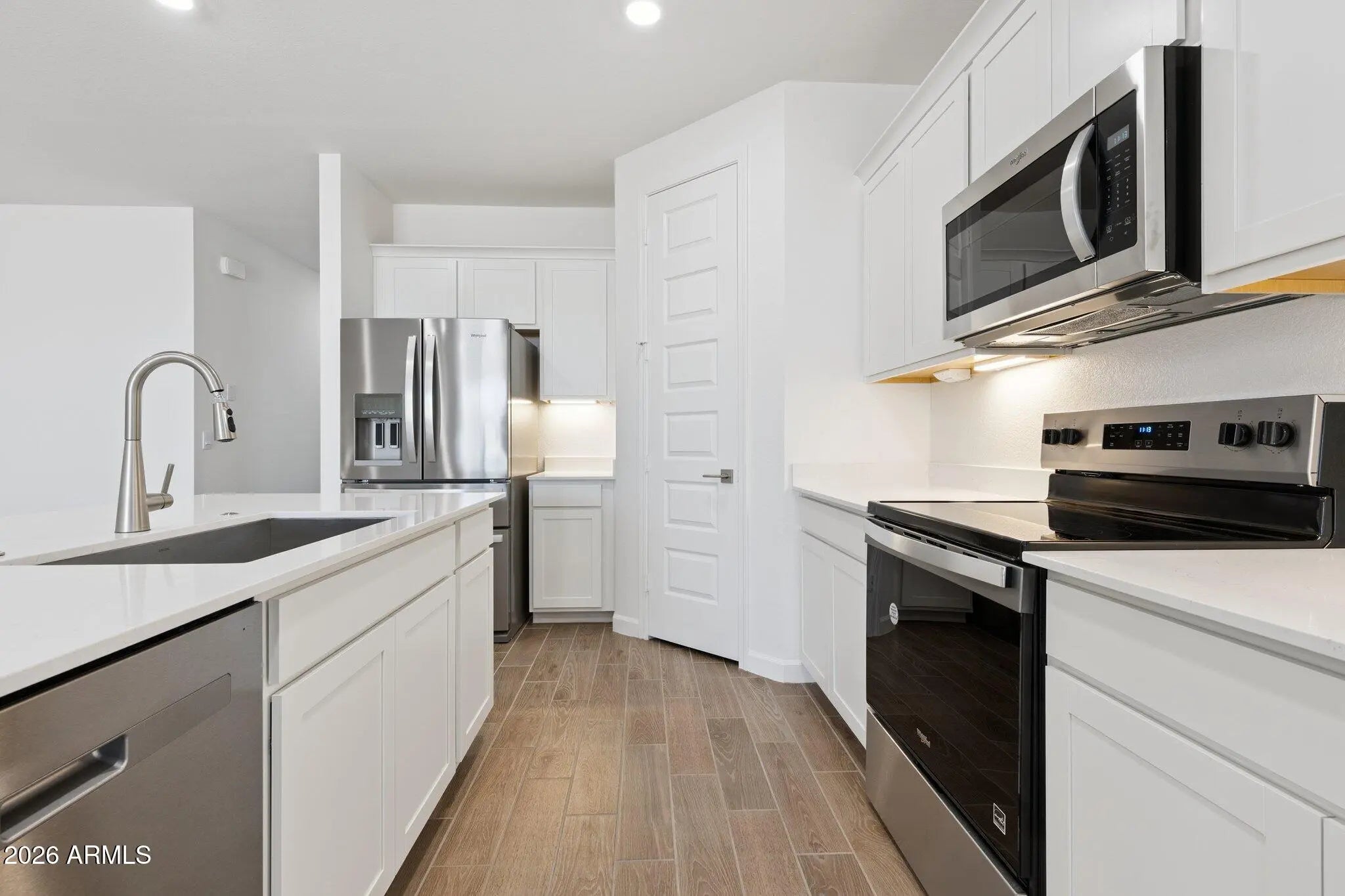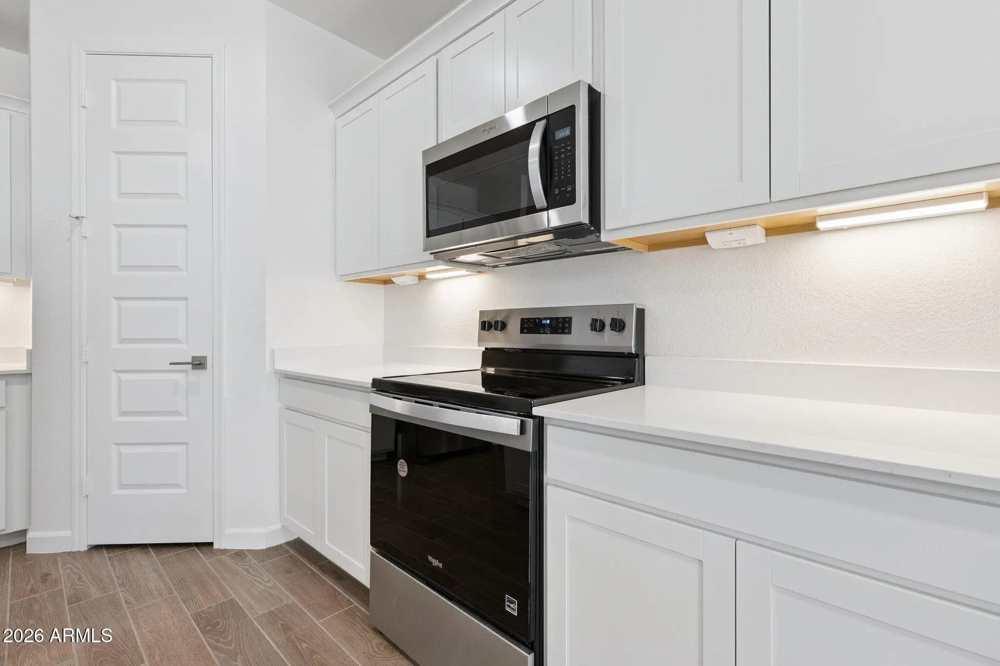 This beautifully upgraded home features a bright, open floor plan designed for modern living. The kitchen showcases crisp white shaker cabinets, quartz countertops, a classic subway tile backsplash, & upgraded stainless steel appliances including range, oven, dishwasher & microwave. Under cabinet lighting adds both ambiance & functionality. Throughout the main living areas, enjoy durable 6x24 inch wood look tile, while upgraded carpet provides comfort in the bedrooms. Elegant 8 ft interior doors enhance the sense of space & style. A sliding glass door opens to the patio, seamlessly blending indoor & outdoor living, perfect for entertaining or relaxing at home