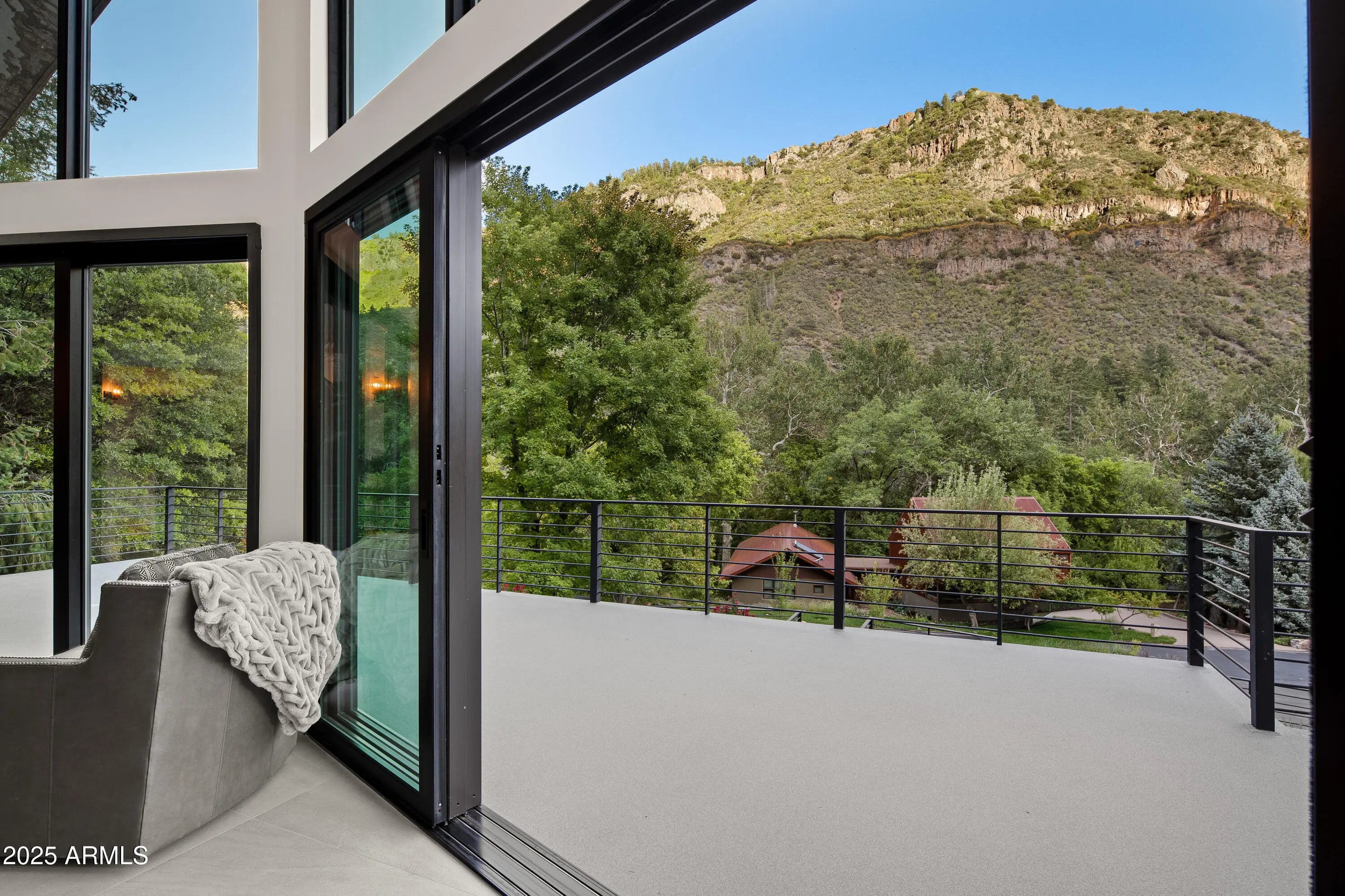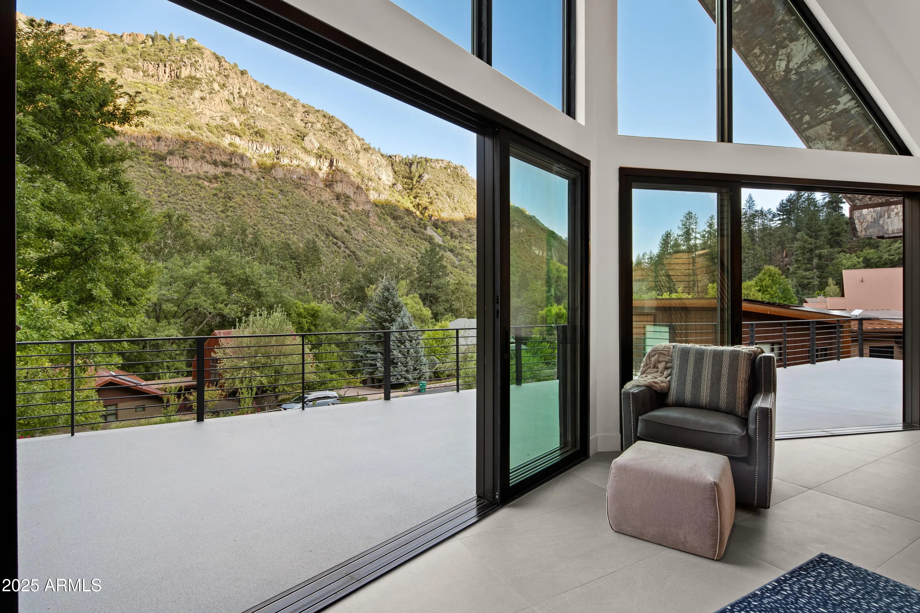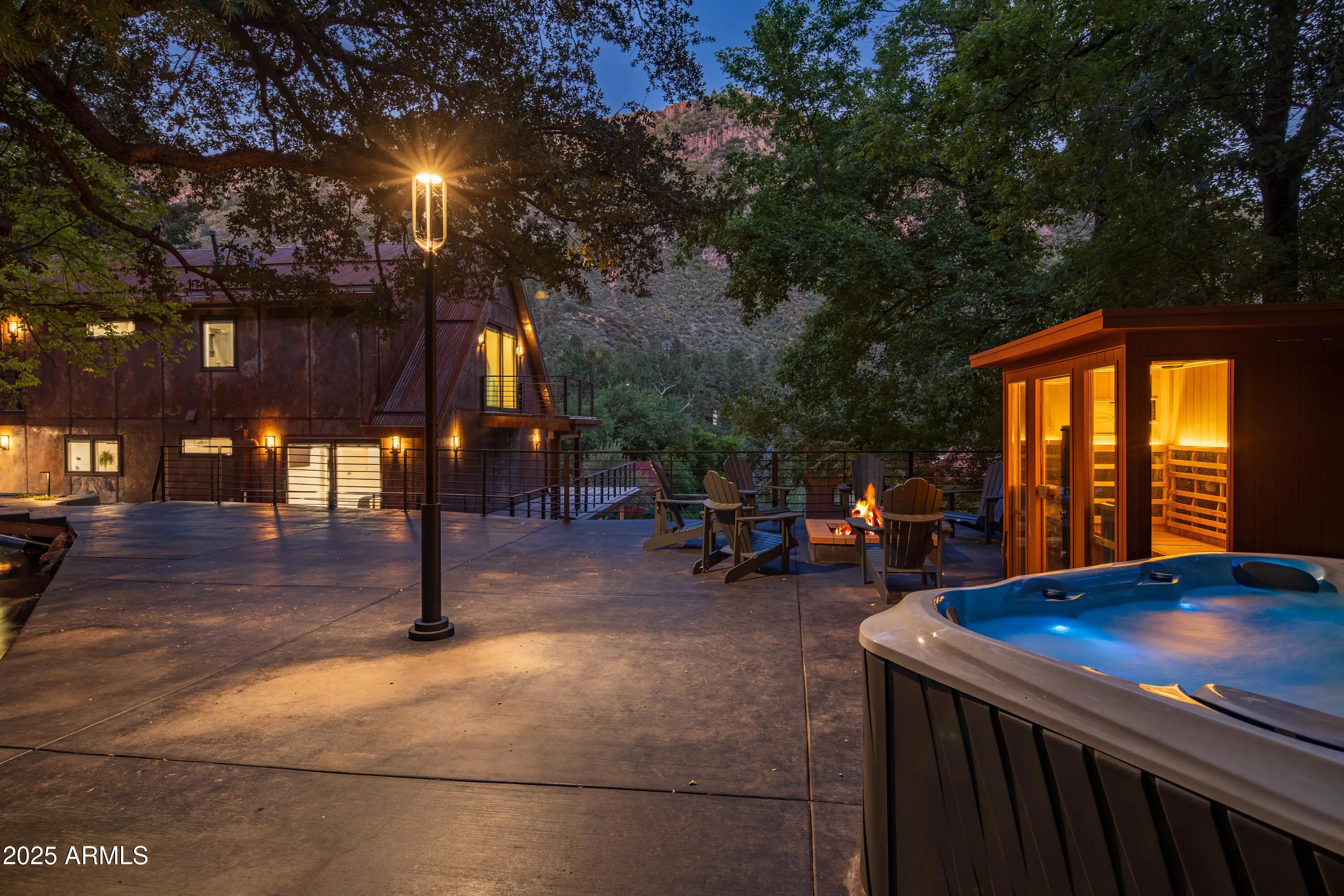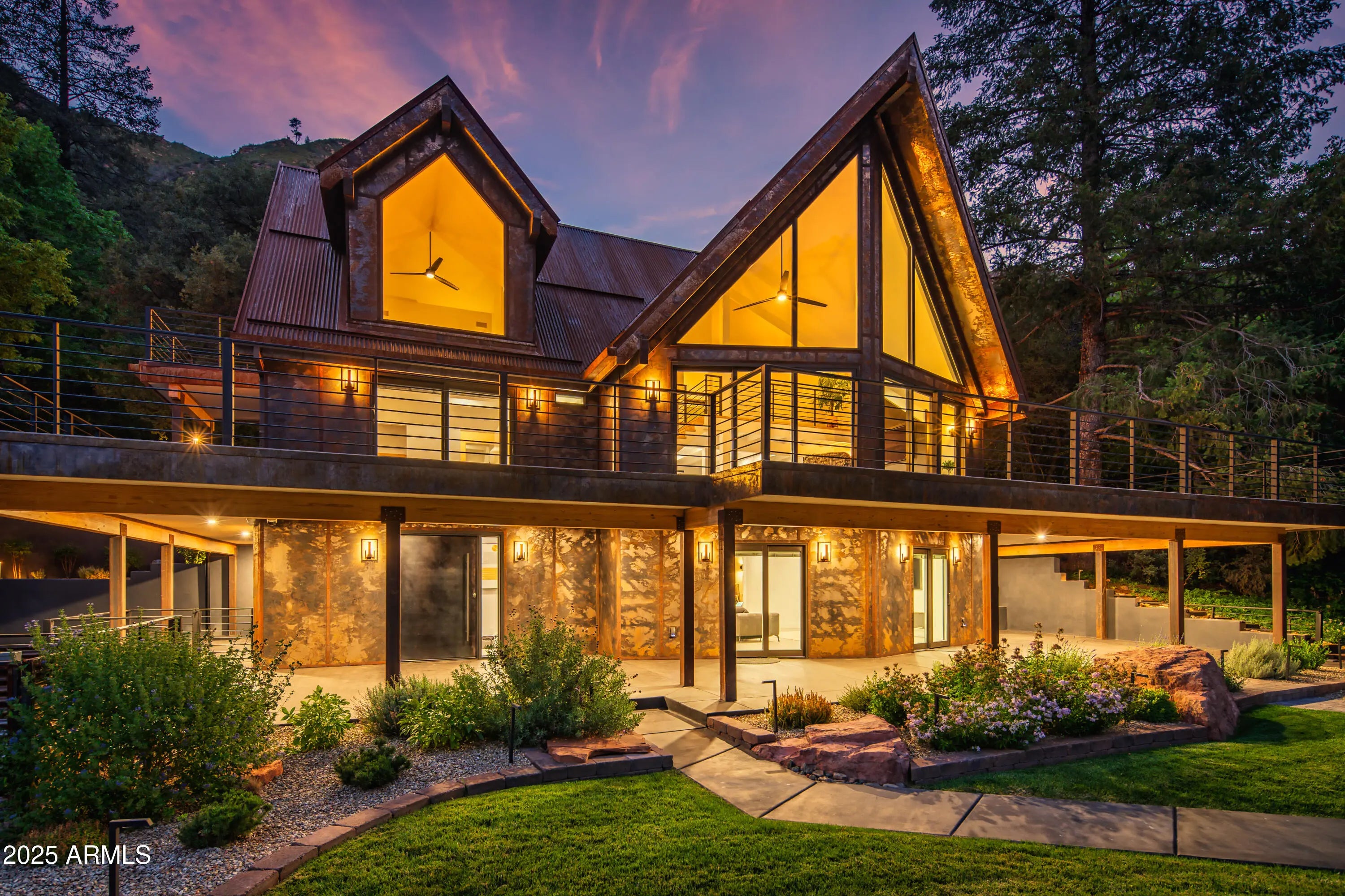 Mountain Modern Getaway. Step into a world where luxury meets serenity at this fully reimagined 2024 Mountain Modern masterpiece, tucked within the gated, creekside enclave of Junipine Estates, one of Oak Creek Canyon's most cherished communities. This rare 5 bedroom, 4.5 bath sanctuary backs to National Forest land and captures breathtaking views of the towering canyon walls that shift with the light throughout the day. Junipine Estates is more than a neighborhood, it is a living piece of history, offering 10 acres of lush common grounds along Oak Creek, a heritage apple orchard from the 1800s, a historic water channel, and a shared interest in the Purtyman Cabin, a Sedona landmark dating to the 1880s. Clad in striking Corten steel siding, the home blends strength, durability, and style. Inside, 22 foot ceilings and walls of glass frame the surrounding fir, pine, and juniper trees, immersing you in nature while the sounds of the creek provide a constant, soothing backdrop. Two spacious primary suites, each with a Juliette balcony, include a spa-like steam shower for the ultimate retreat. Designed for seamless indoor and outdoor living, disappearing sliding glass walls invite cool canyon breezes and dissolve the boundary between home and nature. Nearly 1,000 feet higher than Sedona, the climate is refreshingly cool in summer with crisp autumn evenings perfect for fireside gatherings. Expansive wraparound decks create endless options for starlit dining, morning coffee, or simply taking in the canyon's beauty. The gourmet kitchen opens to an al fresco dining area, while the grounds offer a lush front lawn with pear trees, a terraced garden with firepit and red rock water fountain, and a back patio where the historic water channel flows gently past. End each day in pure relaxation as you enjoy the infrared sauna, gather with friends around the firepit, or soak in the eight person Jacuzzi under a brilliant canopy of stars. This is more than a home, it is a rare opportunity to experience a storybook life in one of the most exclusive creek front neighborhoods in Oak Creek Canyon.