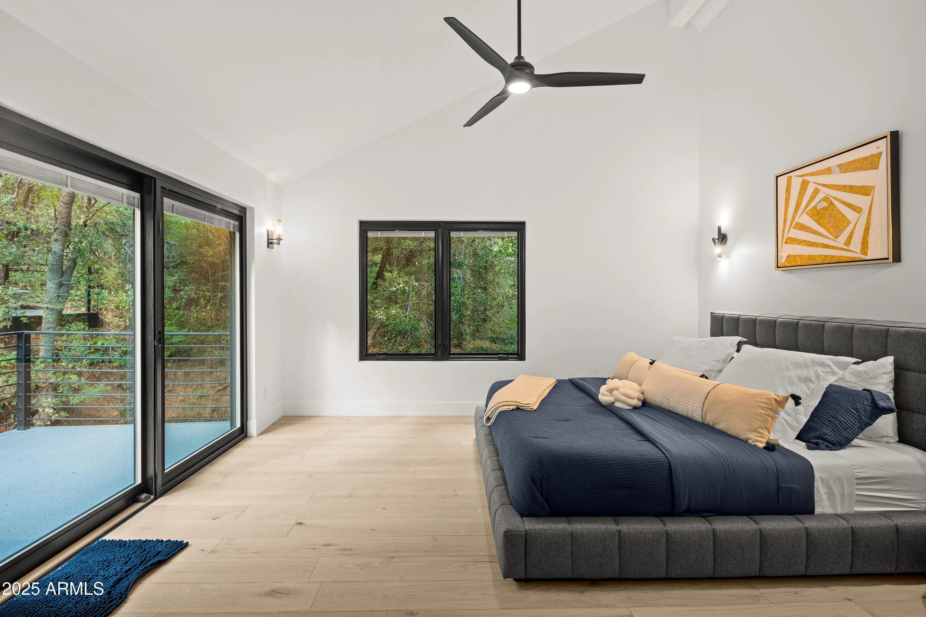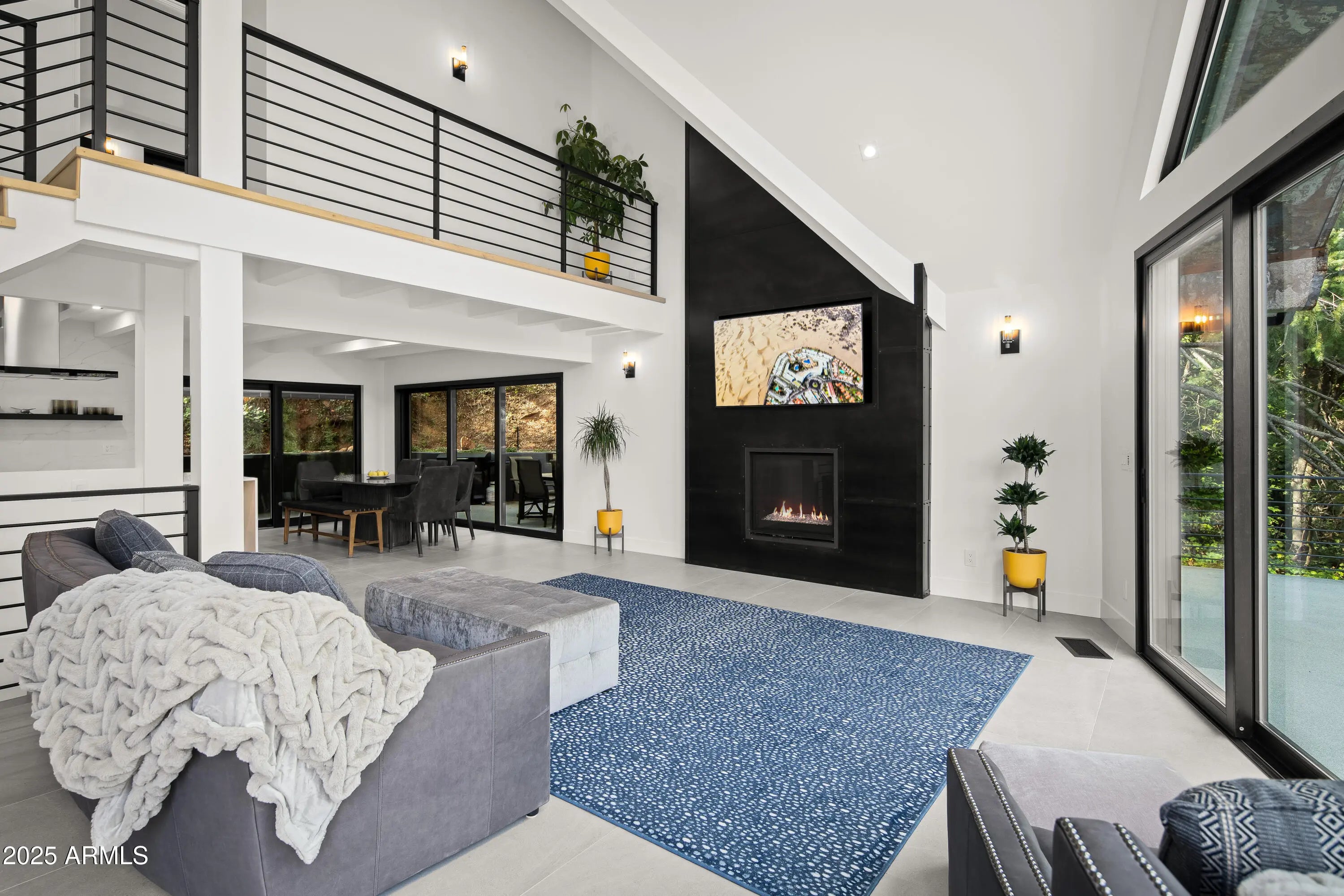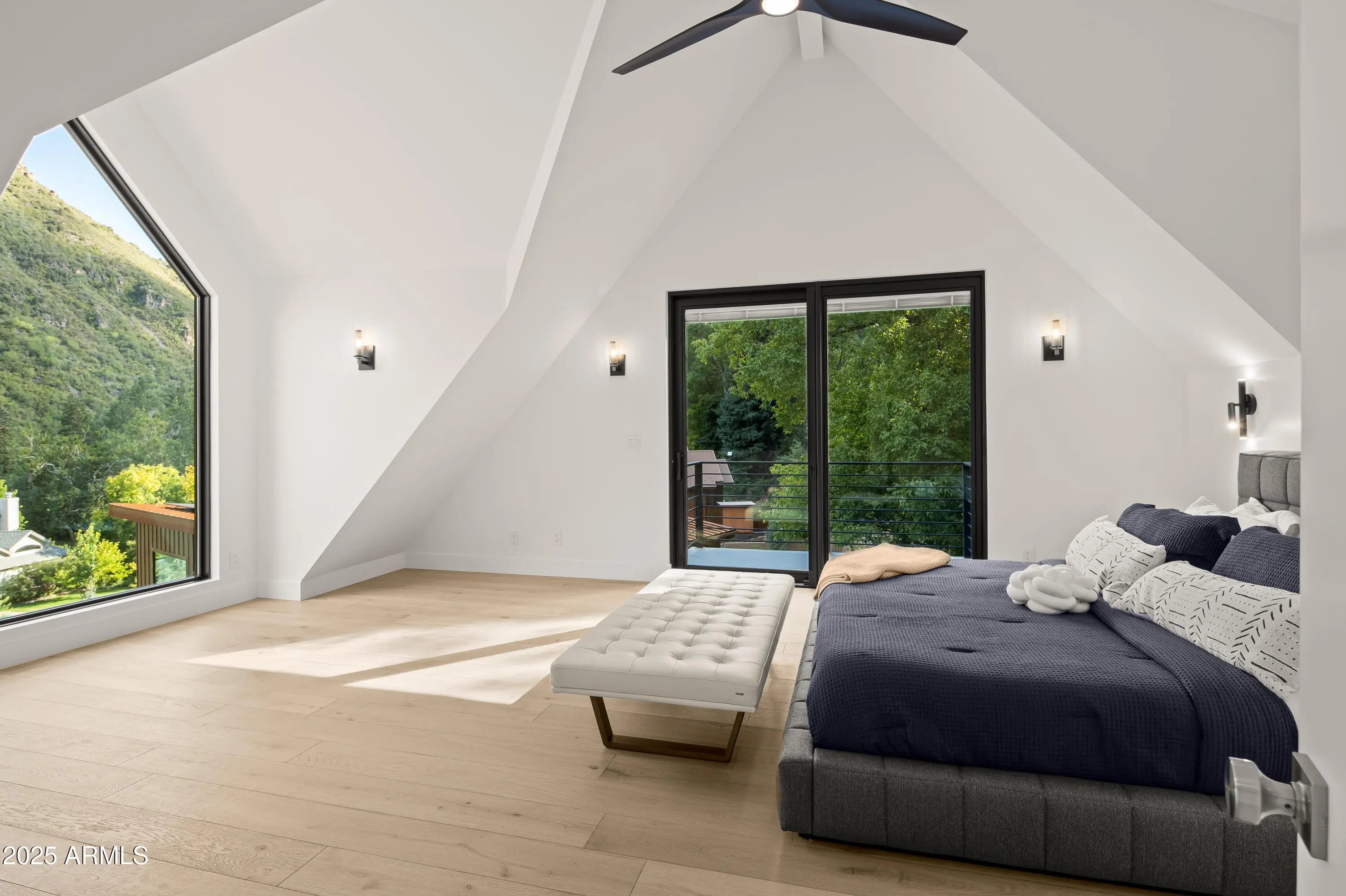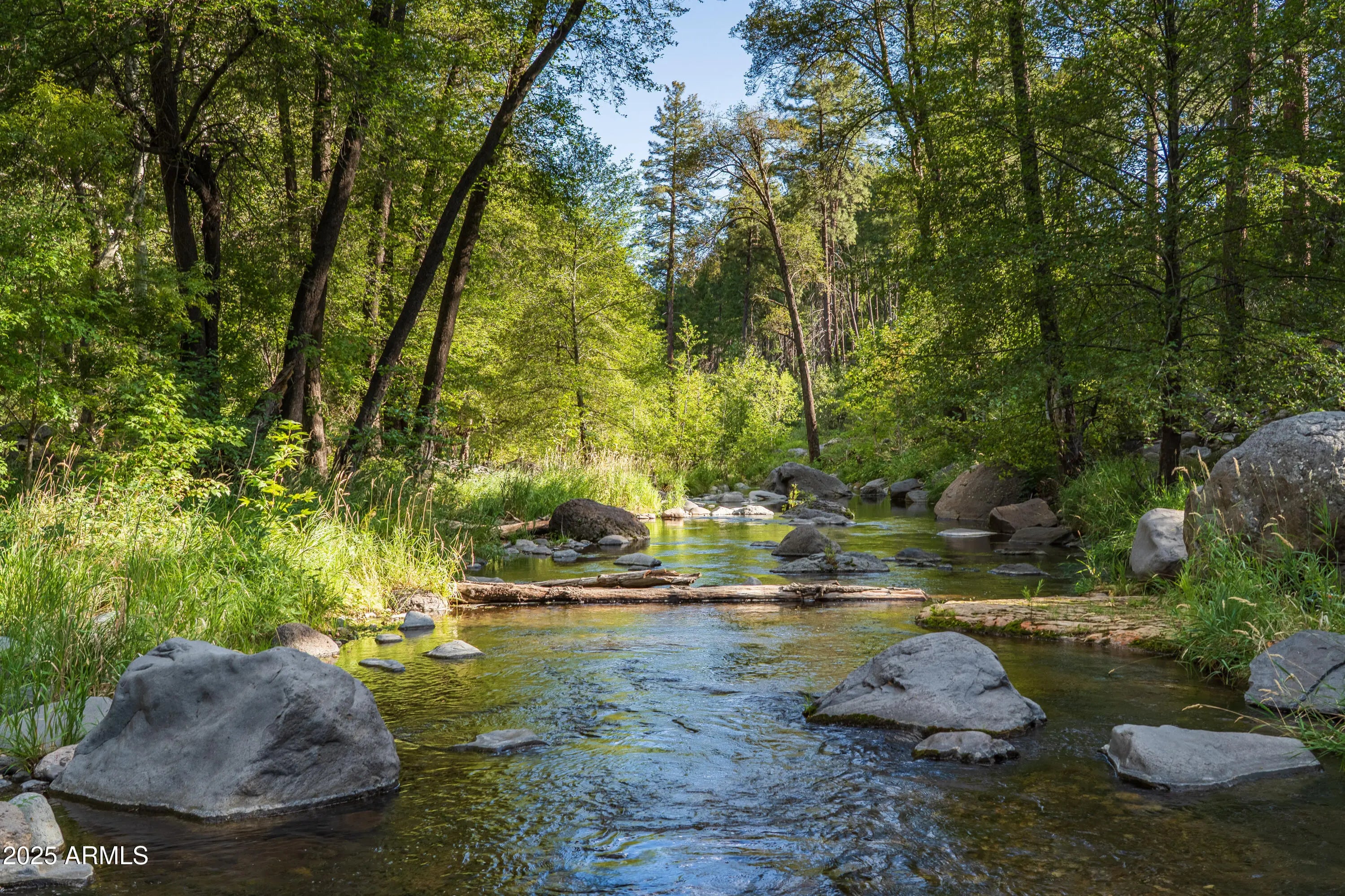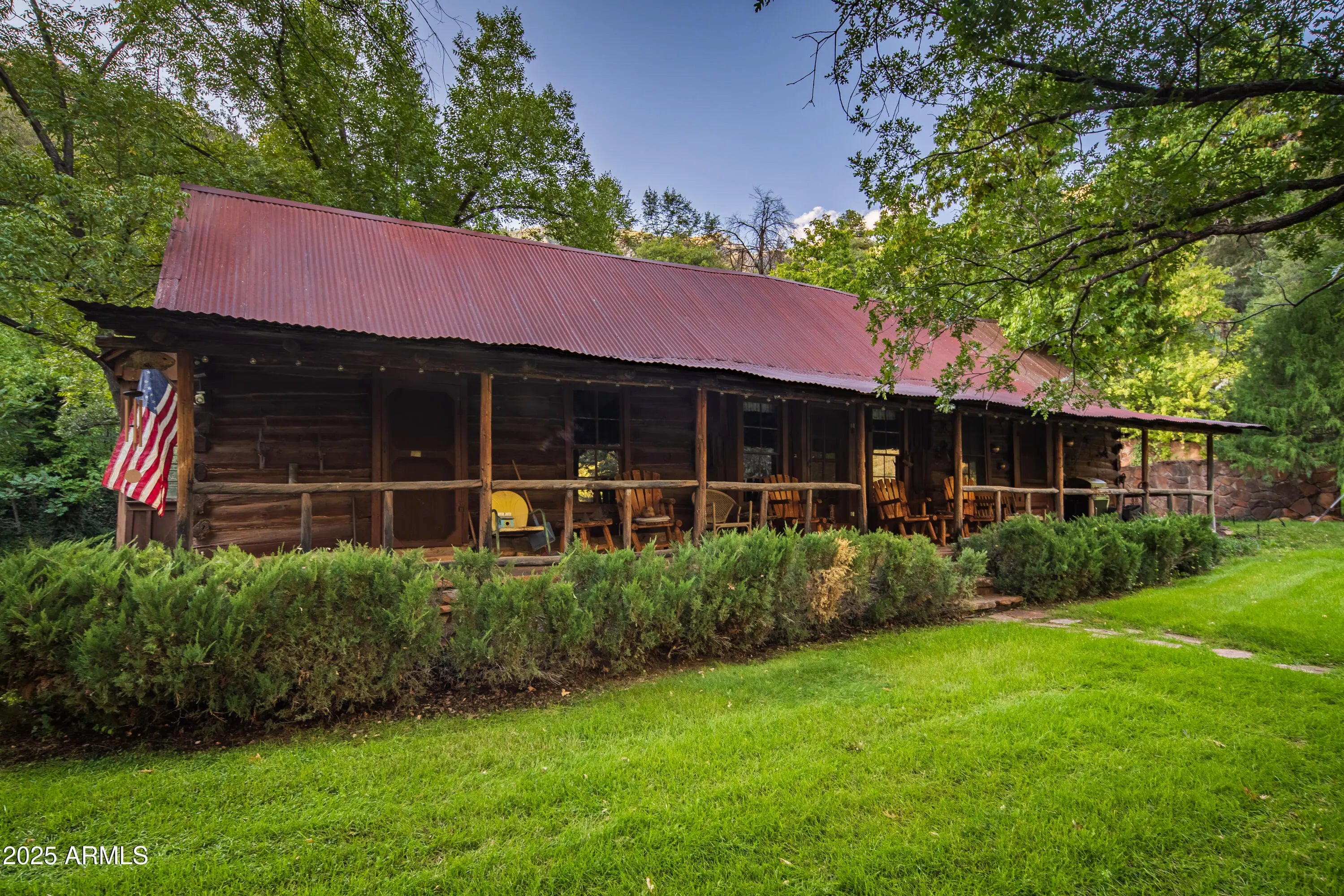 Mountain Modern Getaway. Step into a world where luxury meets serenity at this fully reimagined 2024 Mountain Modern masterpiece, tucked within the gated, creekside enclave of Junipine Estates, one of Oak Creek Canyon's most cherished communities. This rare 5 bedroom, 4.5 bath sanctuary backs to National Forest land and captures breathtaking views of the towering canyon walls that shift with the light throughout the day. Junipine Estates is more than a neighborhood, it is a living piece of history, offering 10 acres of lush common grounds along Oak Creek, a heritage apple orchard from the 1800s, a historic water channel, and a shared interest in the Purtyman Cabin, a Sedona landmark dating to the 1880s. Clad in striking Corten steel siding, the home blends strength, durability, and style. Inside, 22 foot ceilings and walls of glass frame the surrounding fir, pine, and juniper trees, immersing you in nature while the sounds of the creek provide a constant, soothing backdrop. Two spacious primary suites, each with a Juliette balcony, include a spa-like steam shower for the ultimate retreat. Designed for seamless indoor and outdoor living, disappearing sliding glass walls invite cool canyon breezes and dissolve the boundary between home and nature. Nearly 1,000 feet higher than Sedona, the climate is refreshingly cool in summer with crisp autumn evenings perfect for fireside gatherings. Expansive wraparound decks create endless options for starlit dining, morning coffee, or simply taking in the canyon's beauty. The gourmet kitchen opens to an al fresco dining area, while the grounds offer a lush front lawn with pear trees, a terraced garden with firepit and red rock water fountain, and a back patio where the historic water channel flows gently past. End each day in pure relaxation as you enjoy the infrared sauna, gather with friends around the firepit, or soak in the eight person Jacuzzi under a brilliant canopy of stars. This is more than a home, it is a rare opportunity to experience a storybook life in one of the most exclusive creek front neighborhoods in Oak Creek Canyon.