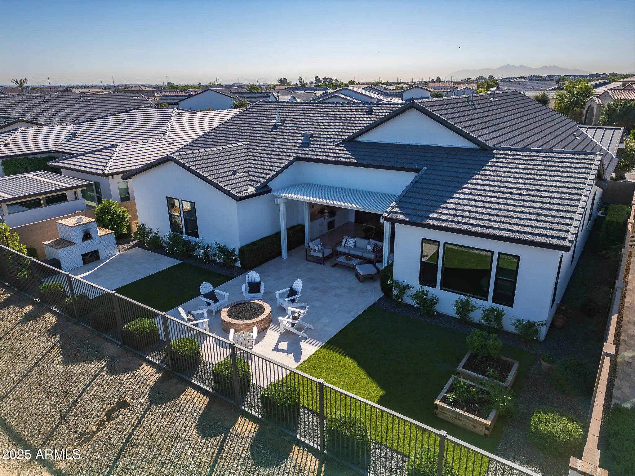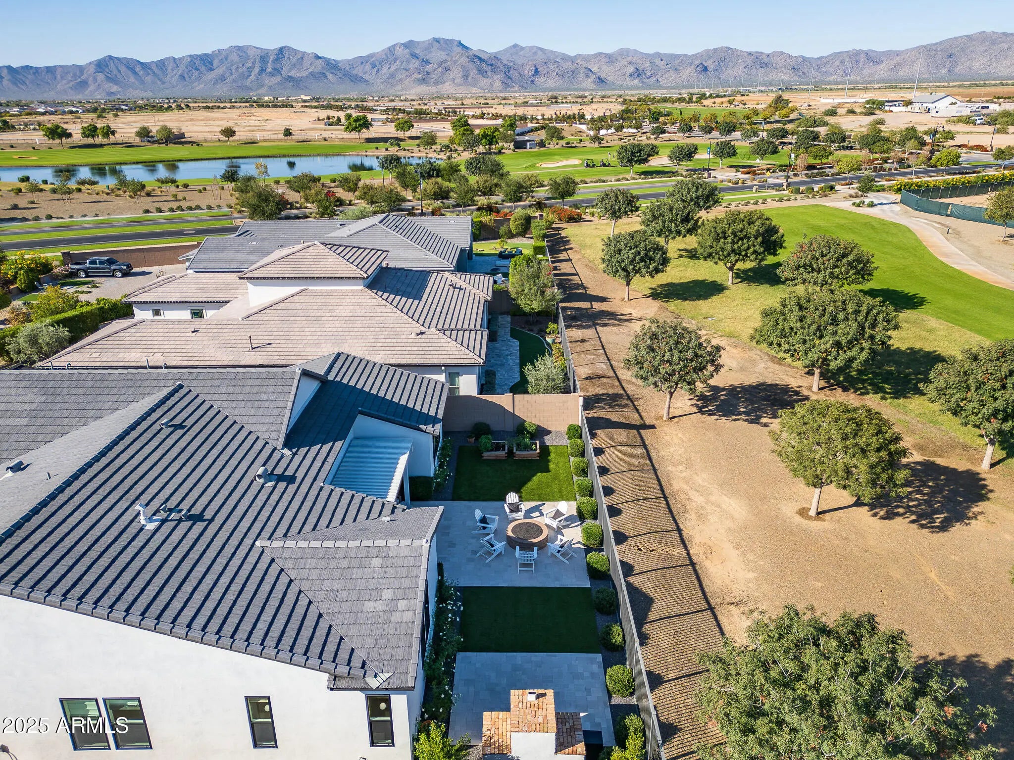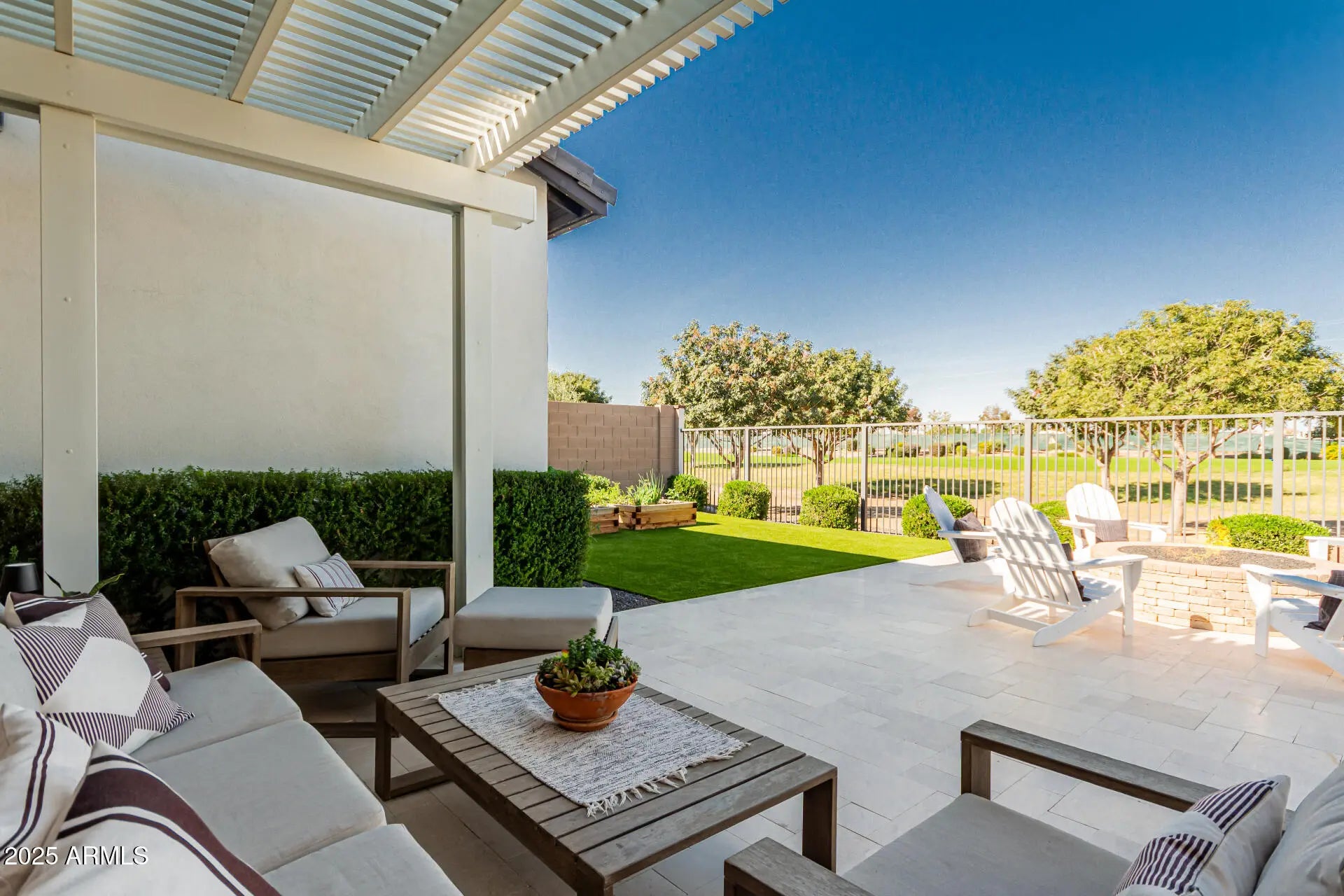 The modern Farmhouse ''St Helena'' model next to the Clubhouse and on HOLE #8... is worth every second of your time to tour it. NOTHING has been left untouched (tastefully done upgrades throughout). From the front porch, to the back of the home, this property has it all, boasting: Iron door with glass panel that opens, all 3 bedrooms are separated and at other ends of the house, MASSIVE built in fridge, cabinet upgrades throughout, media wall in living room, extended shower in Primary bedroom, dedicated office, garage with tons of style (& epoxy), 16 ft multi-panel collapsing slider that CREATES THE INDOOR OUTDOOR FEEL of the floor plan. Bonus: Built-in bbq, extended covered patio, gas fire pit, and the coolest pizza oven you've ever seen... & a complete wrap of Trimlight holiday lights.