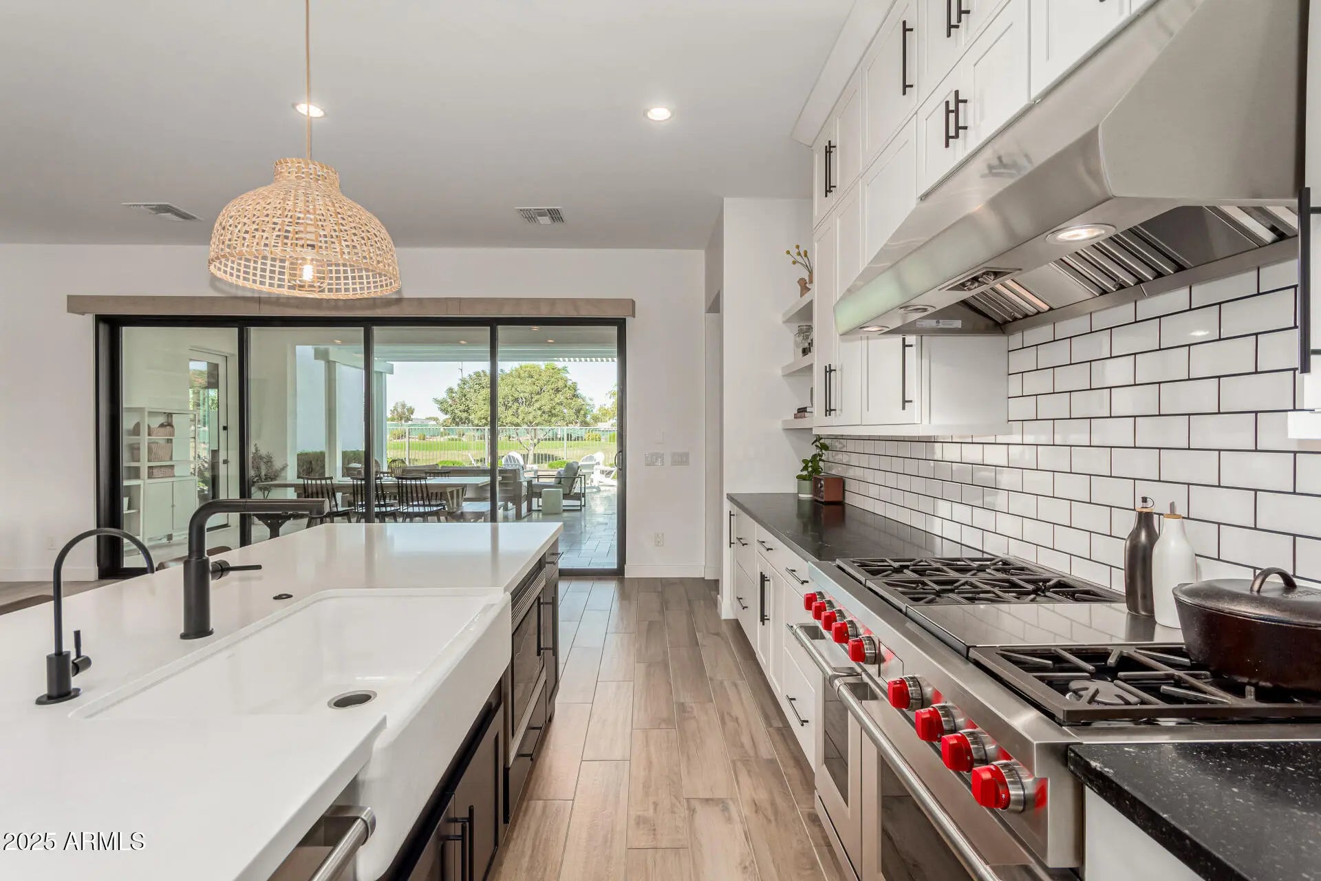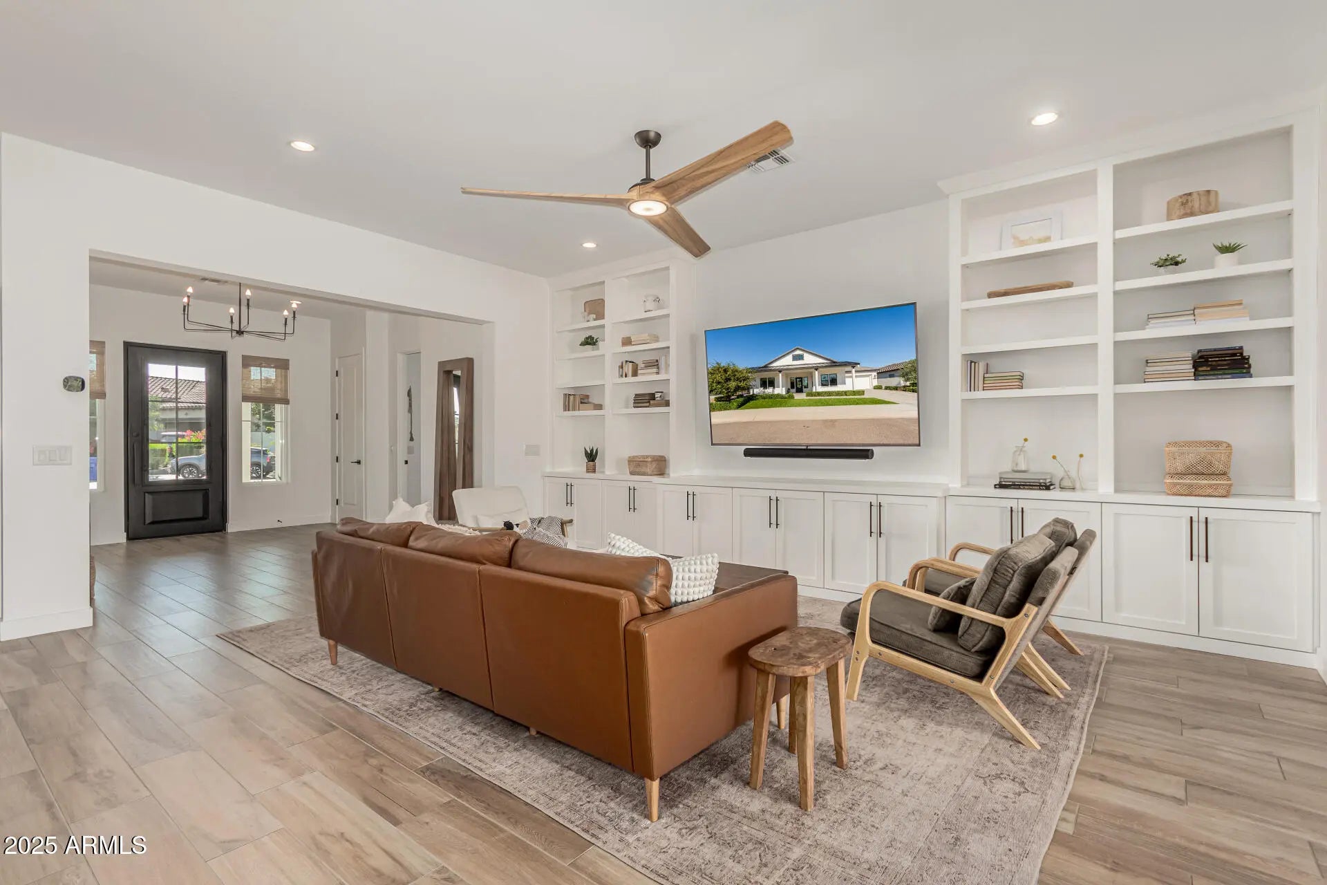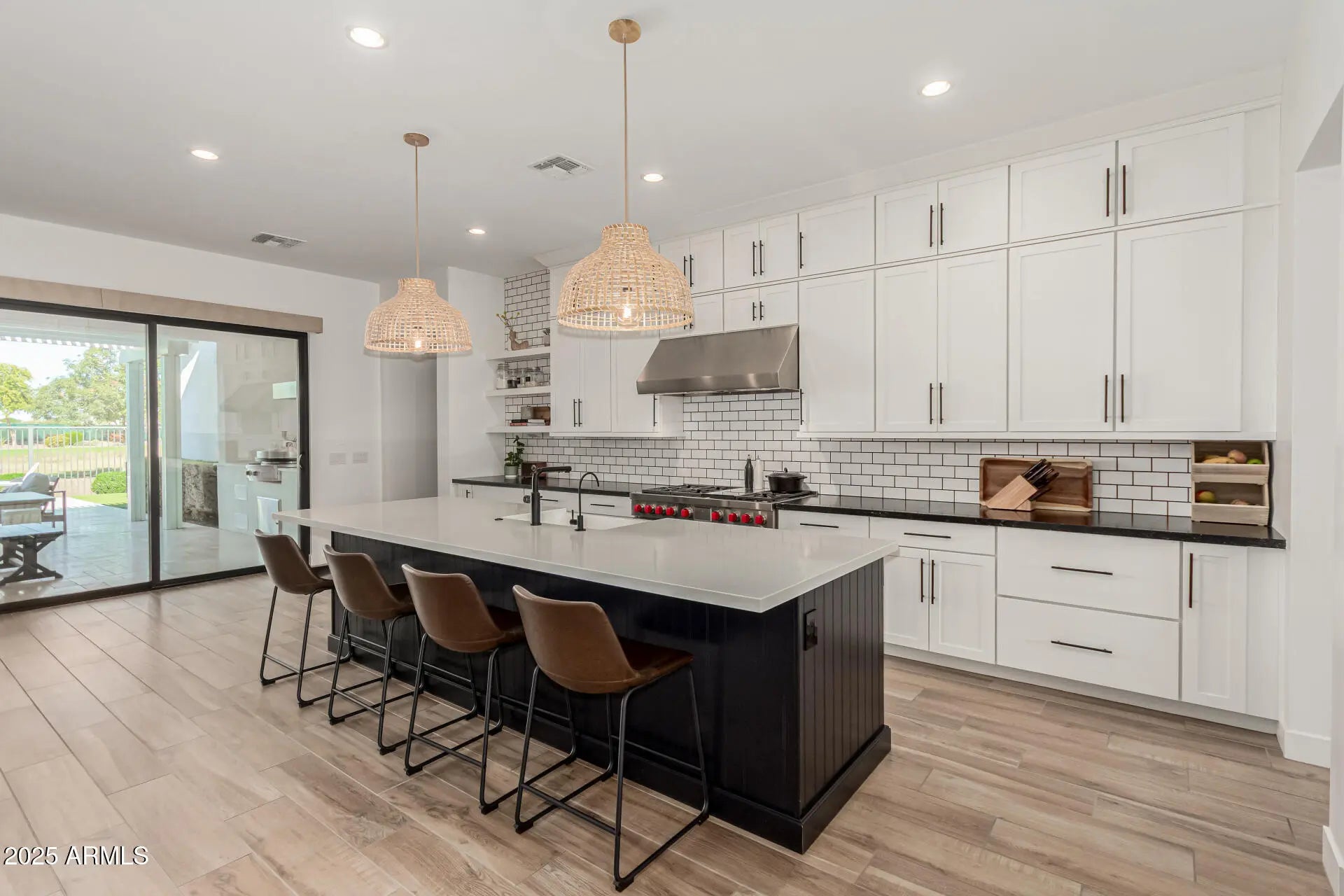 The modern Farmhouse ''St Helena'' model next to the Clubhouse and on HOLE #8... is worth every second of your time to tour it. NOTHING has been left untouched (tastefully done upgrades throughout). From the front porch, to the back of the home, this property has it all, boasting: Iron door with glass panel that opens, all 3 bedrooms are separated and at other ends of the house, MASSIVE built in fridge, cabinet upgrades throughout, media wall in living room, extended shower in Primary bedroom, dedicated office, garage with tons of style (& epoxy), 16 ft multi-panel collapsing slider that CREATES THE INDOOR OUTDOOR FEEL of the floor plan. Bonus: Built-in bbq, extended covered patio, gas fire pit, and the coolest pizza oven you've ever seen... & a complete wrap of Trimlight holiday lights.