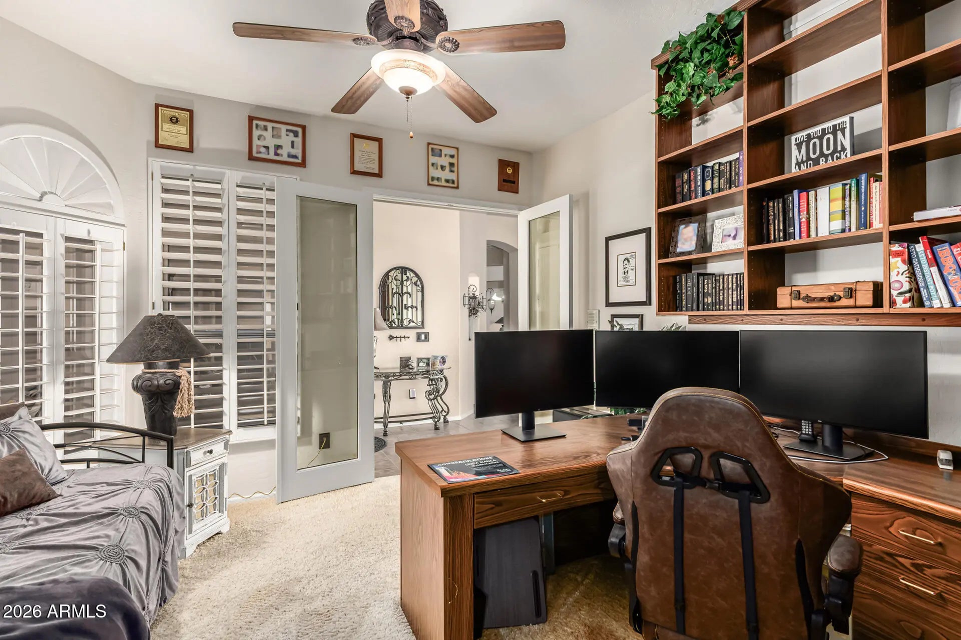 Home, sweet home! This gorgeous 4 bed, 3 bath residence in Sonoran Heights is looking for its new owners! On the 13th hole with desert landscape, and 3 garage spaces are just the beginning. Come inside to discover a spacious dining & living area w/a warm fireplace, perfect for entertaining. Soaring ceilings, durable tile flooring, soft carpet in all the right places, stylish columns, dazzling light fixtures, and custom palette throughout! Continue into the sizeable family room, showcasing plantation shutters and a stone accent wall. The gourmet kitchen is equipped w/everything the aspiring chef needs, wood cabinetry w/crown moulding, tile counters, a pantry, SS appliances such as dual wall ovens, a breakfast nook w/a lovely bay window, and a center island w/a breakfast bar. You'll love the grand primary suite, w/its direct outdoor access, walk-in closet, and full bath w/dual sinks plus a jetted garden tub. Double doors open up to a cozy den, ideal for an office or reading nook. Lastly, the wonderful backyard includes a covered patio, extended flagstone seating areas, lush natural turf, a built-in BBQ, outdoor fireplace, view fence, a sparkling blue diving pool w/a rock waterfall, and a refreshing spa! What are you waiting for? Don't miss out!