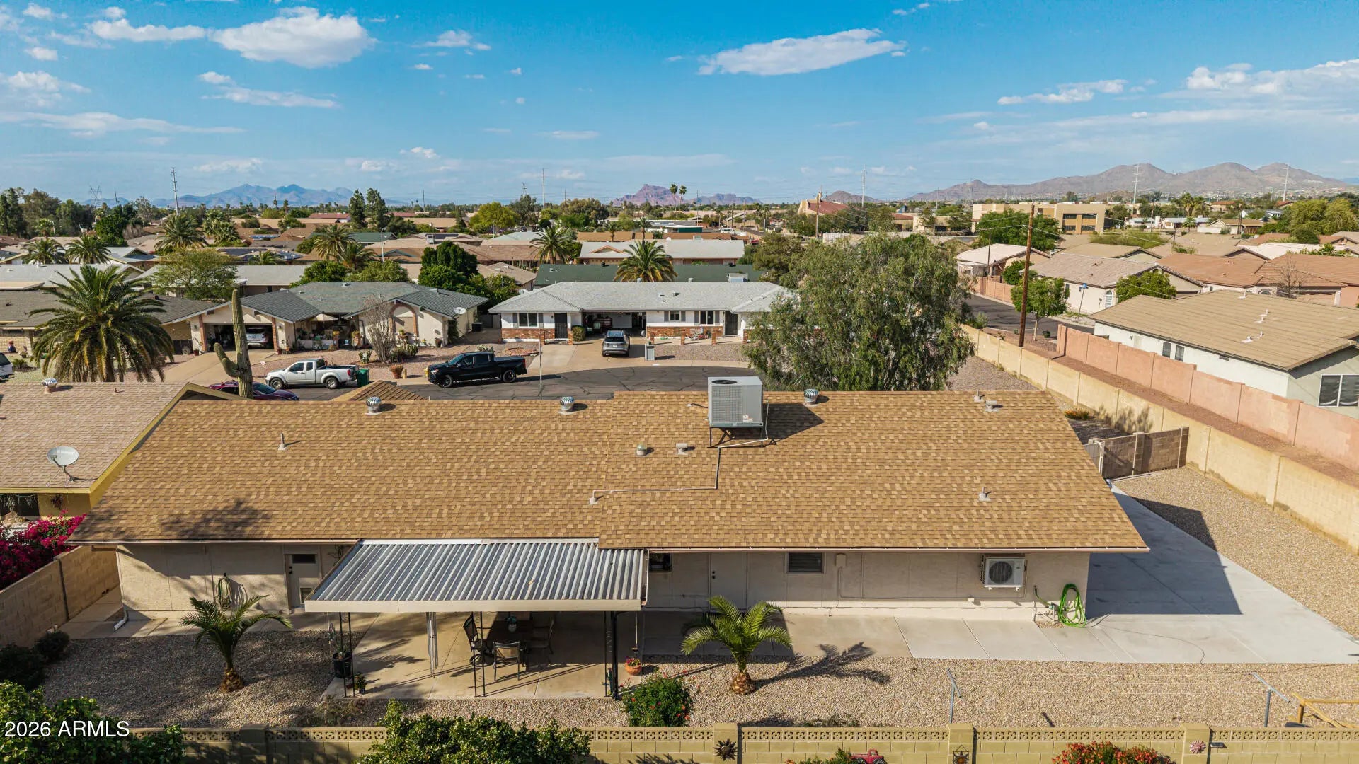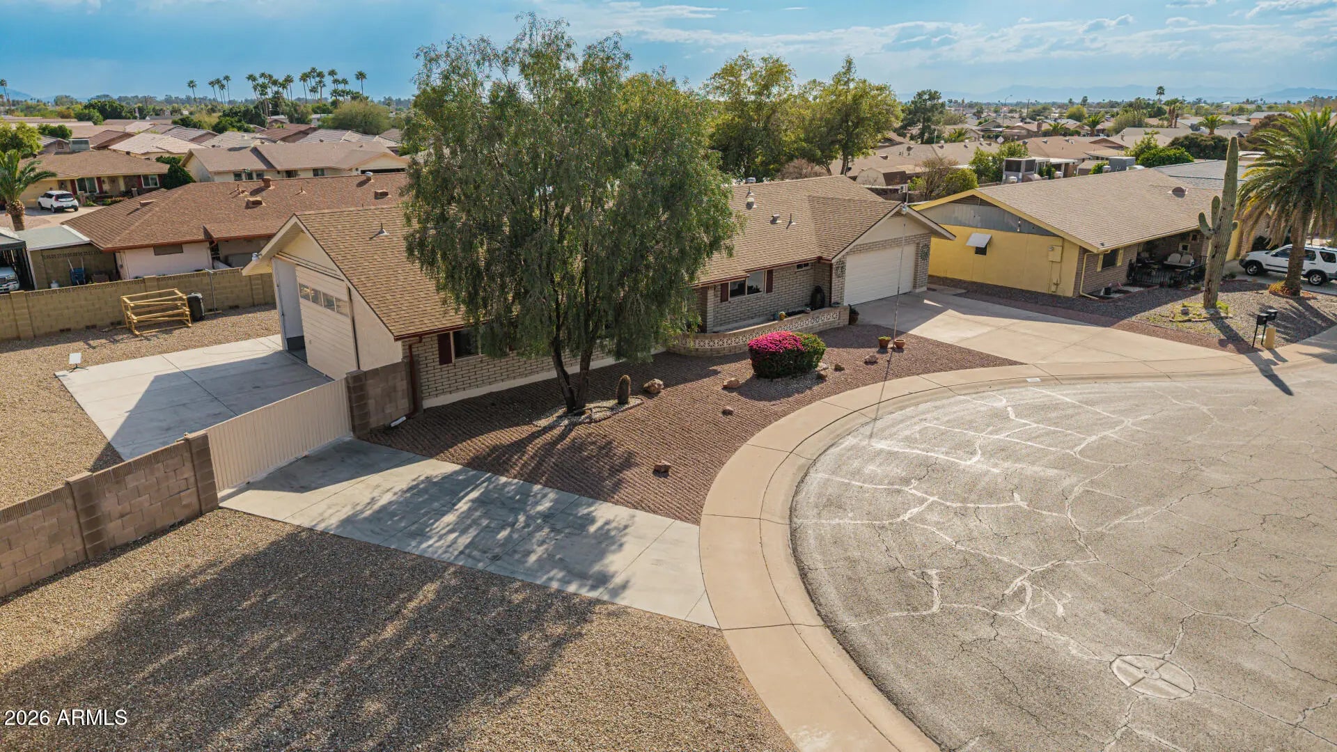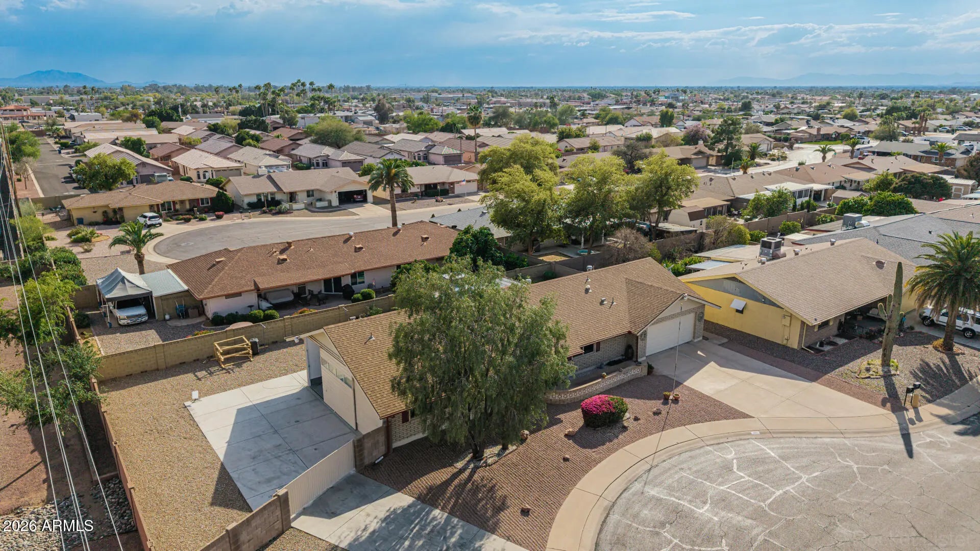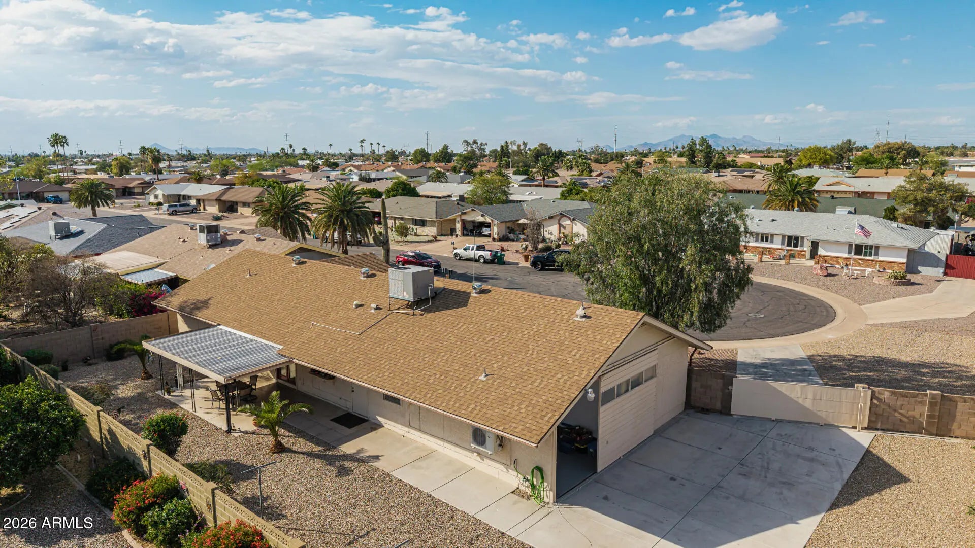 Fantastic single-level home in the highly sought-after active adult community of Velda Rose Estates! Situated on a quiet cul-de-sac and positioned on one of the largest lots in the neighborhood, this property offers exceptional privacy with no neighbors on one side. This well-maintained 2-bedroom, 2-bath home features a 2-car garage plus a rare RV garage with RV gate access. An extra-large concrete pad with added drainage was recently installed at the RV garage entrance for enhanced functionality and convenience. The RV garage also includes a mini-split system (negotiable with the right offer). A water softener is also negotiable. Inside, you'll find inviting living spaces filled with abundant natural light and neutral flooring throughout, creating a bright, open feel. The kitchen showcases stainless steel appliances, warm wood cabinetry, and ample storage space. The spacious primary suite includes a private ensuite bath for comfort and privacy. Step outside to a generously sized backyard featuring a covered patioperfect for relaxing or entertaining. Enjoy fantastic community amenities and a prime Mesa location close to shopping, dining, and medical facilities. This rare oversized lot with RV garage opportunity won't last!