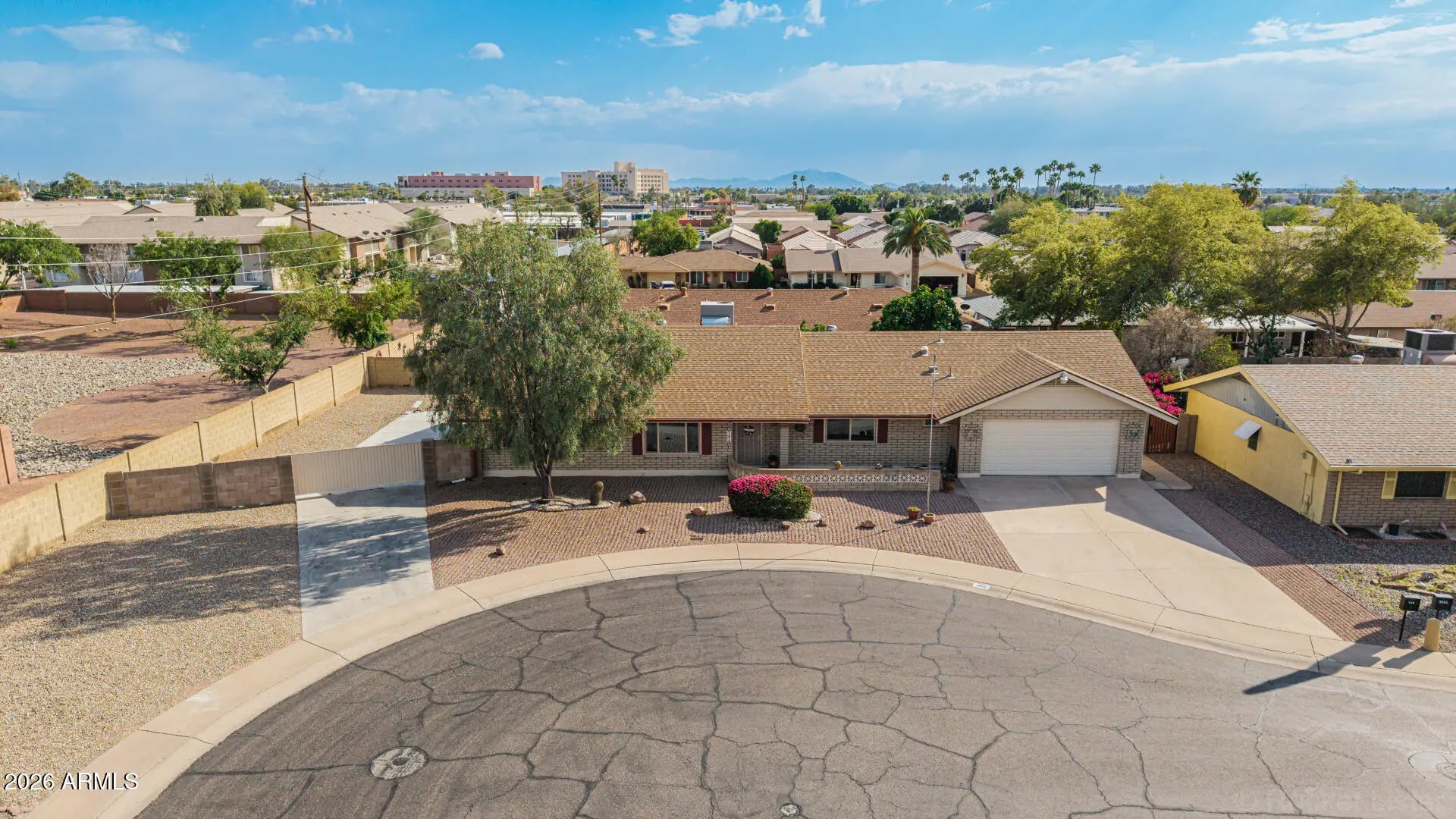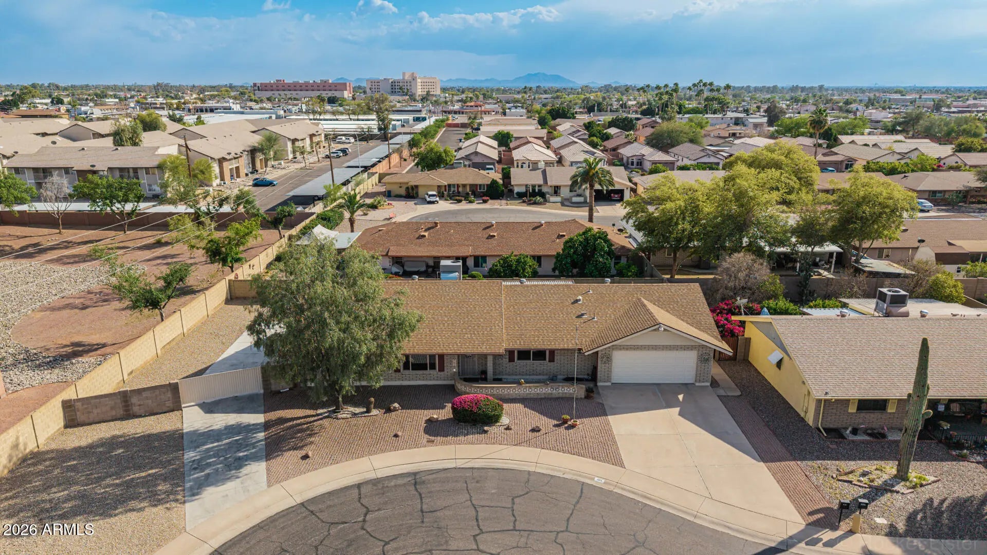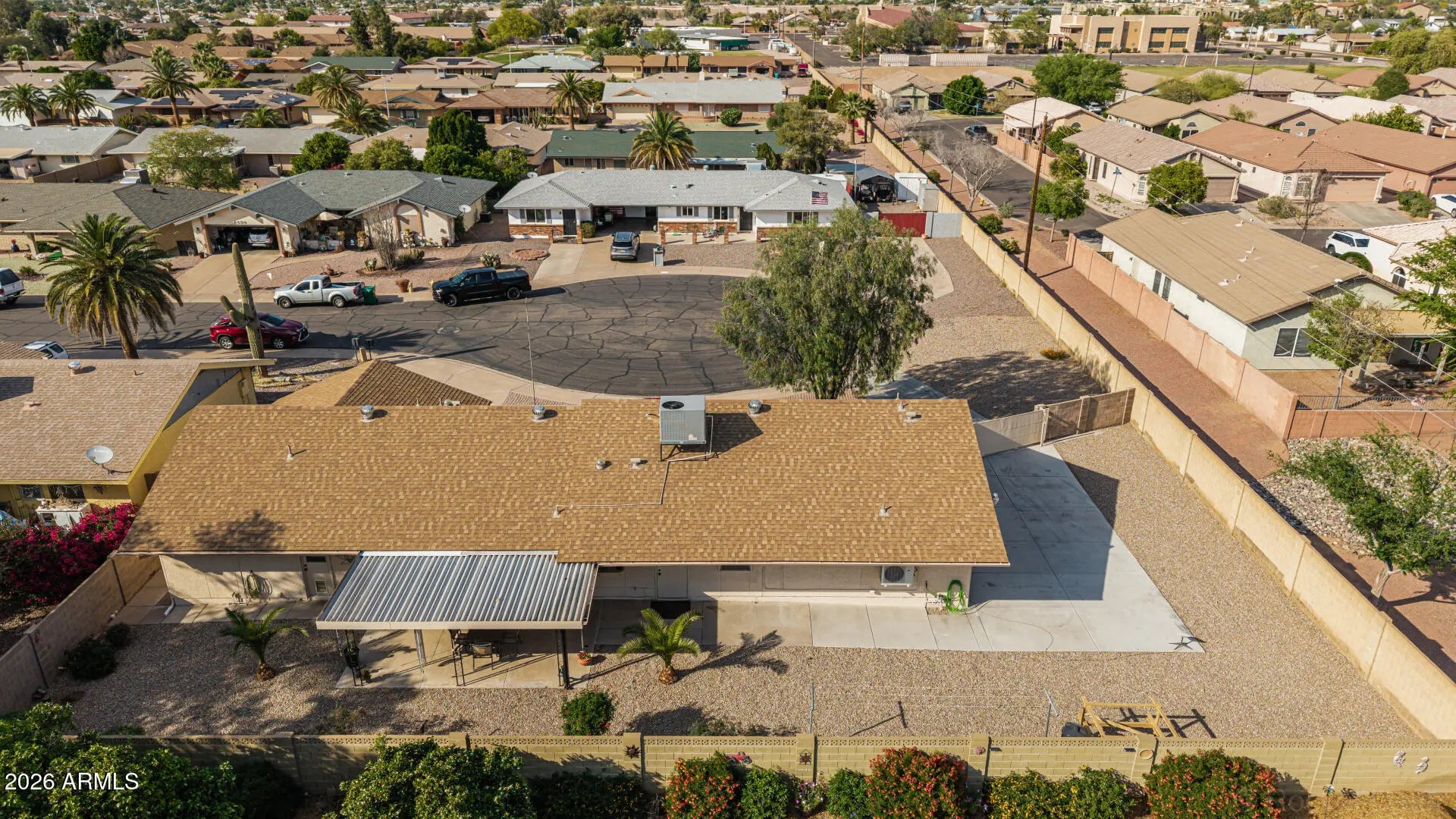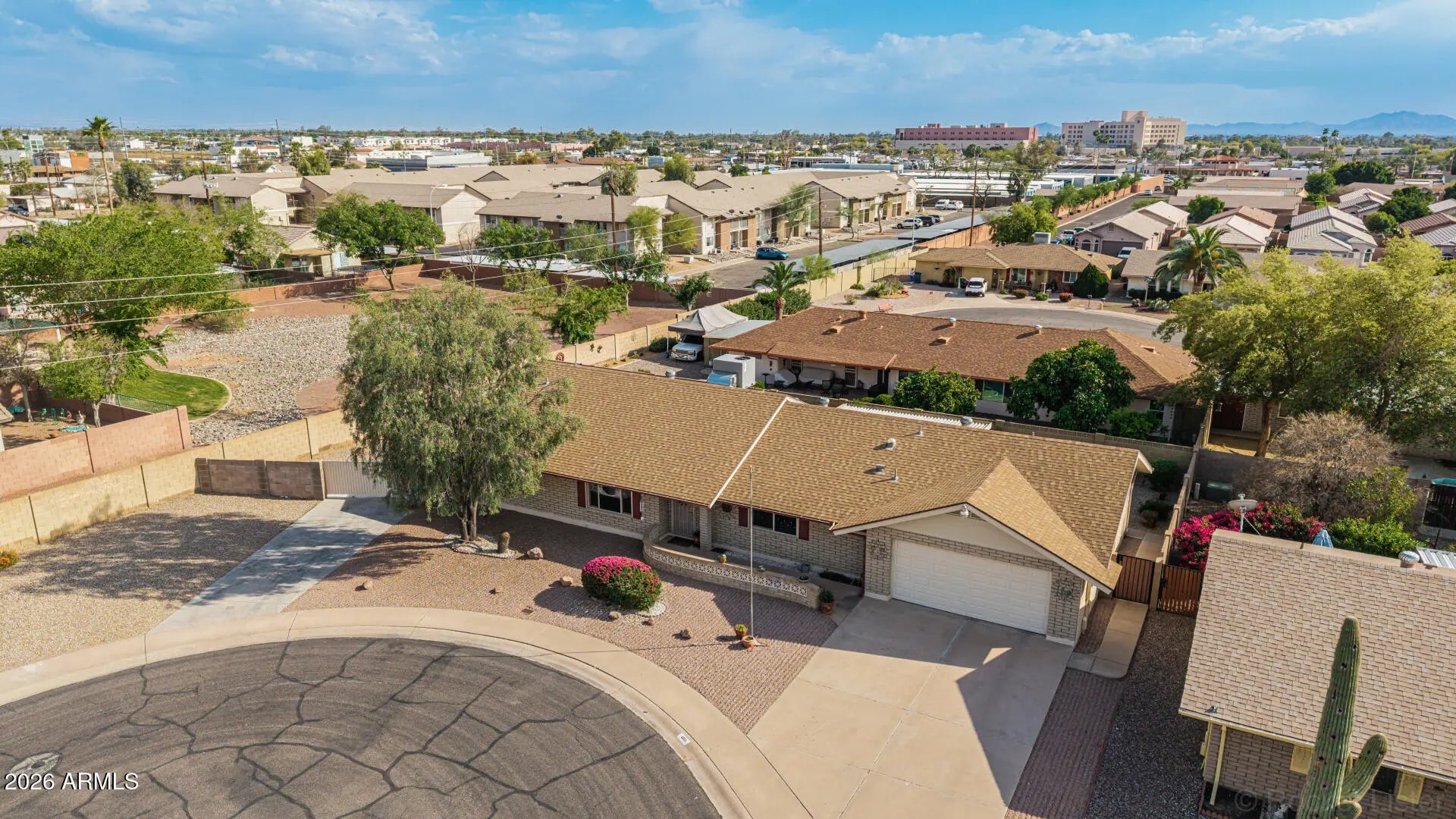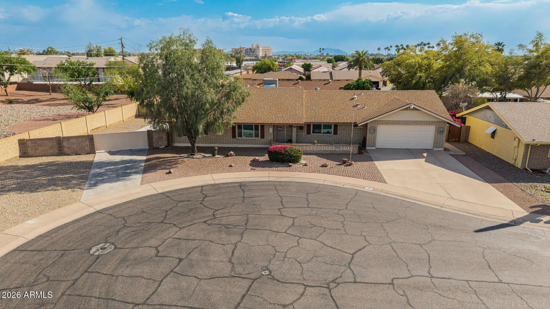 Fantastic single-level home in the highly sought-after active adult community of Velda Rose Estates! Situated on a quiet cul-de-sac and positioned on one of the largest lots in the neighborhood, this property offers exceptional privacy with no neighbors on one side. This well-maintained 2-bedroom, 2-bath home features a 2-car garage plus a rare RV garage with RV gate access. An extra-large concrete pad with added drainage was recently installed at the RV garage entrance for enhanced functionality and convenience. The RV garage also includes a mini-split system (negotiable with the right offer). A water softener is also negotiable. Inside, you'll find inviting living spaces filled with abundant natural light and neutral flooring throughout, creating a bright, open feel. The kitchen showcases stainless steel appliances, warm wood cabinetry, and ample storage space. The spacious primary suite includes a private ensuite bath for comfort and privacy. Step outside to a generously sized backyard featuring a covered patioperfect for relaxing or entertaining. Enjoy fantastic community amenities and a prime Mesa location close to shopping, dining, and medical facilities. This rare oversized lot with RV garage opportunity won't last!