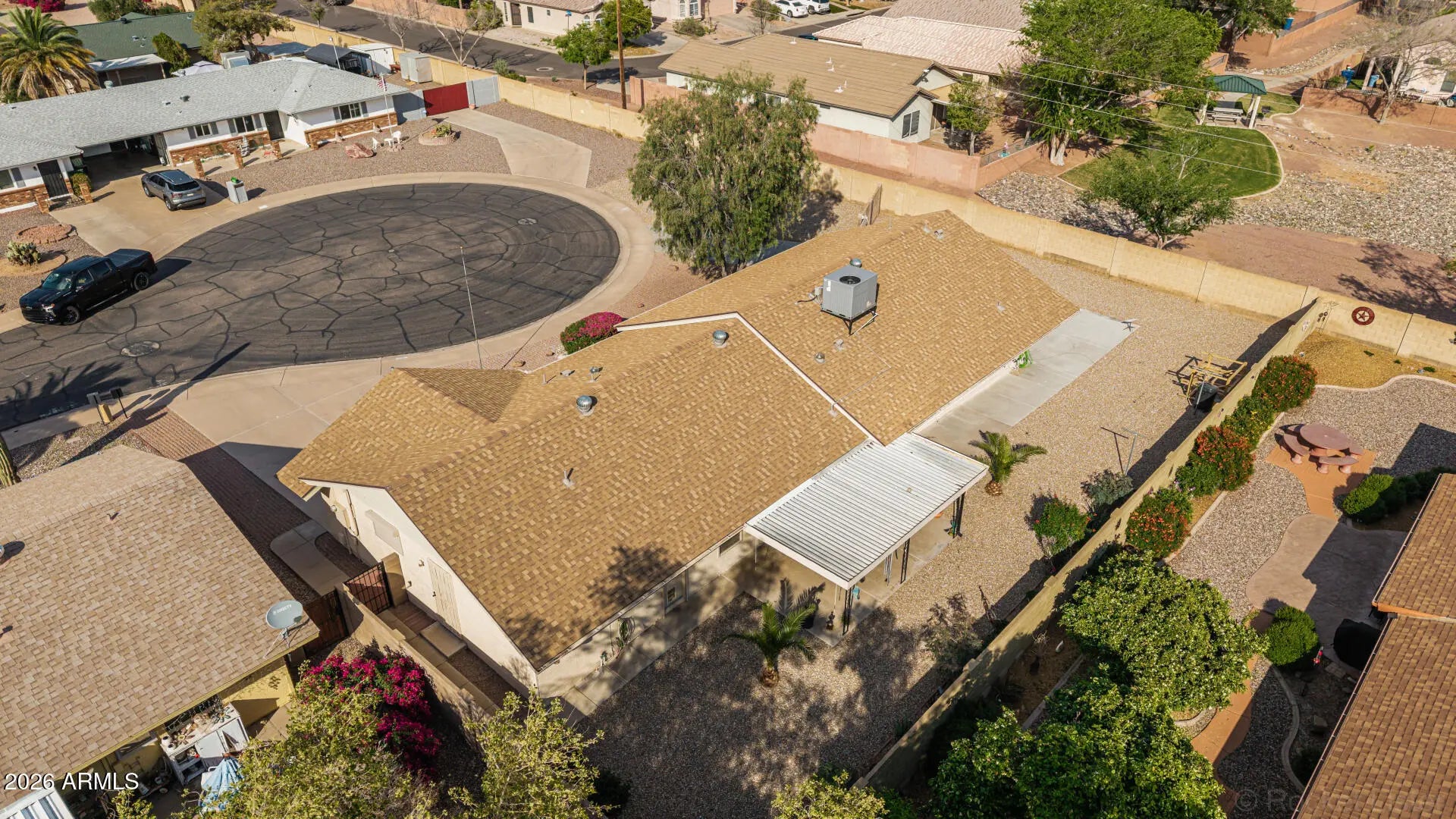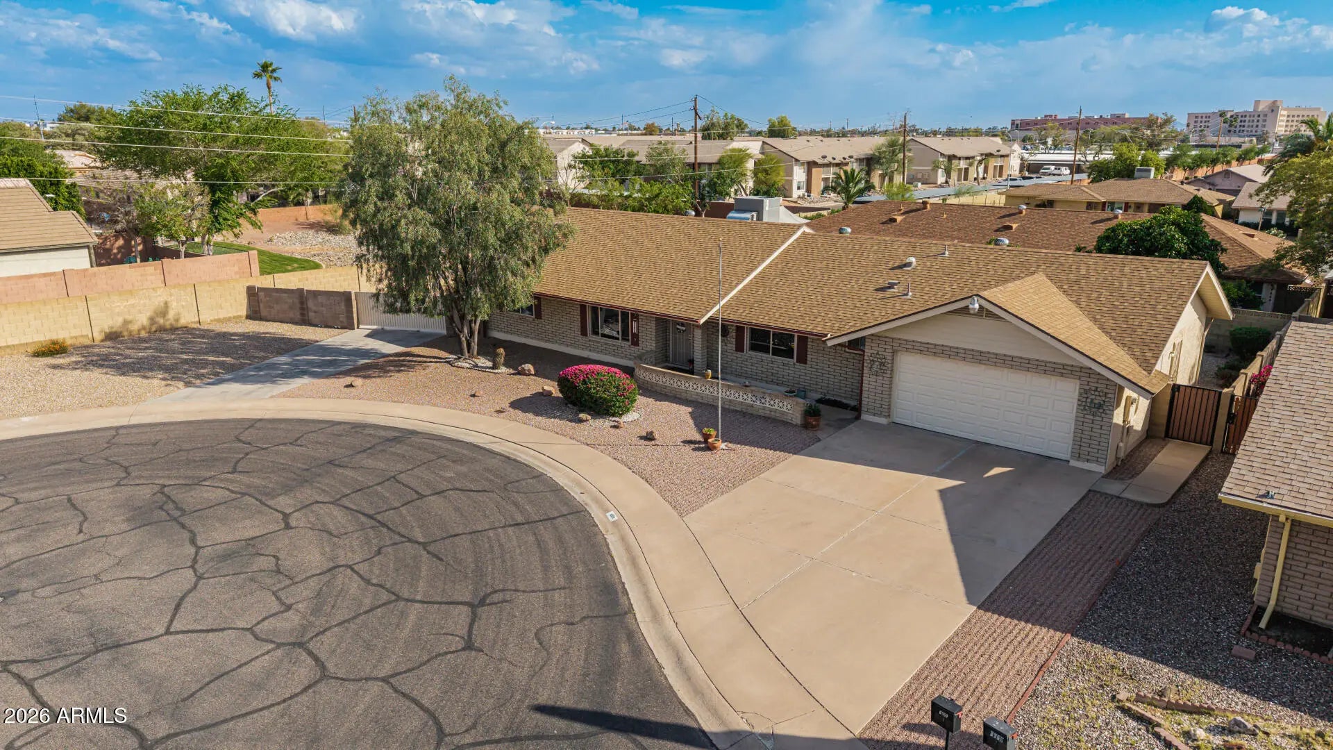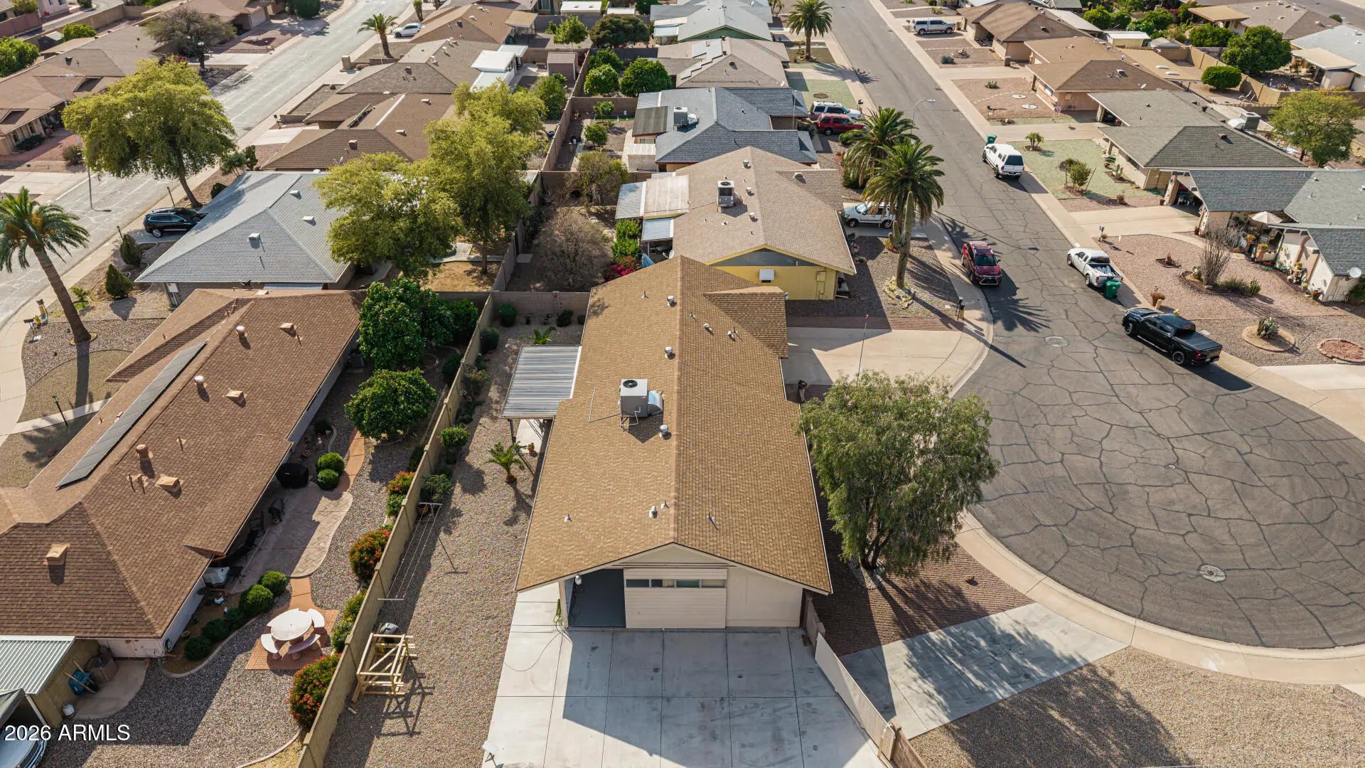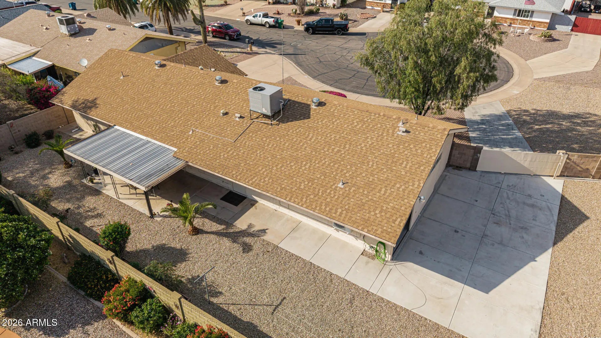 Fantastic single-level home in the highly sought-after active adult community of Velda Rose Estates! Situated on a quiet cul-de-sac and positioned on one of the largest lots in the neighborhood, this property offers exceptional privacy with no neighbors on one side. This well-maintained 2-bedroom, 2-bath home features a 2-car garage plus a rare RV garage with RV gate access. An extra-large concrete pad with added drainage was recently installed at the RV garage entrance for enhanced functionality and convenience. The RV garage also includes a mini-split system (negotiable with the right offer). A water softener is also negotiable. Inside, you'll find inviting living spaces filled with abundant natural light and neutral flooring throughout, creating a bright, open feel. The kitchen showcases stainless steel appliances, warm wood cabinetry, and ample storage space. The spacious primary suite includes a private ensuite bath for comfort and privacy. Step outside to a generously sized backyard featuring a covered patioperfect for relaxing or entertaining. Enjoy fantastic community amenities and a prime Mesa location close to shopping, dining, and medical facilities. This rare oversized lot with RV garage opportunity won't last!