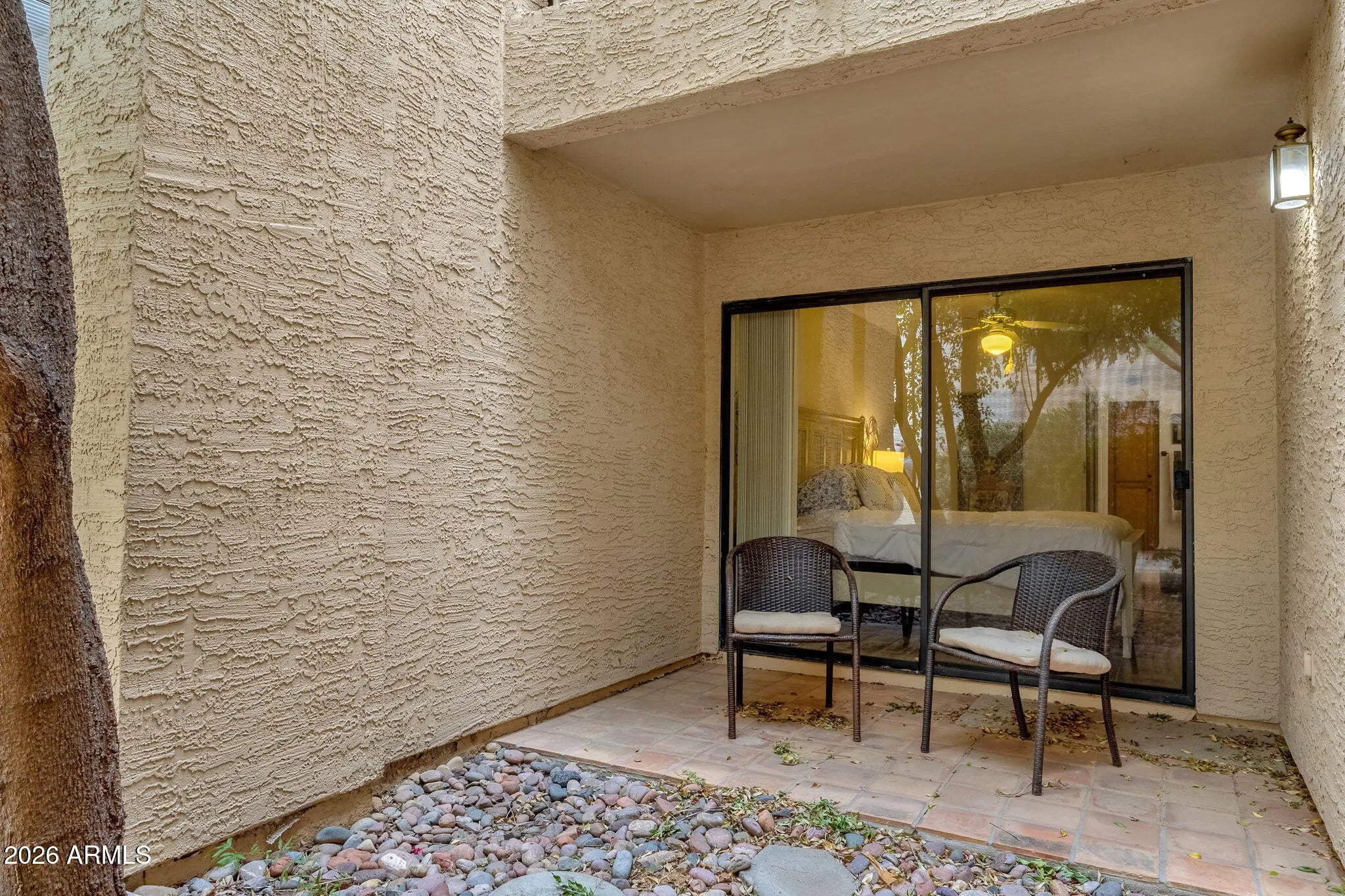 Discover easy, ground-level living in this 2-bedroom, 2-bath condo located in Scottsdale's highly desirable 85258 zip code. This first-floor unit features an open floor plan with tile and wood-look tile flooring, a cozy fireplace with a reclaimed wood mantel, and abundant natural light throughout. The kitchen is equipped with oak cabinetry and granite countertops, offering both style and functionality. The primary suite includes an en-suite bath with double sinks, a walk-in closet, and private patio access, while the guest bath comes with a walk-in shower. Step outside to 2 covered patios surrounded by mature palm trees and desert landscaping. The community offers a heated pool, and the unit includes one covered parking space conveniently located in front. Recent improvements include a new HVAC system (2024), updated shower fixtures, and tile flooring completed in 2023. Rentals are allowed with a one-month minimum, making this a great option for both full-time living and investment. Enjoy a prime location within walking distance to Mercado del Lago, the greenbelt walking and biking paths, and just minutes from Talking Stick Resort, Salt River Fields, Old Town Scottsdale, Kierland, and Scottsdale Quarter. Close proximity to major hospitals, the airport, shopping, dining, and top Scottsdale schools makes this home a standout for convenience and lifestyle.