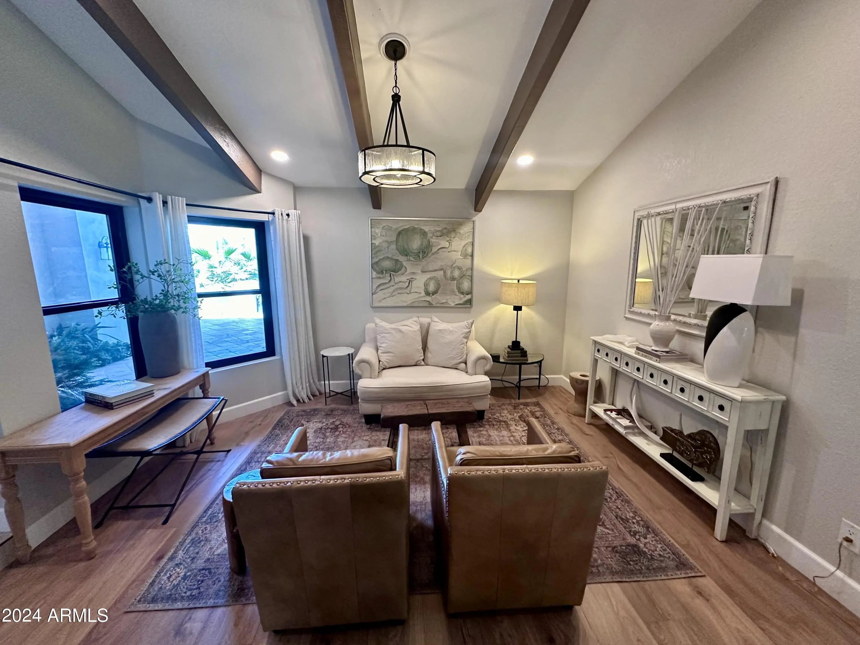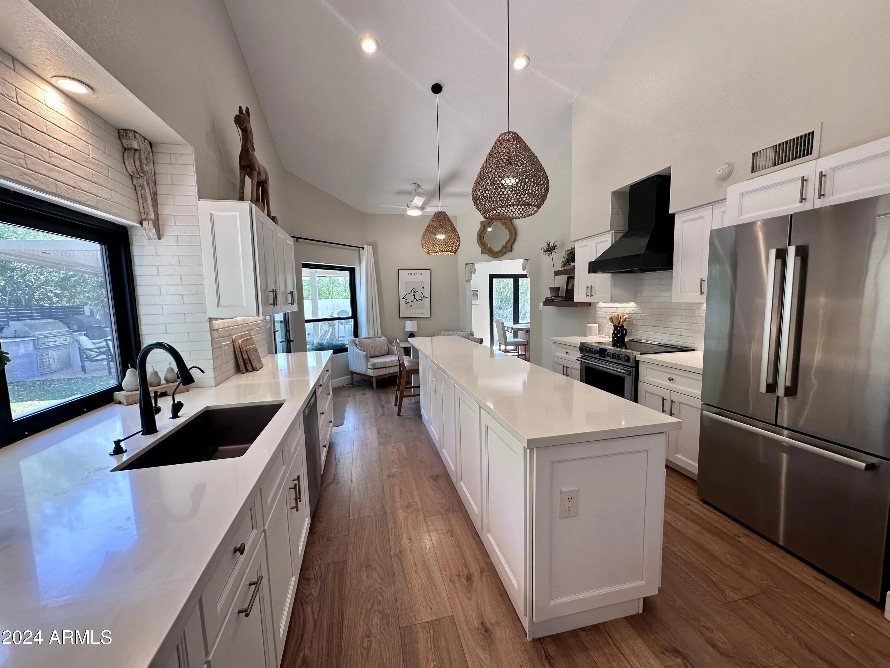 Tucked in a peaceful cul de sac & fully renovated, this McCormick Ranch area home designed by Surround Interiors blends modern luxury w/timeless elegance. No expense spared: new electrical, roofing, stucco, windows, flooring, doors, paint & includes a rare 3 car garage. The grand entrance features a spacious front courtyard w/outdoor fireplace before opening to a bright, airy floor plan with soaring vaulted ceilings & a dramatic multi slider that floods the home with natural light. The 26' x12' chef inspired kitchen is perfect for cooking, & entertaining. Butler's pantry includes sink & 2nd frig. The primary suite offers a spa style ensuite with large shower, tub & double vanity. The private backyard includes a pool w/water features, covered BBQ island w/tv area & mature tr