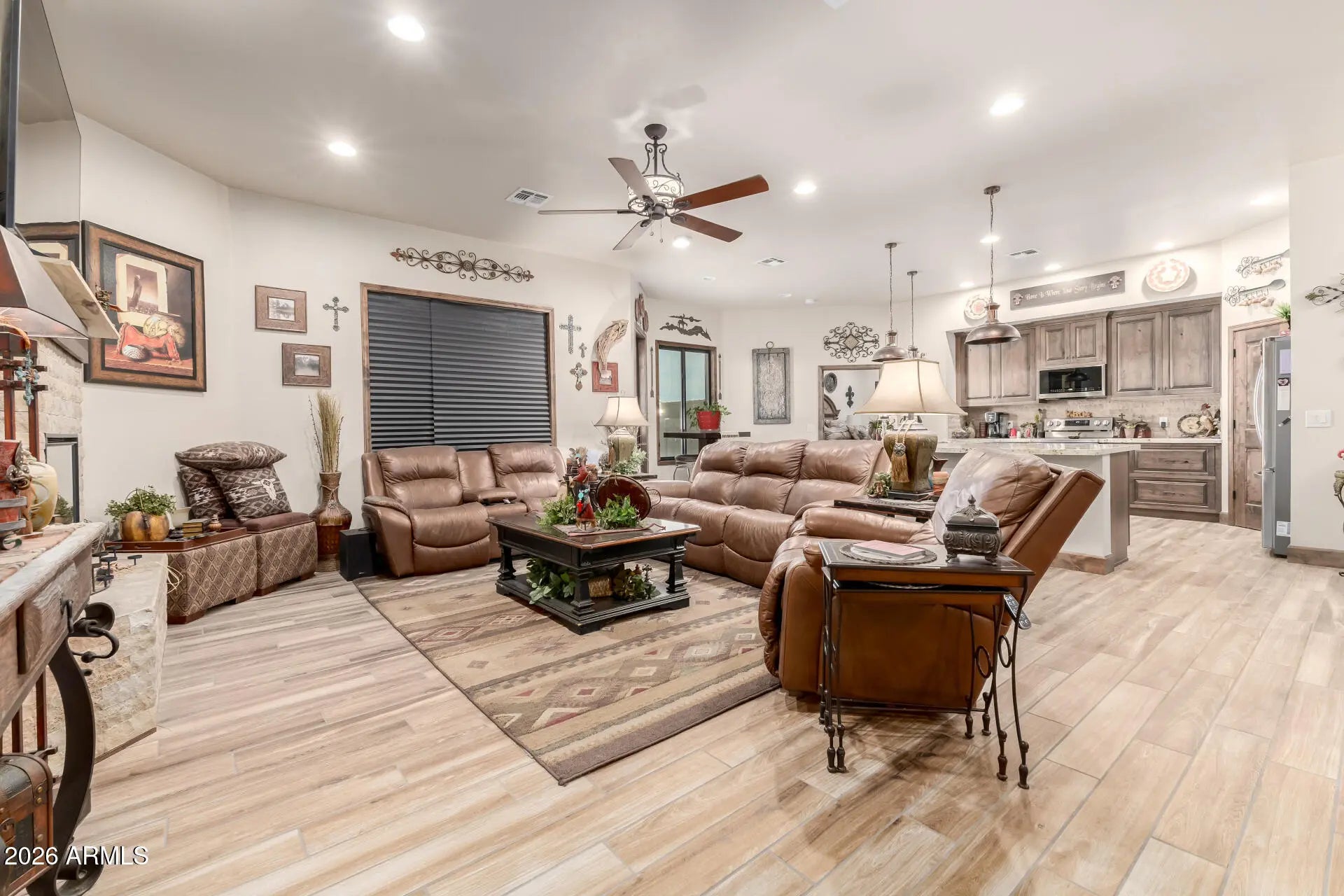 This is your chance to own this beautiful 3-bedroom home on a 1-acre lot with horse privileges! Explore the generous interior, showcasing inviting living spaces with wood-look tile plank flooring, contemporary lighting, a fireplace to keep you warm and cozy, & a soothing palette that makes you want to stay. The gourmet kitchen is a chef's delight, equipped with custom cabinetry, tile backsplash, beautiful granite counters, stainless steel appliances, and an expansive island perfect for entertaining. The main suite is a true retreat, offering a walk-in closet for easy organization & a private bathroom with dual sinks. The backyard is complete with a covered patio ideal for morning coffee and weekend grills, grassy area, &RV gates! RV barn with hookups, workshop, & arena. Bring your toys! for your animals, cars, storage, and projects! Conveniently close to parks and golfing! No HOA! This gem is a must-see!