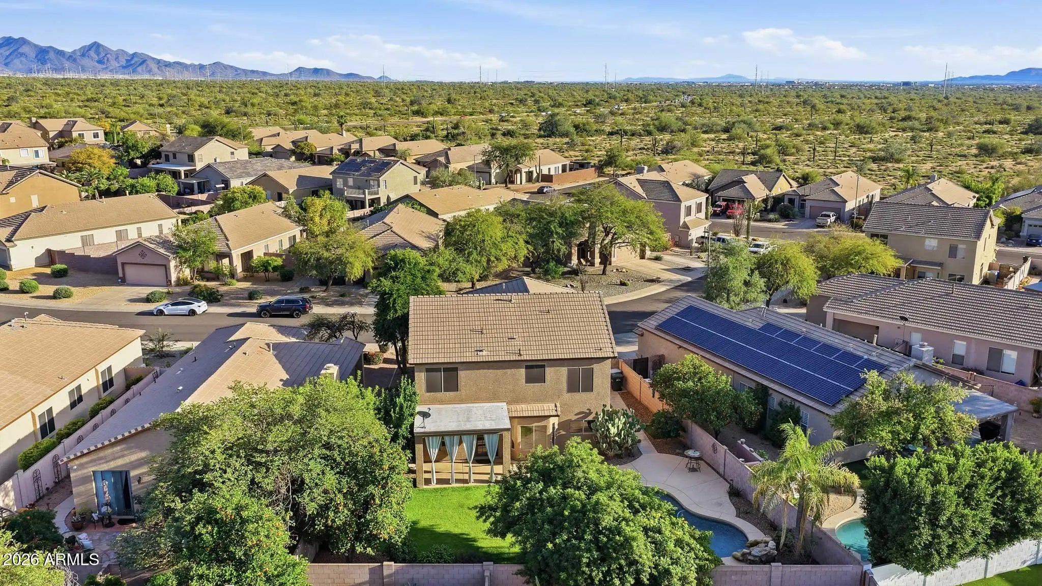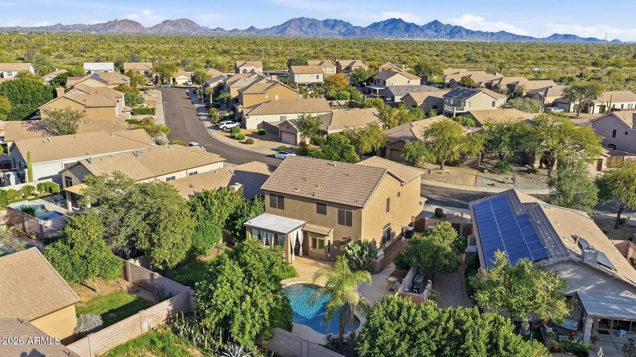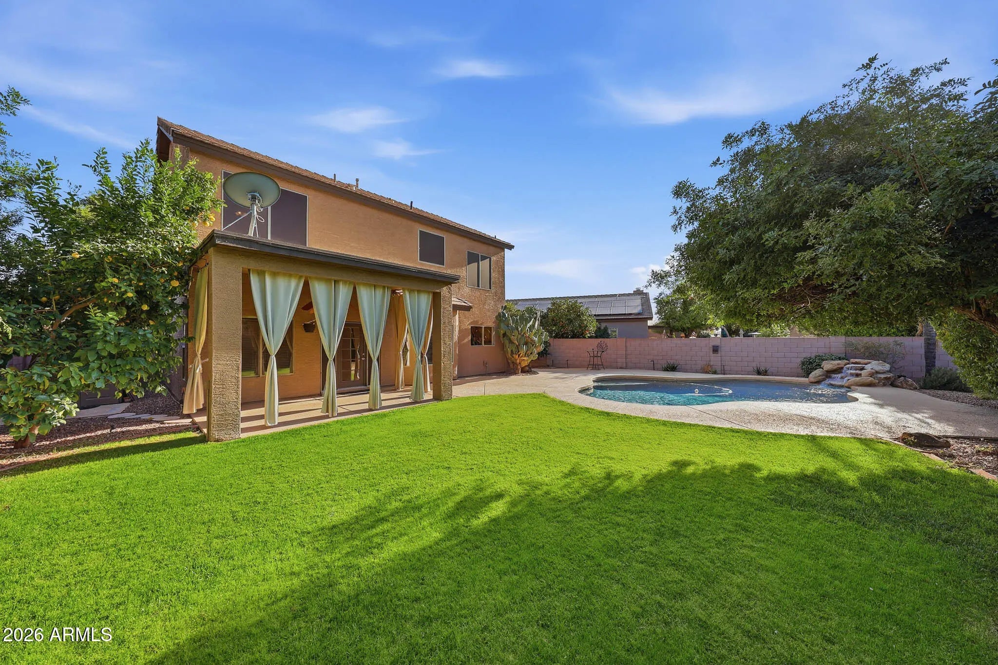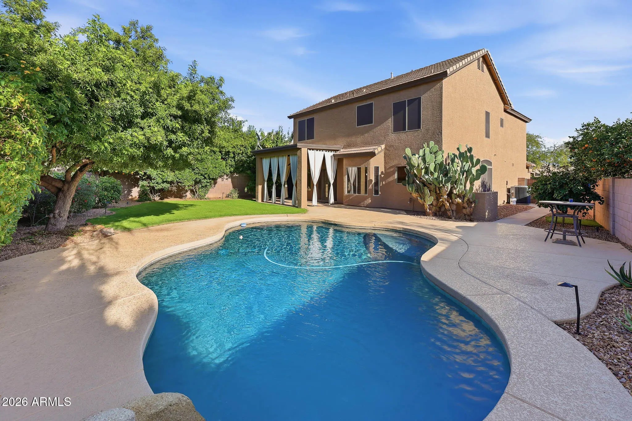 This beautifully maintained 4-bedroom, 2.5-bath home offers the perfect blend of comfort, functionality, and Arizona lifestyle living. From the moment you step inside, you'll appreciate the pride of ownership and thoughtful layout designed for both everyday living and entertaining. The spacious primary suite is a true retreat, featuring a large walk-in closet, a luxurious soaking tub, and plenty of room to unwind at the end of the day. The additional bedrooms provide flexibility for family, guests, or a home office. The heart of the home flows seamlessly into the backyard oasis, complete with a sparkling pool and tranquil water feature, perfect for relaxing weekends or hosting gatherings. The oversized backyard also features mature citrus trees, offering both shade and fresh fruit right from your own garden. Enjoy peace of mind with new appliances and a home that has been meticulously cared for. Located just minutes from shopping, dining, and entertainment at Desert Ridge Marketplace, you'll have everything you need within easy reach. Plus, the home is situated in one of the area's top-rated school districts, making it an exceptional opportunity for families.