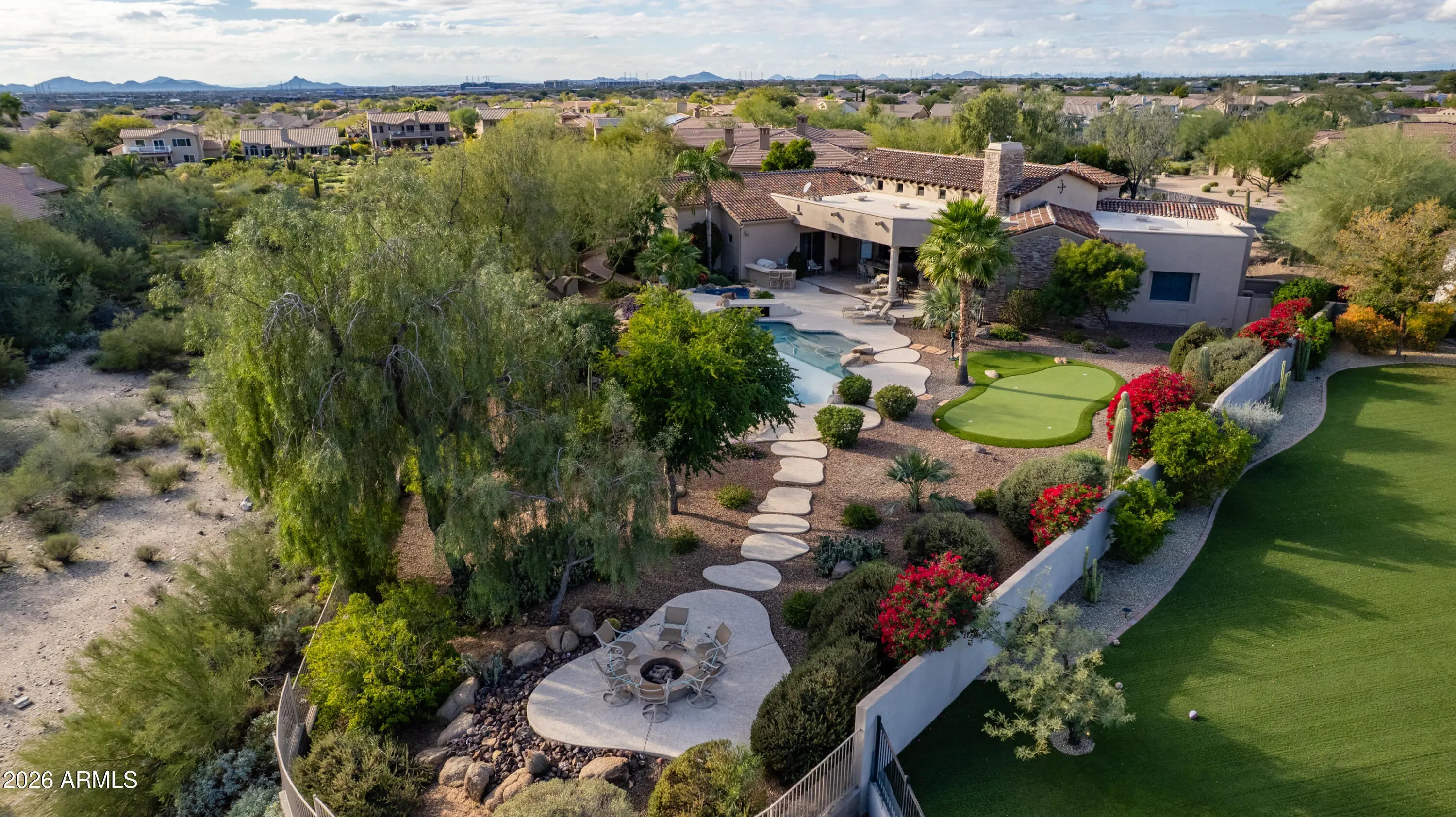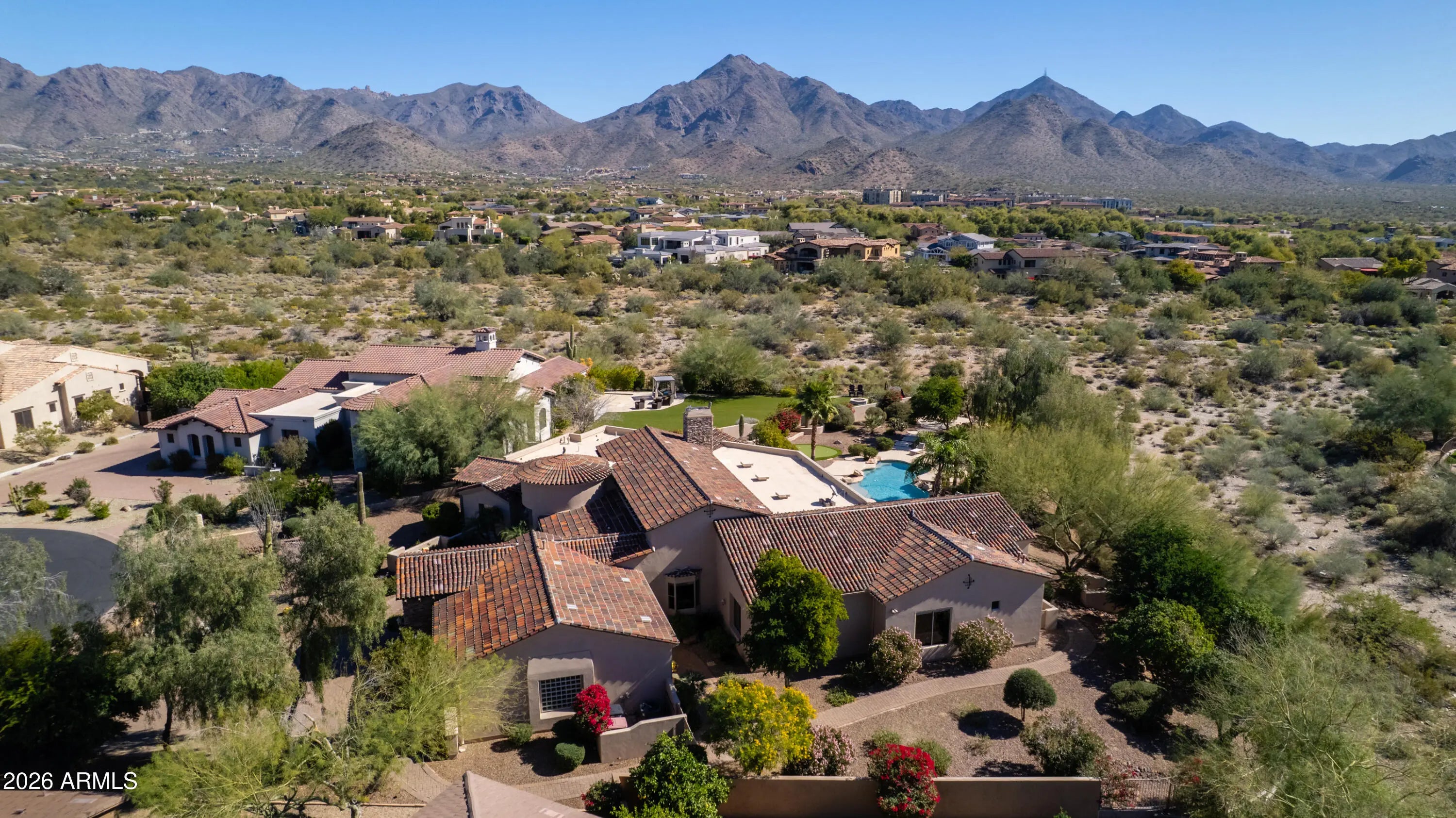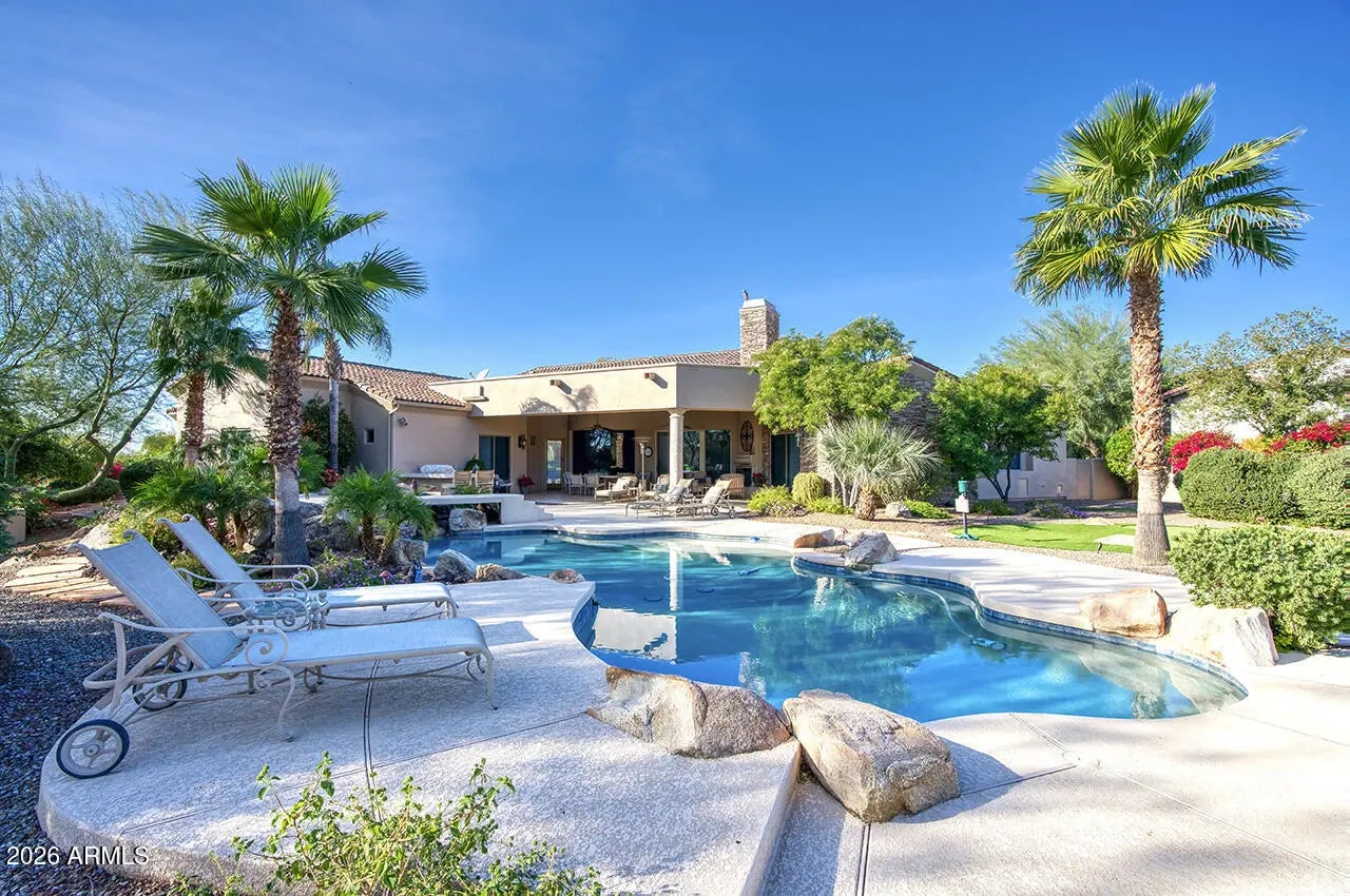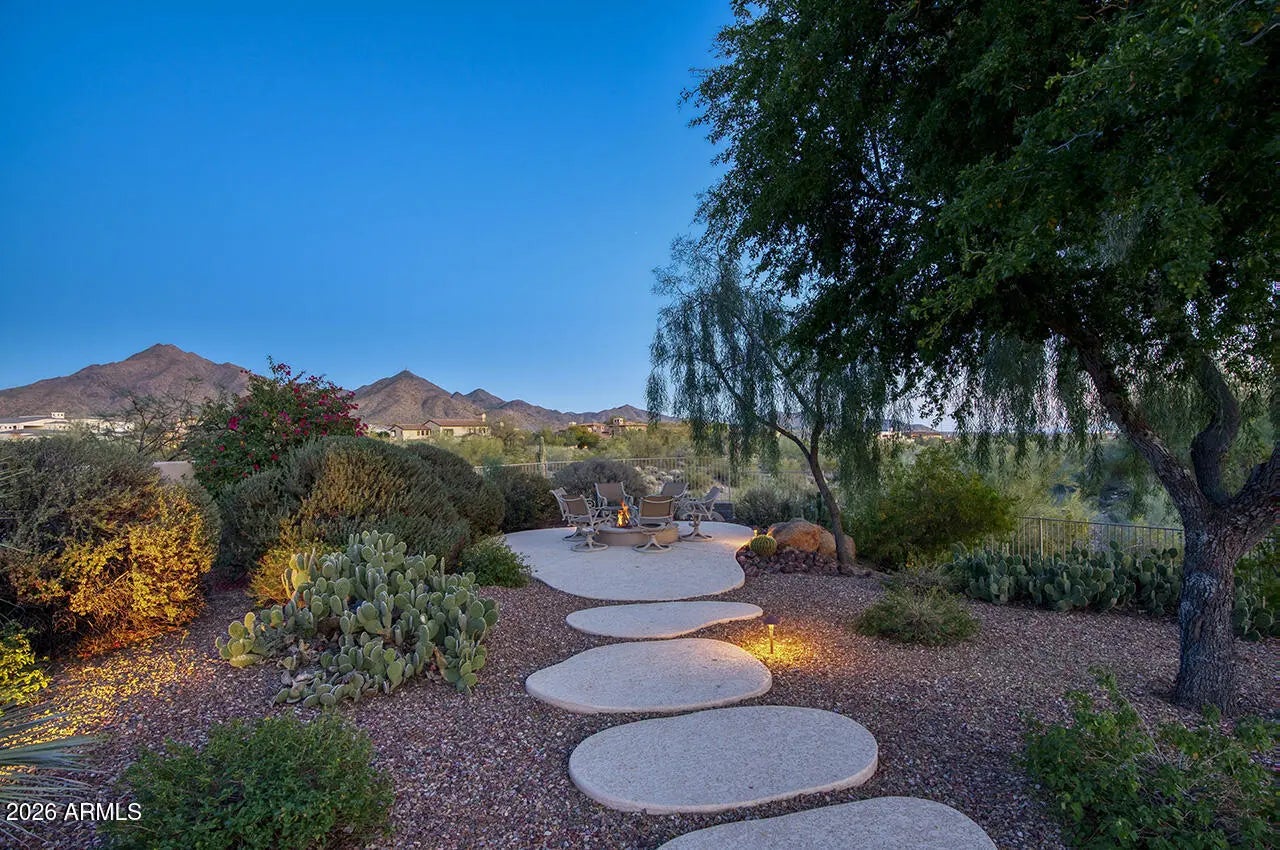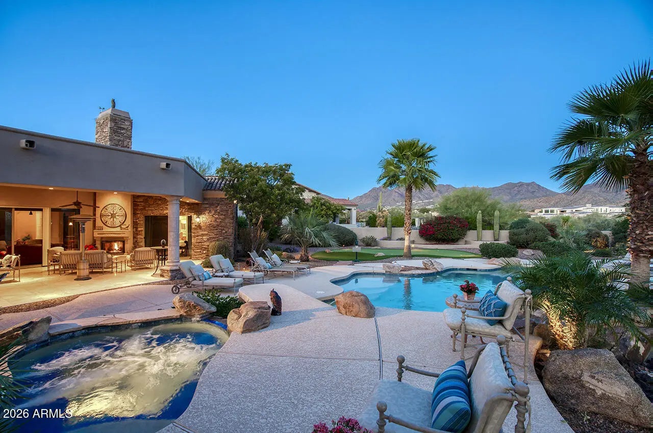 Nestled within the charming 23-home, all single-story gated enclave of Toscana, this desirable ranch estate is a true North Scottsdale jewel and one of the area's best-kept secrets. Set on an exceptional oversized lot, the home enjoys picturesque McDowell Mountain backdrop views and shimmering city light vistas, offering a rare sense of space, privacy, and presence within this intimate, one-level community. Ideally located immediately south of DC Ranch, the setting combines prestige, tranquility, and convenience. Designed for effortless living and entertaining, this meticulously maintained, one-owner residence offers a highly desirable floor plan featuring four bedrooms plus a den, thoughtfully arranged with a split owner's suite. Spacious living areas form the heart of the home, creating a seamless flow that enhances both everyday comfort and entertaining ease. Seamless indoor-outdoor living defines the lifestyle, with living spaces opening to a resort-style backyard that feels like a private retreat. Outdoors, enjoy an expansive covered patio, multiple lounging and entertaining areas, a putting green, fire pit, and a sparkling pool and spaperfect for relaxed afternoons or elegant evenings under the desert sky. The oversized lot provides exceptional space and privacy, elevating the sense of resort living in the heart of North Scottsdale.