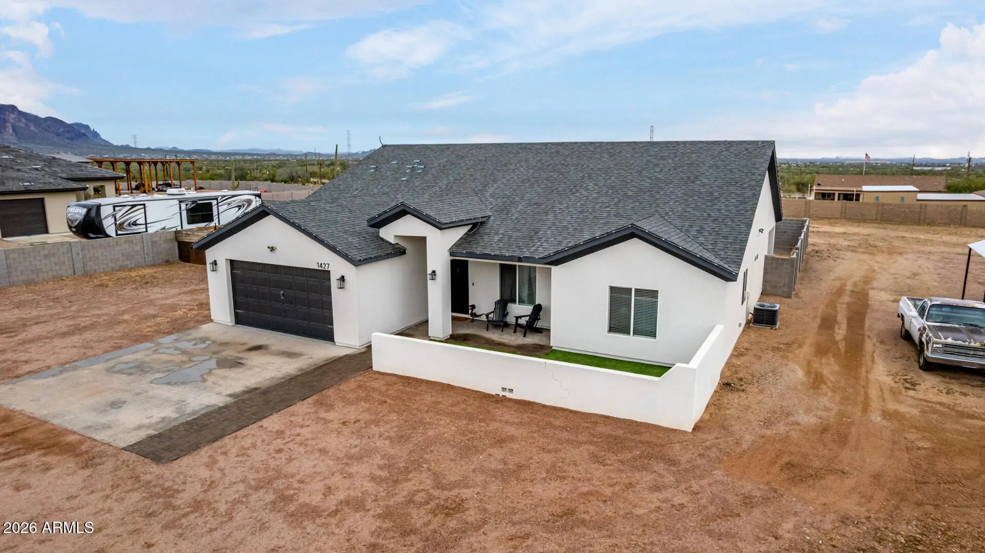 Welcome to your Arizona dream home! A beautifully crafted 2020 custom single-story residence offering the perfect blend of modern comfort, space, and breathtaking desert scenery. Situated on approximately 1.5 acres in unincorporated Pinal County with NO HOA, this 3-bedroom home delivers privacy, flexibility, and room for your toys, horses, pool, ADU, Casita, etc... all while being surrounded by iconic mountain views. Inside, the bright open-concept floor plan is designed for effortless living and entertaining. Vaulted ceilings, recessed lighting, ceiling fans, and wood-look tile flooring create a warm yet contemporary feel throughout. The gourmet kitchen is a true centerpiece, featuring stainless steel appliances, granite countertops, crown-molded cabinetry, a pantry, and a large island with breakfast bar seating, perfect for gatherings or everyday living. The spacious primary suite provides a relaxing retreat with plush carpeting, a spa-inspired ensuite bath with soaking tub, and a walk-in closet. Additional bedrooms offer flexibility for guests, hobbies, or a home office. Step outside to enjoy Arizona living at its finest. The covered patio overlooks a generous backyard framed by sweeping views of the legendary Superstition Mountains, an unbeatable backdrop for entertaining, relaxing, or watching desert sunsets. The land is prepped and ready to let your creativity take over. Use the covered parking structure for a gym, workshop, and more. Outdoor enthusiasts will love the proximity to recreation including Lost Dutchman State Park, Goldfield Ghost Town, Bulldog Canyon OHV Area, and Prospector Park, offering hiking, biking, riding, and off-road adventures just minutes away and accessible with your toys! This exceptional property captures the essence of the Arizona lifestyle, modern luxury, wide-open space, and stunning natural beauty, all in one unforgettable home.