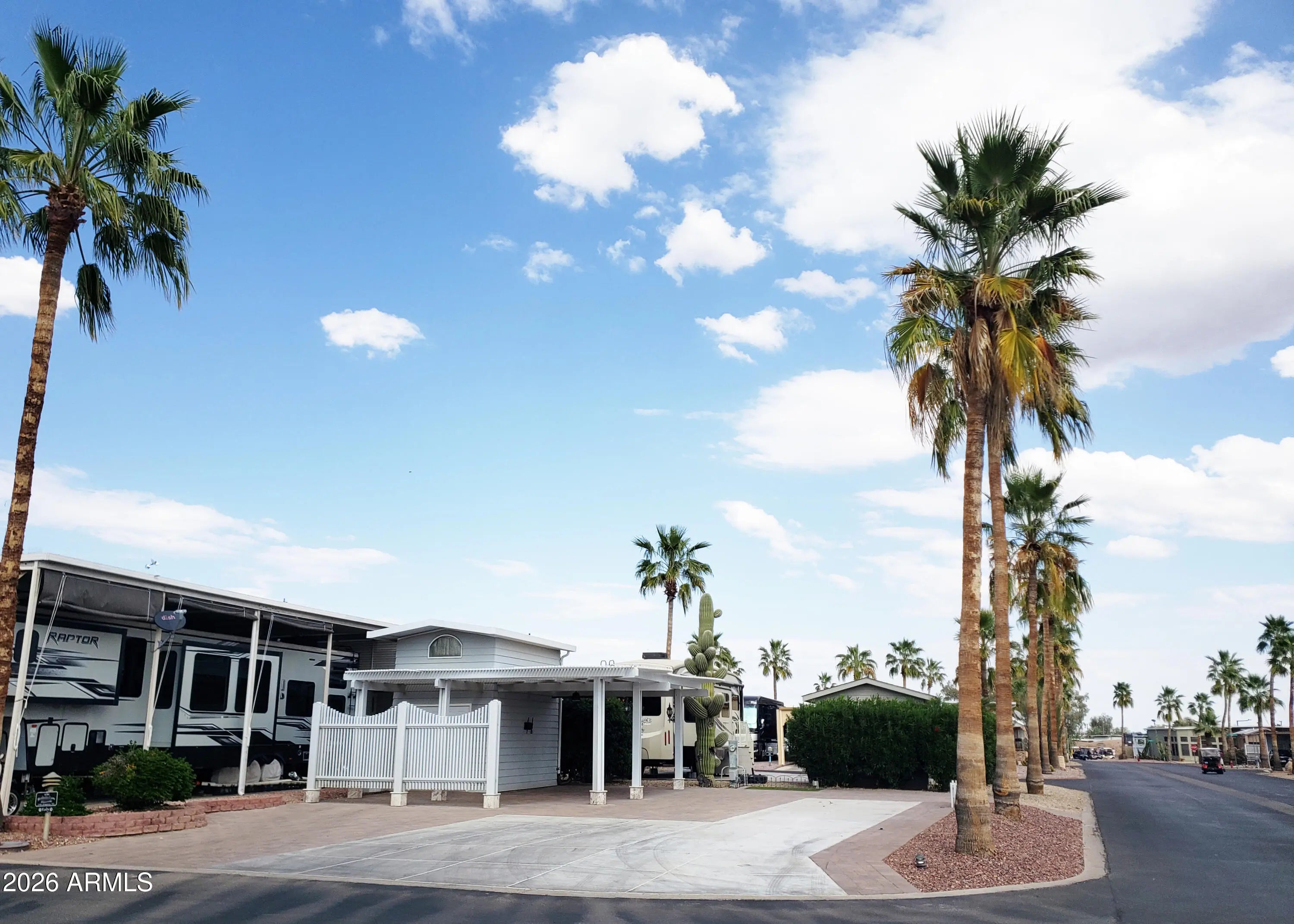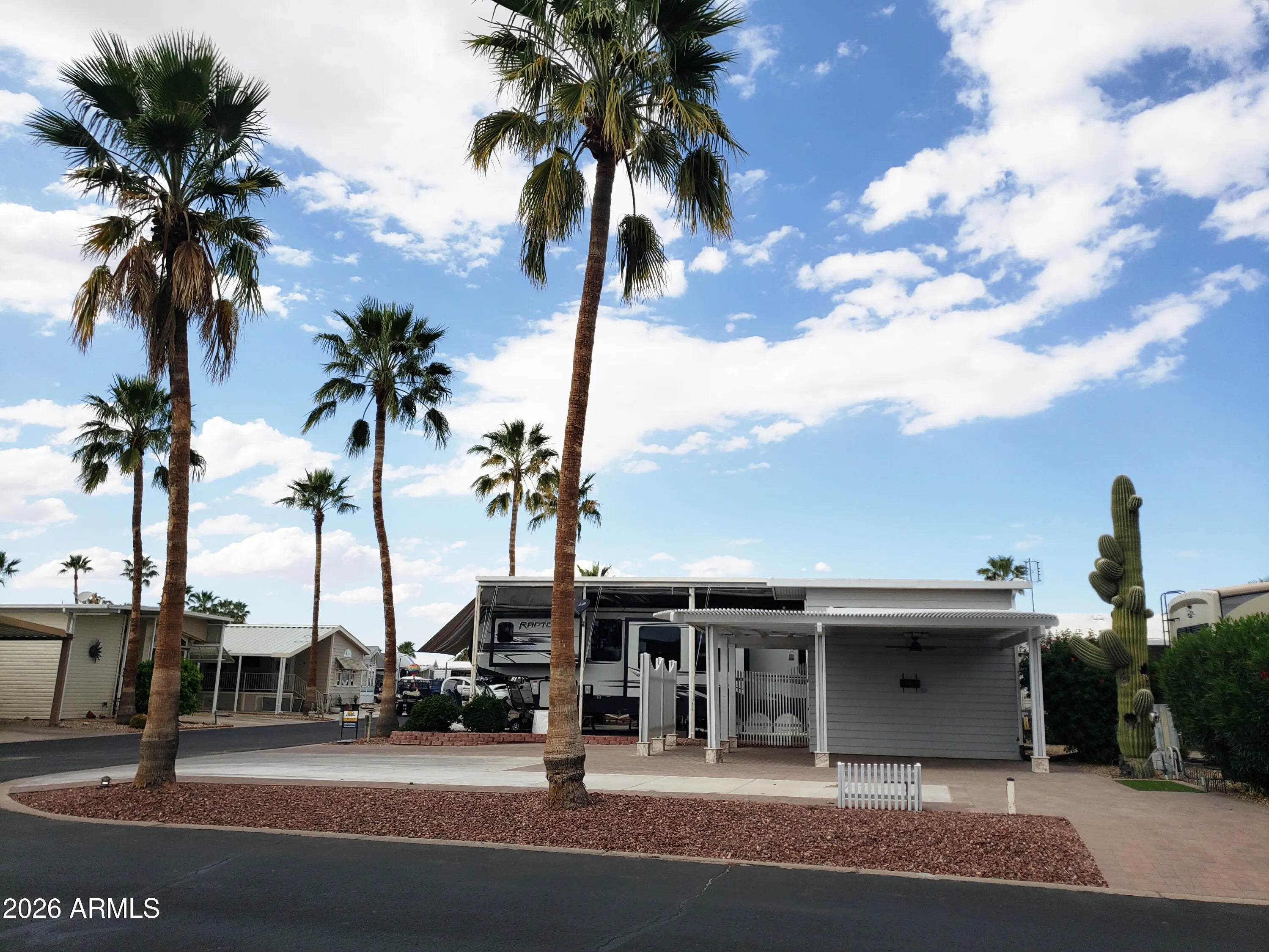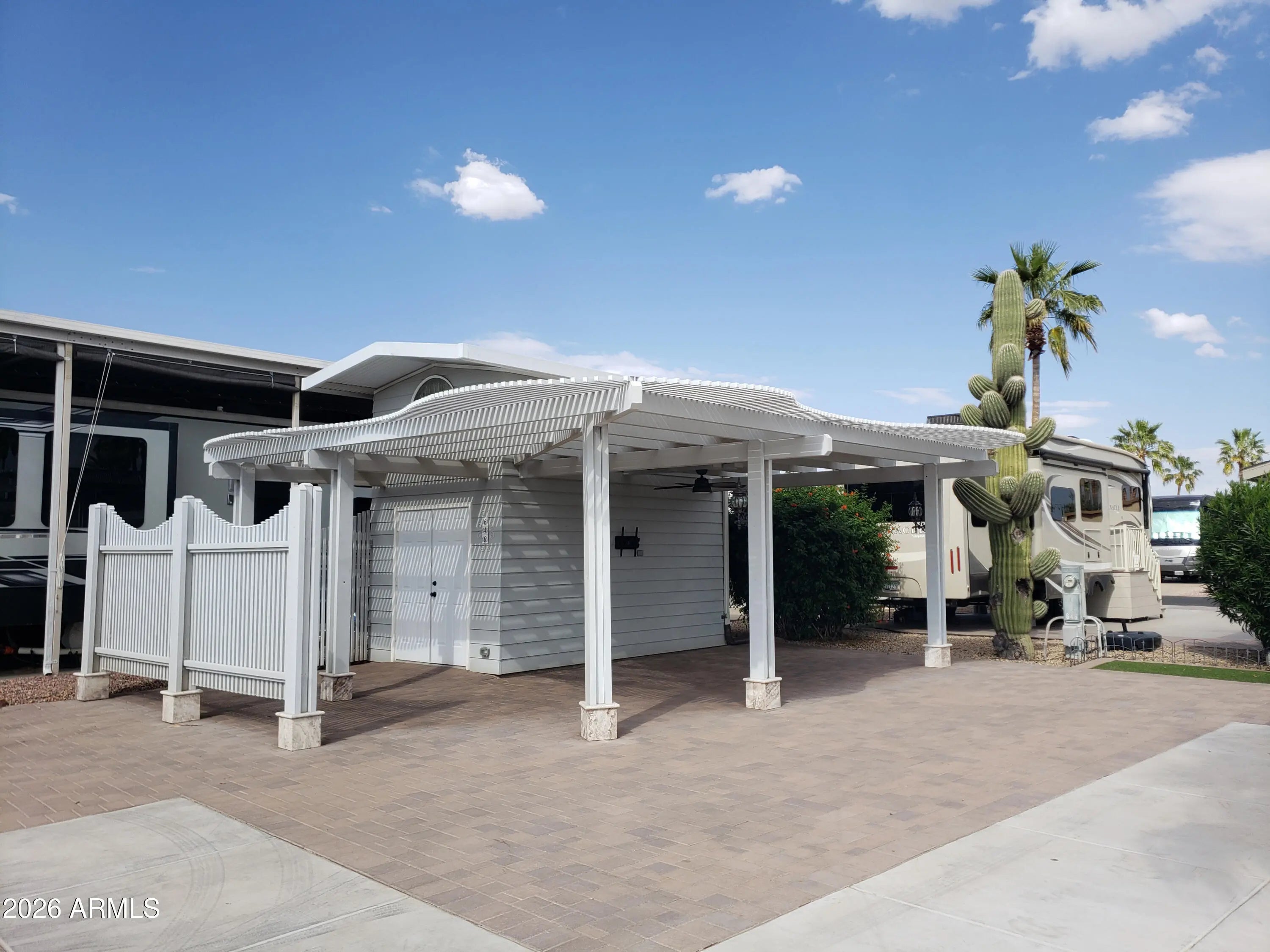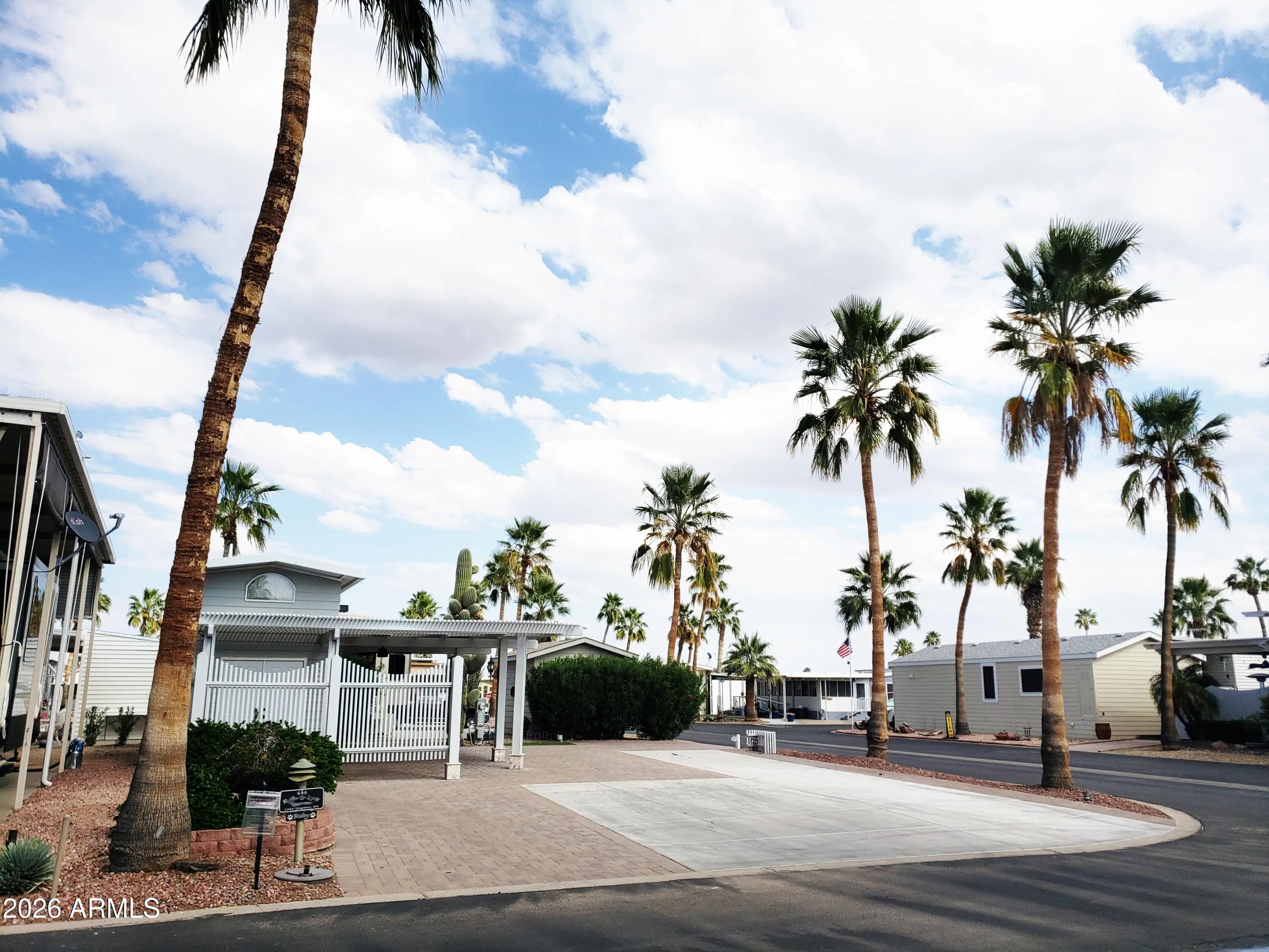 Happy Trails Lot 646 is a great RV Camping Lot in heart of the thriving, most active 55+ RV Resort in the Valley. Located on the corner of Dale Evans and Appaloosa, you won't miss any of the action as you're just steps away from the Cascade Pickleball Courts and Spa Center. Upgrades throughout the property include covered outdoor Lanai living room with extended slatted pergola, extensive paving, Golf Cart ramp, and fully featured Casita Shed that houses a stack Washer/Dryer, water closet, sink and pull down access to the Air Conditioned loft-storage area above. Ceiling Fan, Decor Lighting, Privacy wall and timed landcape irrigation enhance this Desert Resort Oasis. Adorned with 3 beautiful palms, flowered Oleander and a mature Saguaro Cactus, this lot is a show piece. Room for any size & style RV. The affordable HOA fee includeds 24 hour gaurd security, unmetered water, twice weekly refuse service and access to Pickleball & Tennis Courts, Multiple Pools and Spas, Fitness Center, a Host of Craft Clubs, and Restaurant. Lots of Live Entertainment and tons of get-togethers mean there's never a dull moment. Come see what the Happy Trails Lifestyle is all about!