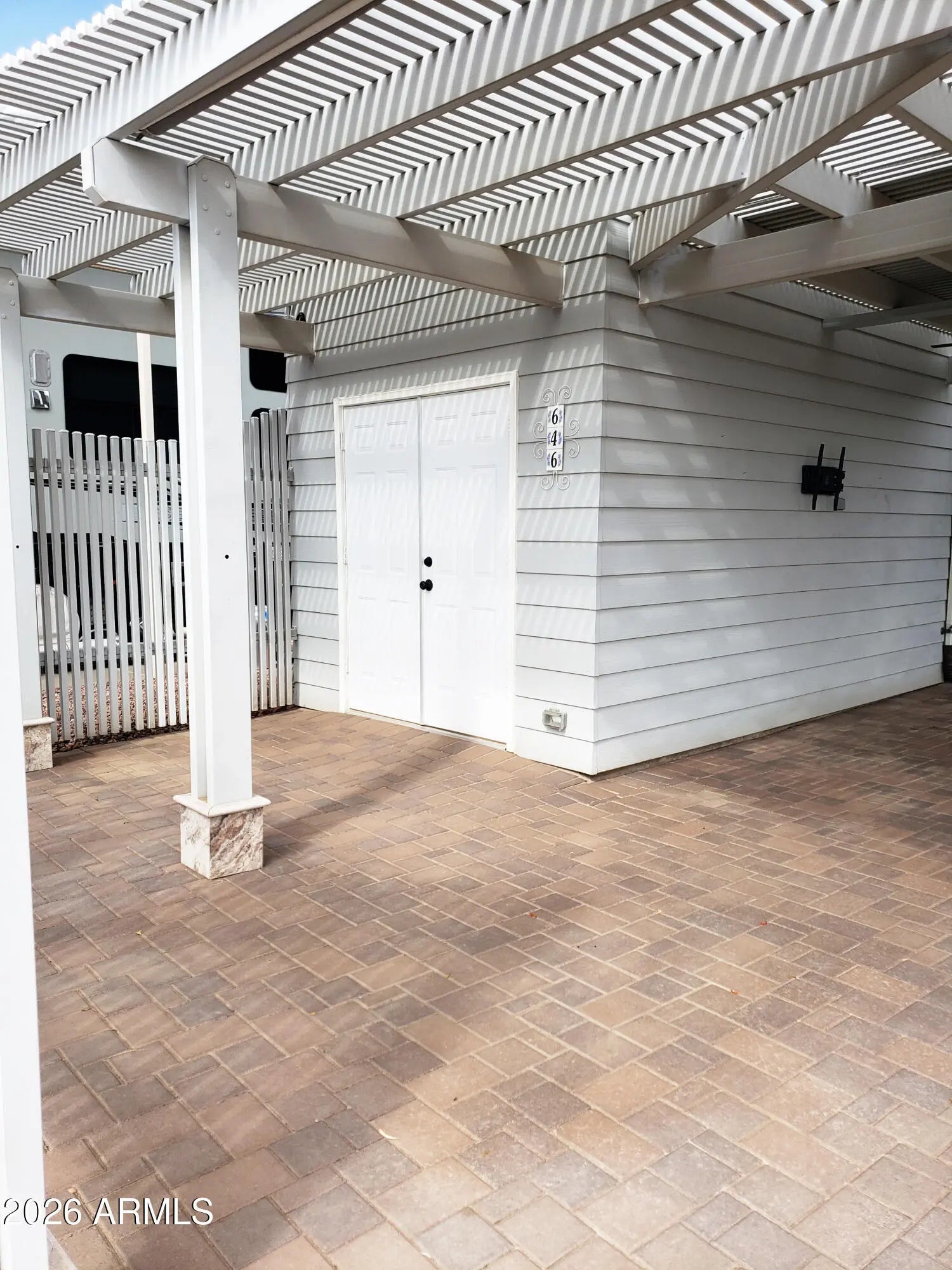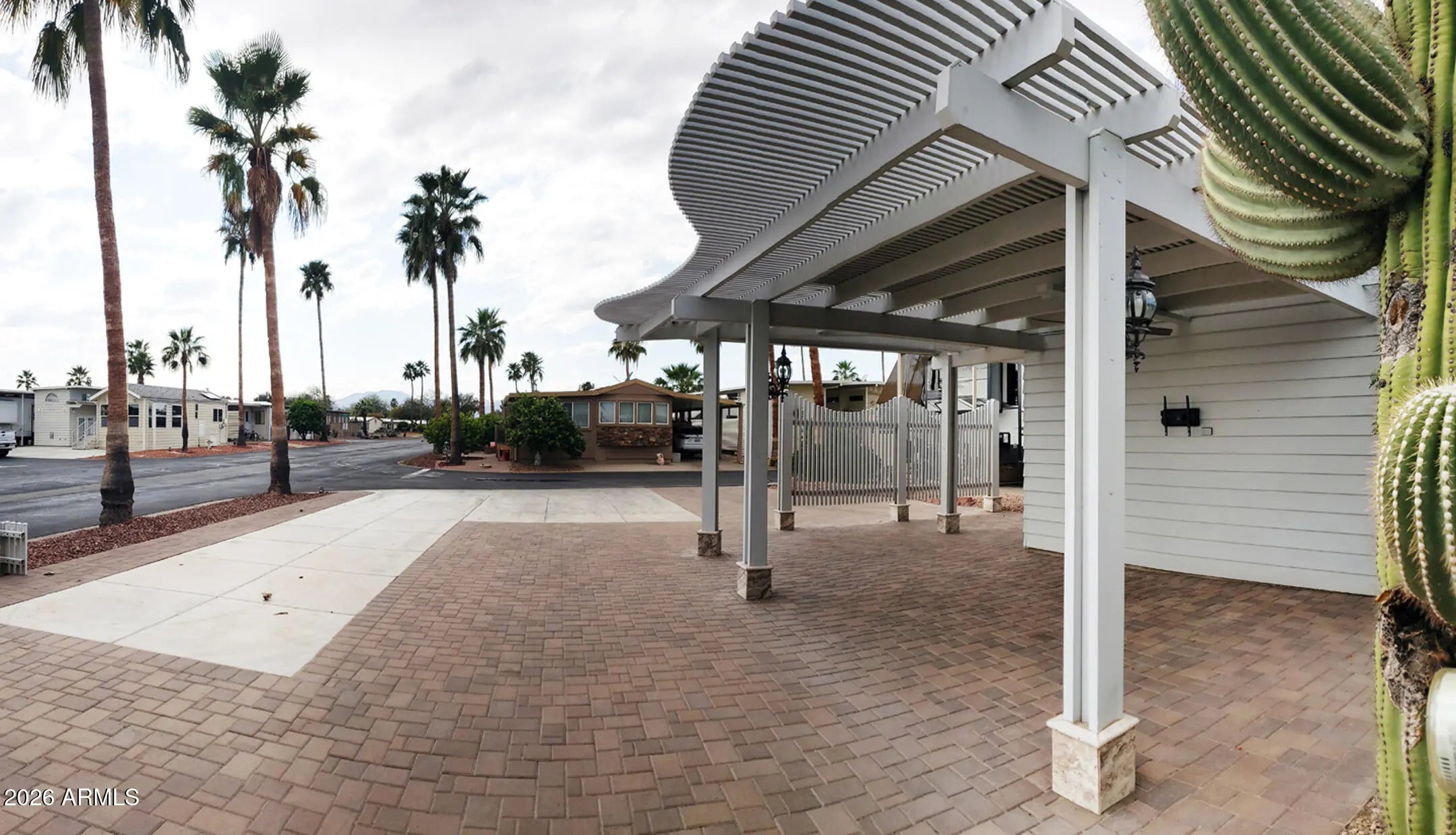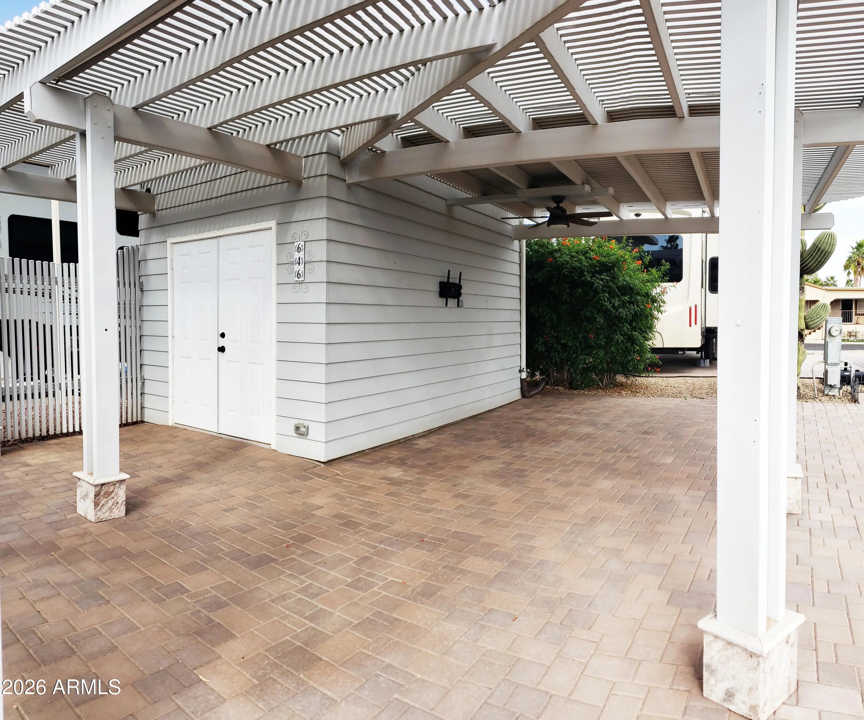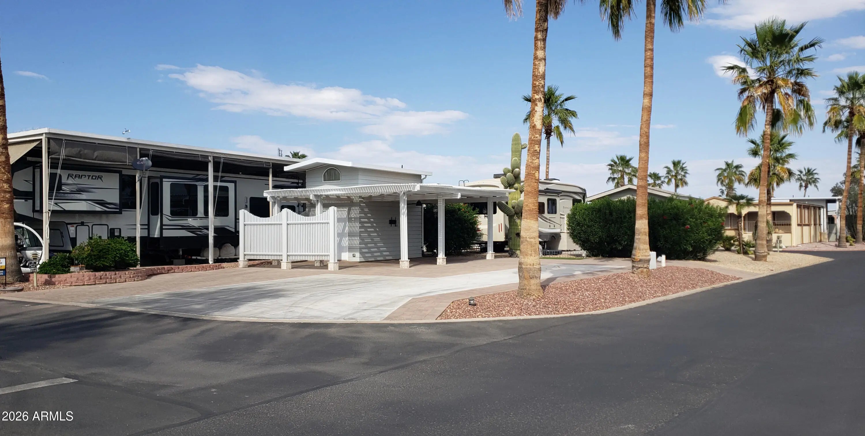 Happy Trails Lot 646 is a great RV Camping Lot in heart of the thriving, most active 55+ RV Resort in the Valley. Located on the corner of Dale Evans and Appaloosa, you won't miss any of the action as you're just steps away from the Cascade Pickleball Courts and Spa Center. Upgrades throughout the property include covered outdoor Lanai living room with extended slatted pergola, extensive paving, Golf Cart ramp, and fully featured Casita Shed that houses a stack Washer/Dryer, water closet, sink and pull down access to the Air Conditioned loft-storage area above. Ceiling Fan, Decor Lighting, Privacy wall and timed landcape irrigation enhance this Desert Resort Oasis. Adorned with 3 beautiful palms, flowered Oleander and a mature Saguaro Cactus, this lot is a show piece. Room for any size & style RV. The affordable HOA fee includeds 24 hour gaurd security, unmetered water, twice weekly refuse service and access to Pickleball & Tennis Courts, Multiple Pools and Spas, Fitness Center, a Host of Craft Clubs, and Restaurant. Lots of Live Entertainment and tons of get-togethers mean there's never a dull moment. Come see what the Happy Trails Lifestyle is all about!