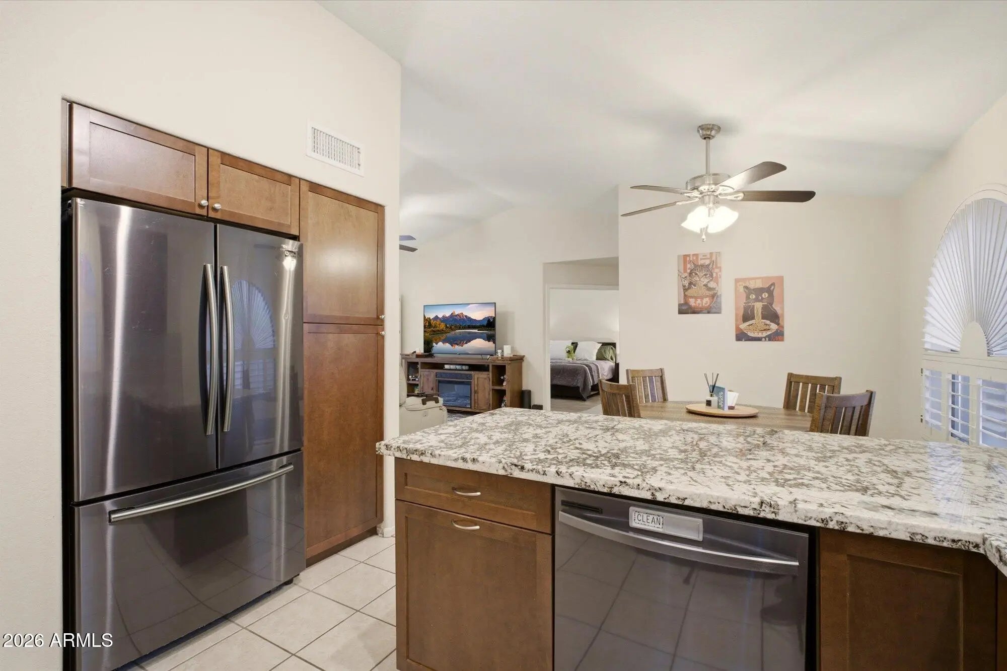 Amazing value in Desert Ridge! This beautifully updated, split-floor plan home shows true pride of ownership. Features include tile flooring throughout, upgraded cabinetry, granite countertops, stainless steel Samsung appliances, plantation shutters, and neutral paint with modern baseboards. The private backyard is low-maintenance with turf, pavers, a covered patio, and mature fruit trees. Major updates include a NEW ROOF (2026), fresh exterior paint (2025), water heater (2024), and cabinetry, countertops, interior paint, and flooring (2022). Ideally located near everything you need, including biking & walking paths, first-rate schools, Desert Ridge Marketplace, High Street, Wildfire Golf Club, Cashman Park, Loop 101/SR 51, and more!