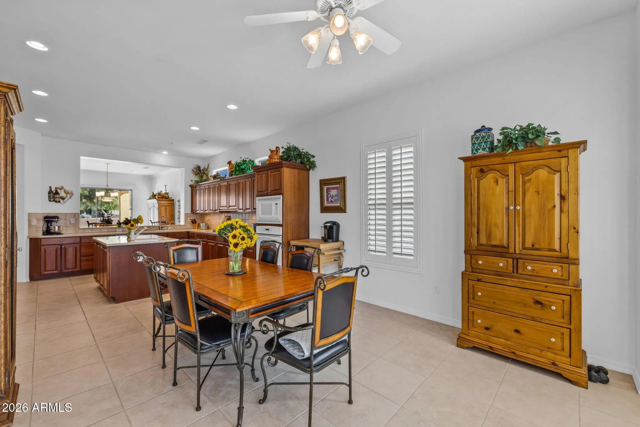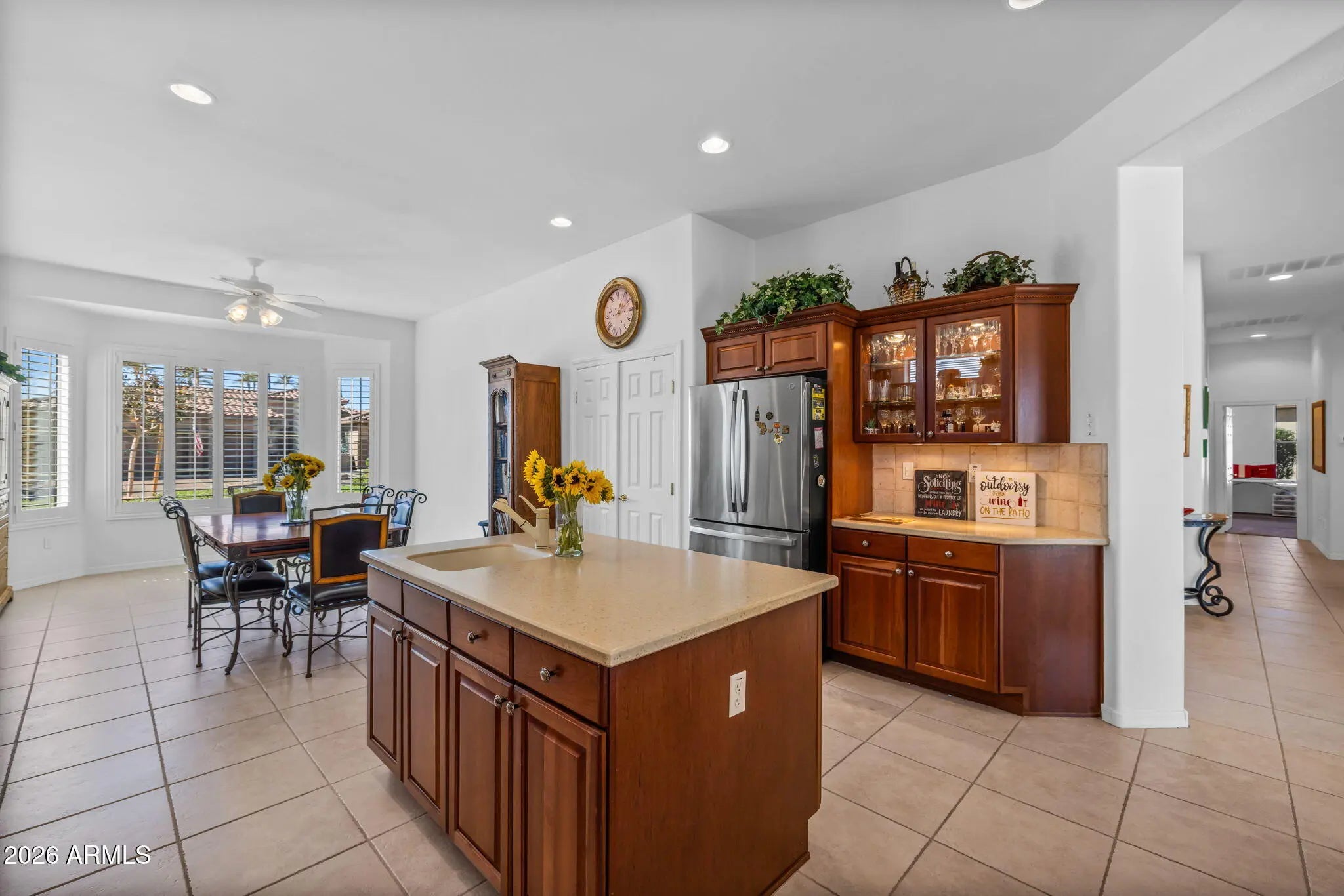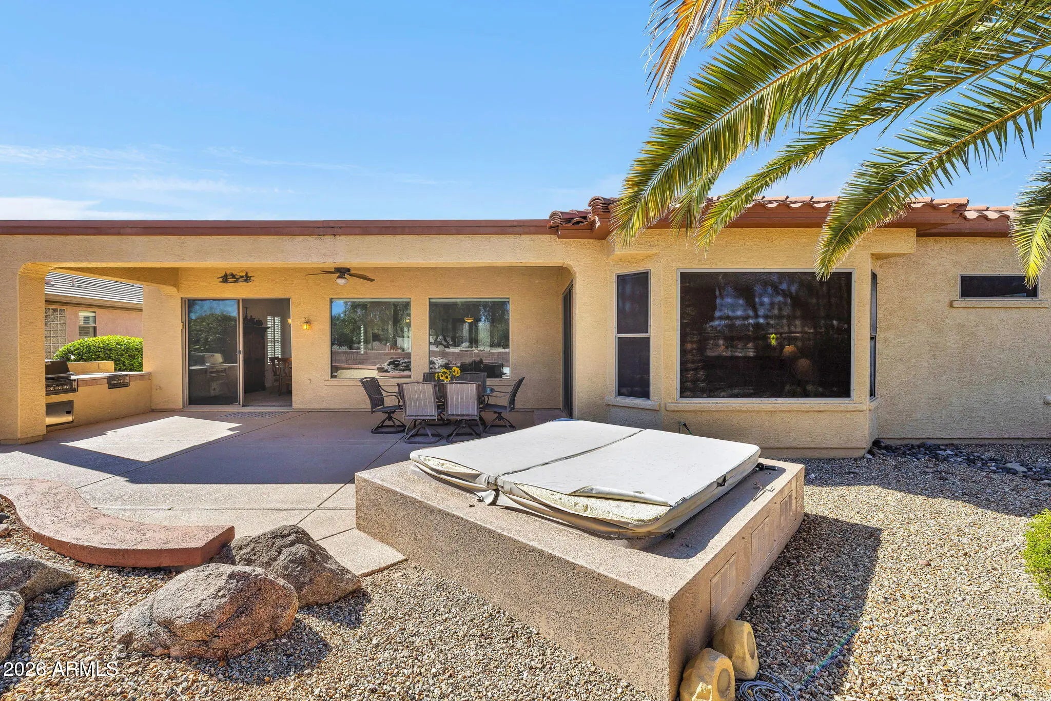 Del Webb Ashbury Estate model offering 3 bedrooms and 2.5 baths with a layout designed for comfortable Arizona active-adult living and effortless entertaining. From the inviting front courtyard patio to the extended rear patio, this home delivers exceptional indoor-outdoor flow and welcoming guest spaces. The open great room features a custom built-in and connects seamlessly to a well-appointed kitchen with stainless steel appliances, gas range, cherry cabinetry, French-door refrigerator, solid-surface countertops, a large island, and an oversized breakfast nook--ideal for casual dining and gatherings. The spacious primary suite includes a private patio door for easy outdoor access. The guest bath has been tastefully remodeled, offering updated style and function. Enjoy added privacy with no backyard neighbors and no back-to-back homes. The extended covered patio is perfect for relaxing or entertaining, complete with a spa and soothing water feature. The garage is sized to comfortably accommodate an extended cab and extended bed truckan uncommon and valuable feature. A well-maintained, guest-ready home in the desirable Del Webb community, blending privacy, comfort, and Arizona lifestyle appeal.