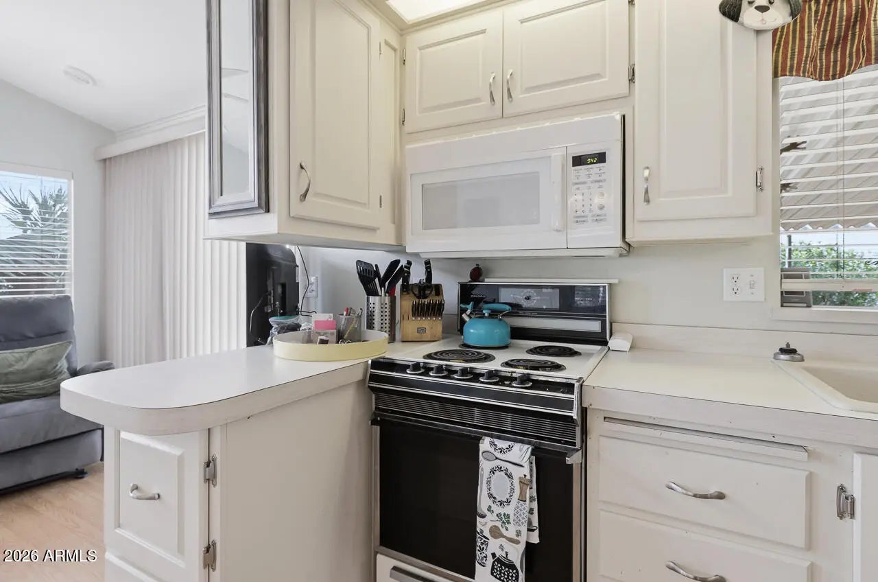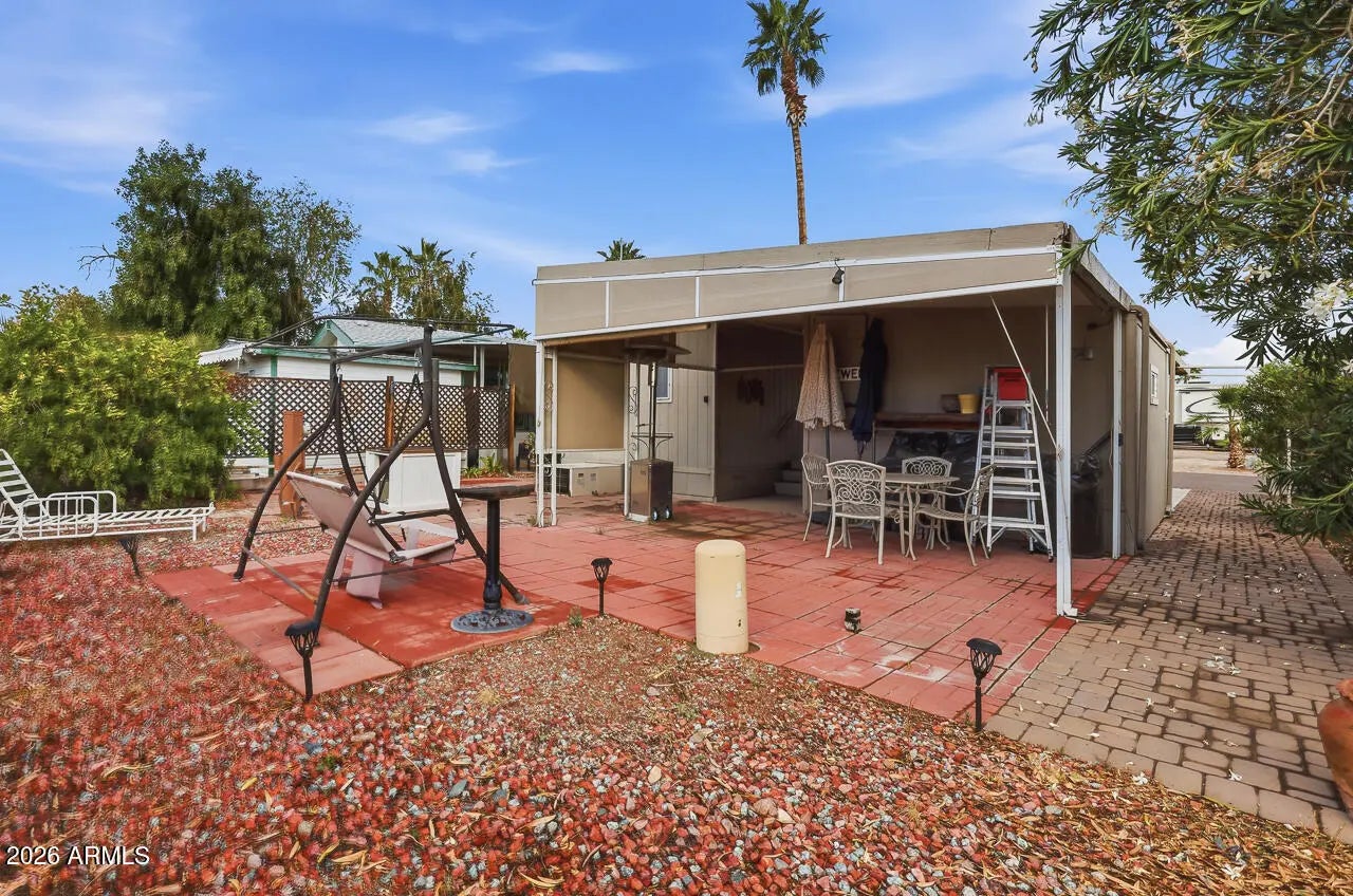TIRED OF LEASING YOUR LAND? Come see this newly listed Park Model Home with land. Pueblo El Mirage RV & Golf Resort offers the best of both worlds: affordability and freedom of a low-maintenance lifestyle. This lock and leave, fully furnished, gently lived-in manufactured home, is the perfect choice for active adults. A large workshop doubles as a golfcart garage and includes plenty of storage and a washer/dryer. This home offers a semi-private backyard area to relax and enjoy the beautiful Arizona weather. Pueblo El Mirage is a vibrant 55+ community offering resort-style amenities: championship golf, fitness center, swimming pools, sports courts, clubs, and social events. Come see what your $372 per quarter community membership fee buys.