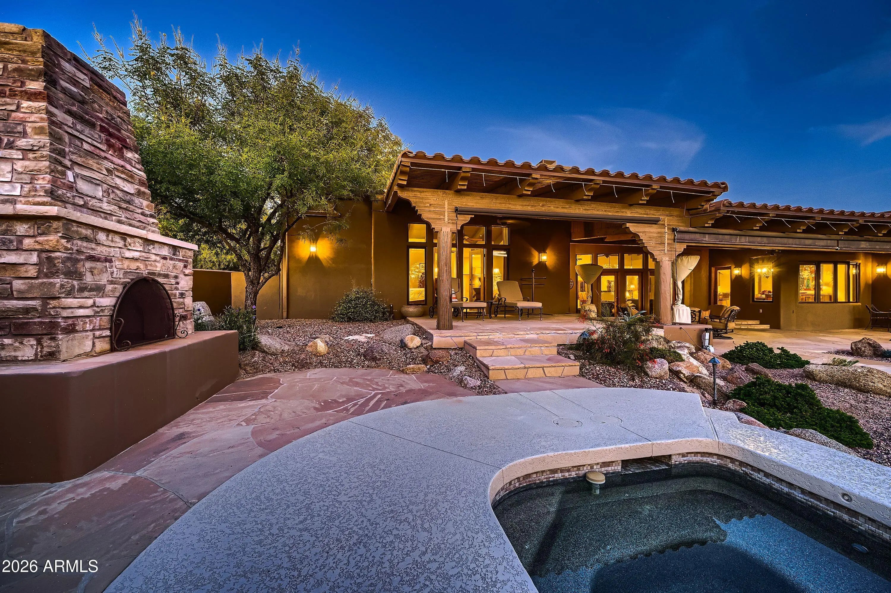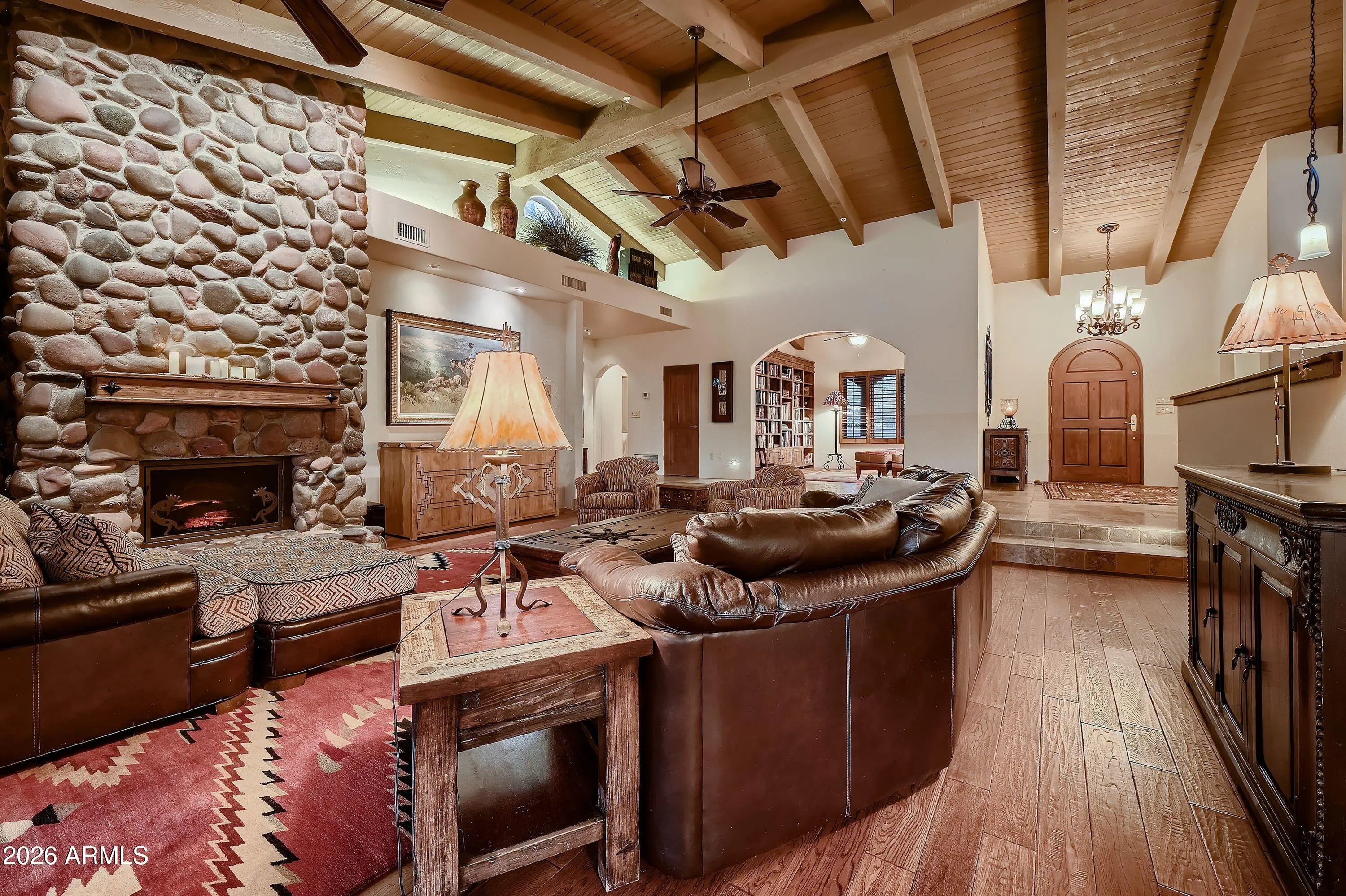 Soaring ceilings and authentic Southwestern charm set the tone the moment you enter this Scottsdale estate. Situated on 1.7 private acres in a prime location, this 4,500+ square foot residence offers five spacious bedrooms and four full bathrooms. The expansive primary suite is a true retreat, complete with its own fireplace and French doors that open directly to the spa. Just steps from the pool, the charming 307-square-foot casita provides the perfect space for guests or a private office. Architectural details shine throughout, highlighted by a striking stone fireplace that anchors the main living area. The warm and inviting library/den offers a cozy escape, ideal for quiet evenings or working from home. Owned solar panels mean minimal electric bills, while the circular driveway and temperature-controlled four-car garage provide both functionality and impressive curb appeal. Enjoy breathtaking Arizona sunsets from the private front courtyard fireplace or take in panoramic 360-degree views from the view deck. Move in and enjoy it as it is, or update to reflect your personal style - the possibilities are endless.