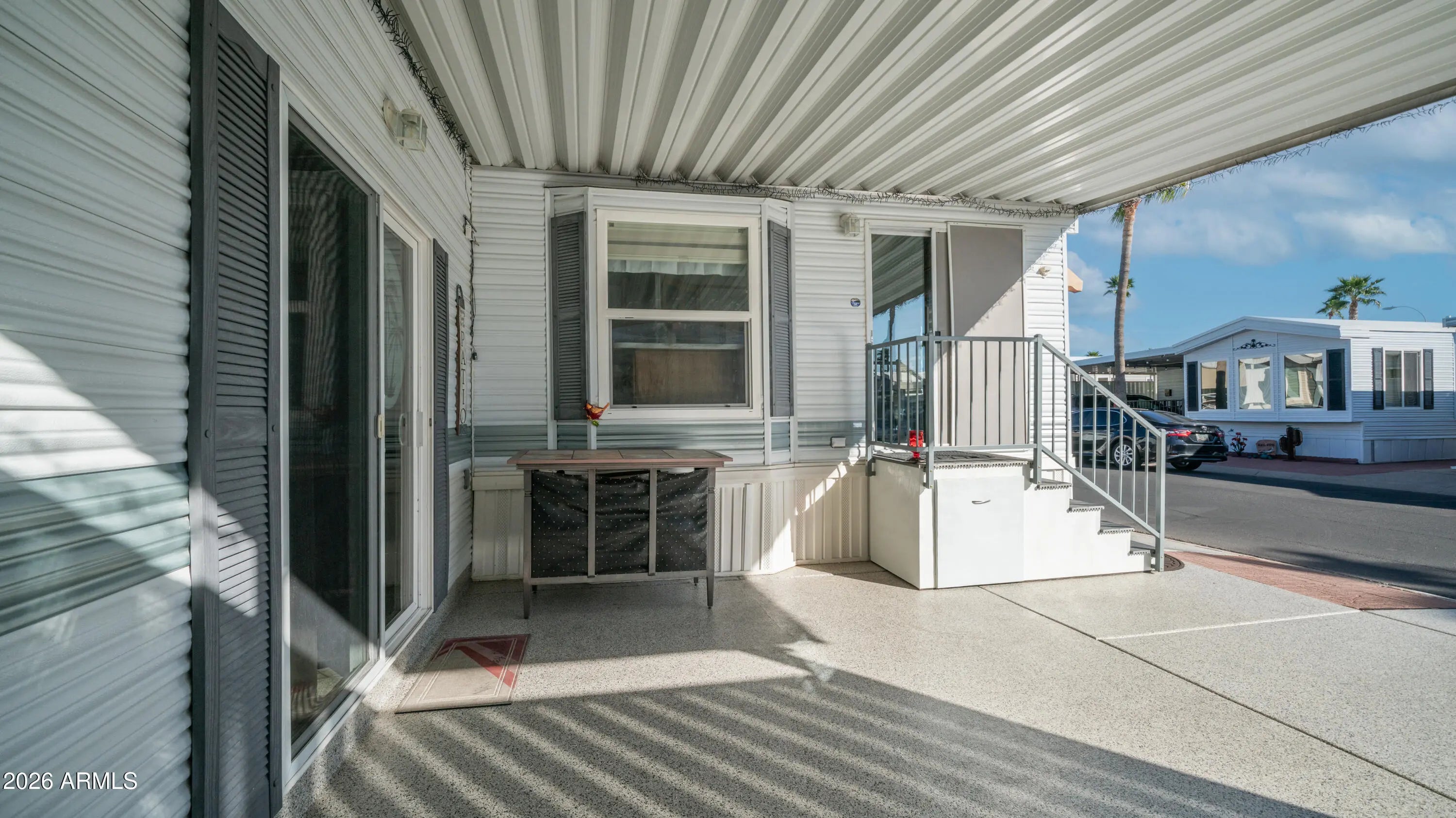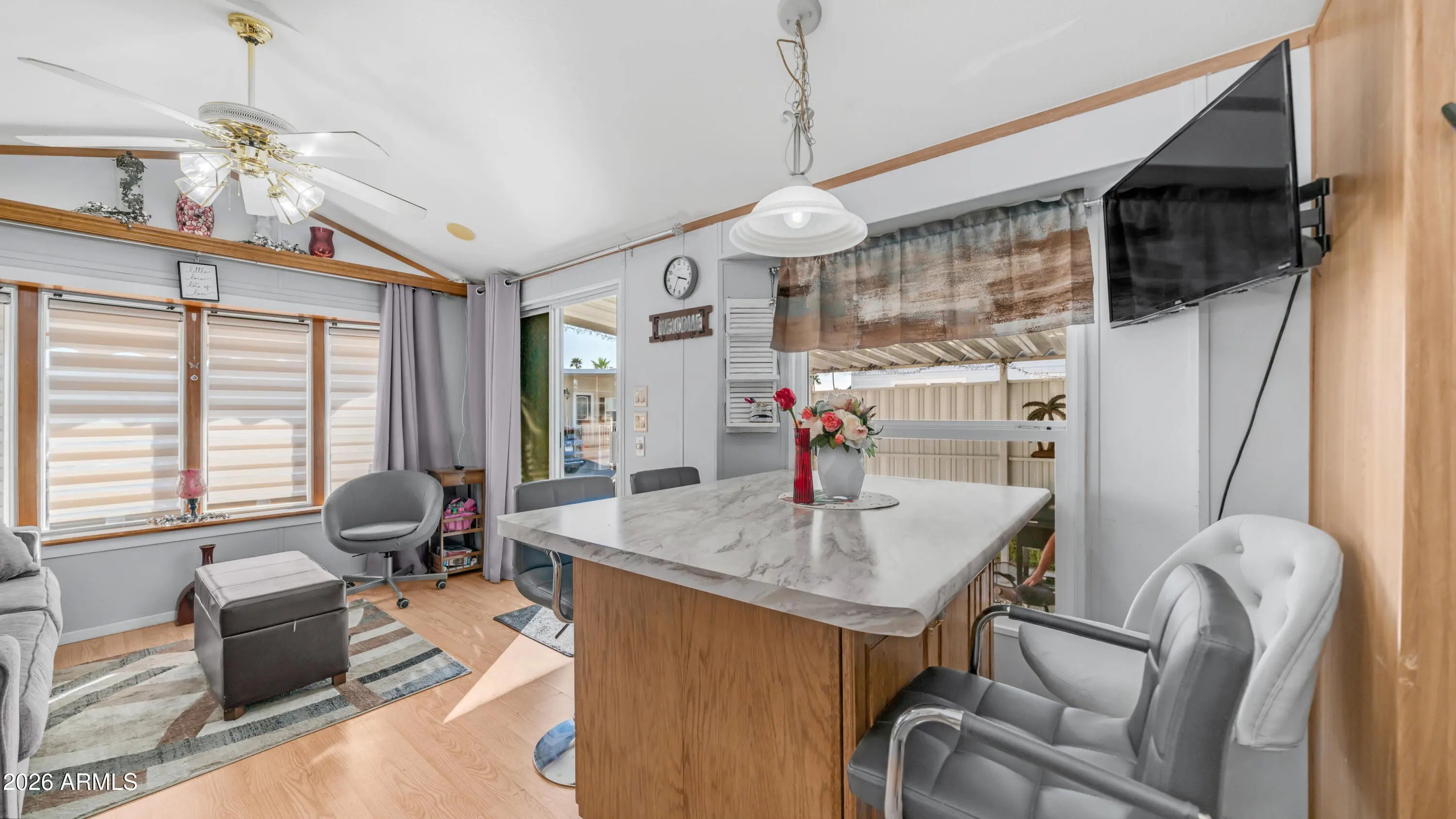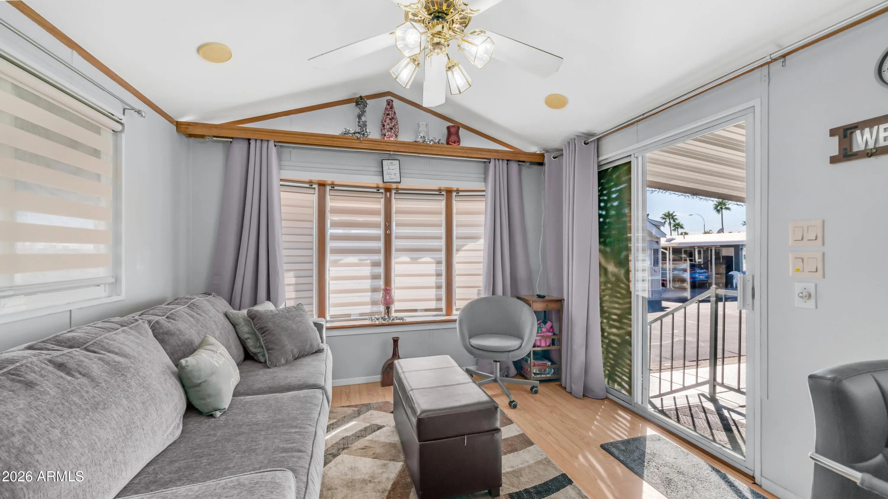This is the one you have been waiting for. As you arrive you immediately notice how meticulously maintained it is, starting with the epoxy coated carport, newer window awnings, & updated heating & cooling system that give you peace of mind from day one. Step inside to vaulted ceilings & beautiful wood look laminate flooring that carry throughout the home, creating a bright open feel. The kitchen is thoughtfully designed with upgraded appliances including a full size flat top stove & microwave, pantry storage, upgraded sink fixture with garbage disposal, & even a water softener to make daily living easy. Dual pane windows with curtains & blinds allow in plenty of natural light while adding efficiency. In the bedroom you will find mirrored closet doors, built in drawer storage, & a high end electric adjustable queen size bed for ultimate comfort. The master bath features a walk in shower & tile flooring, while the hall offers a bonus linen closet for extra storage. Head into the spacious Arizona room where custom tiled stairs lead you into a bright inviting space with sliding doors at both the front & back, perfect for relaxing or entertaining. The second bathroom includes floor to ceiling cabinets that provide incredible additional storage. This home comes complete with laundry & everything you need to start enjoying immediately. Located in Golden Vista, you will have access to outstanding amenities, endless activities, & the perfect setting to soak up the Arizona winters & live the retreat lifestyle you deserve.