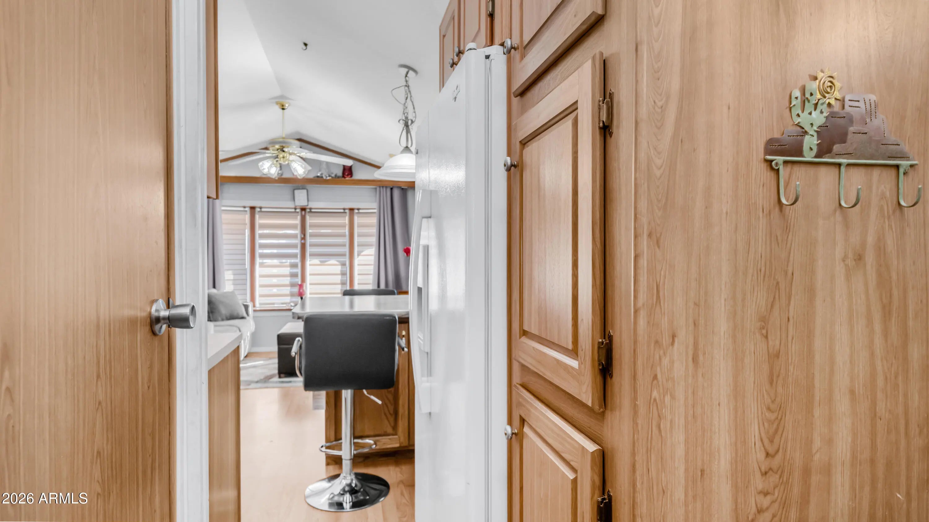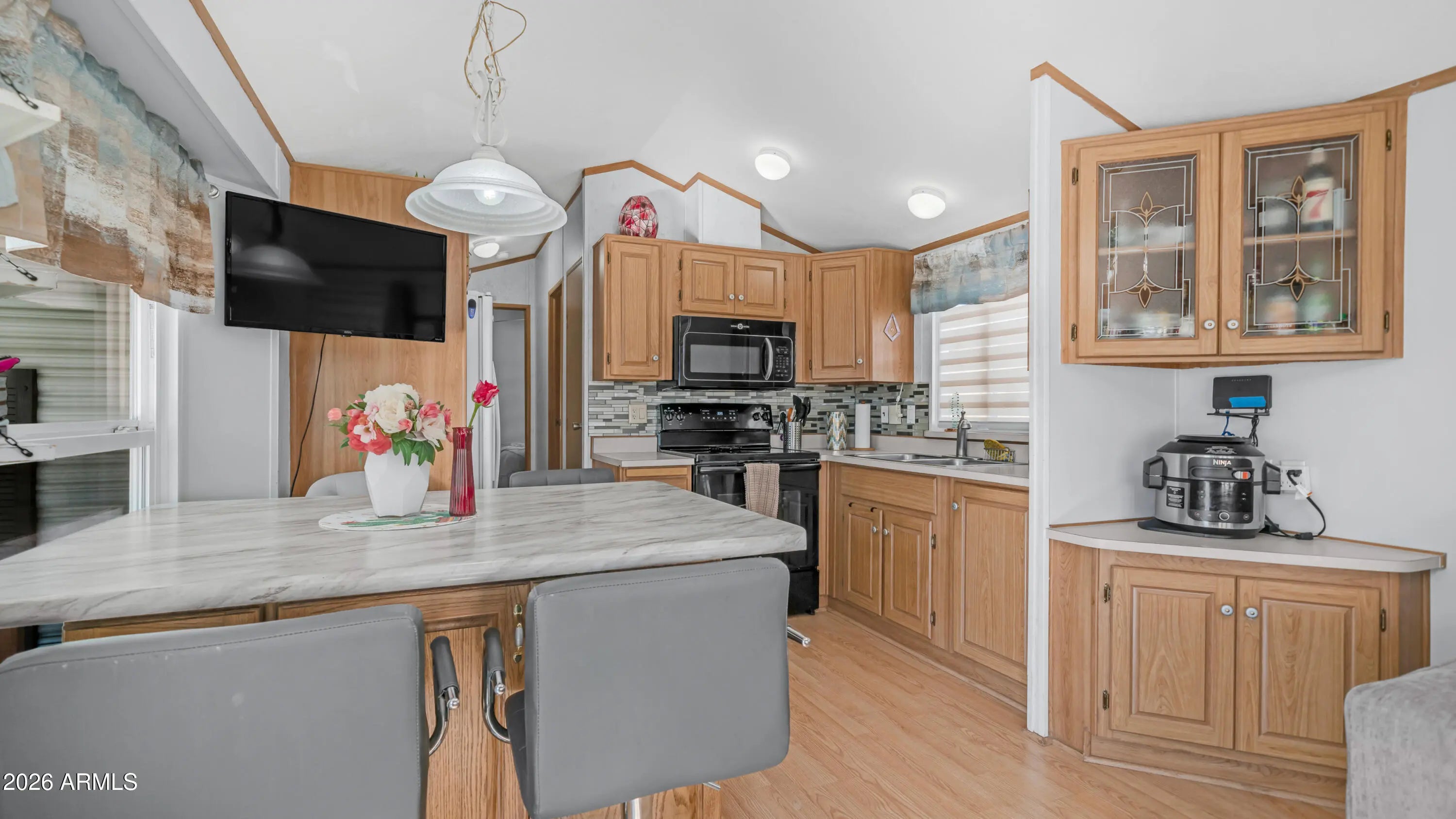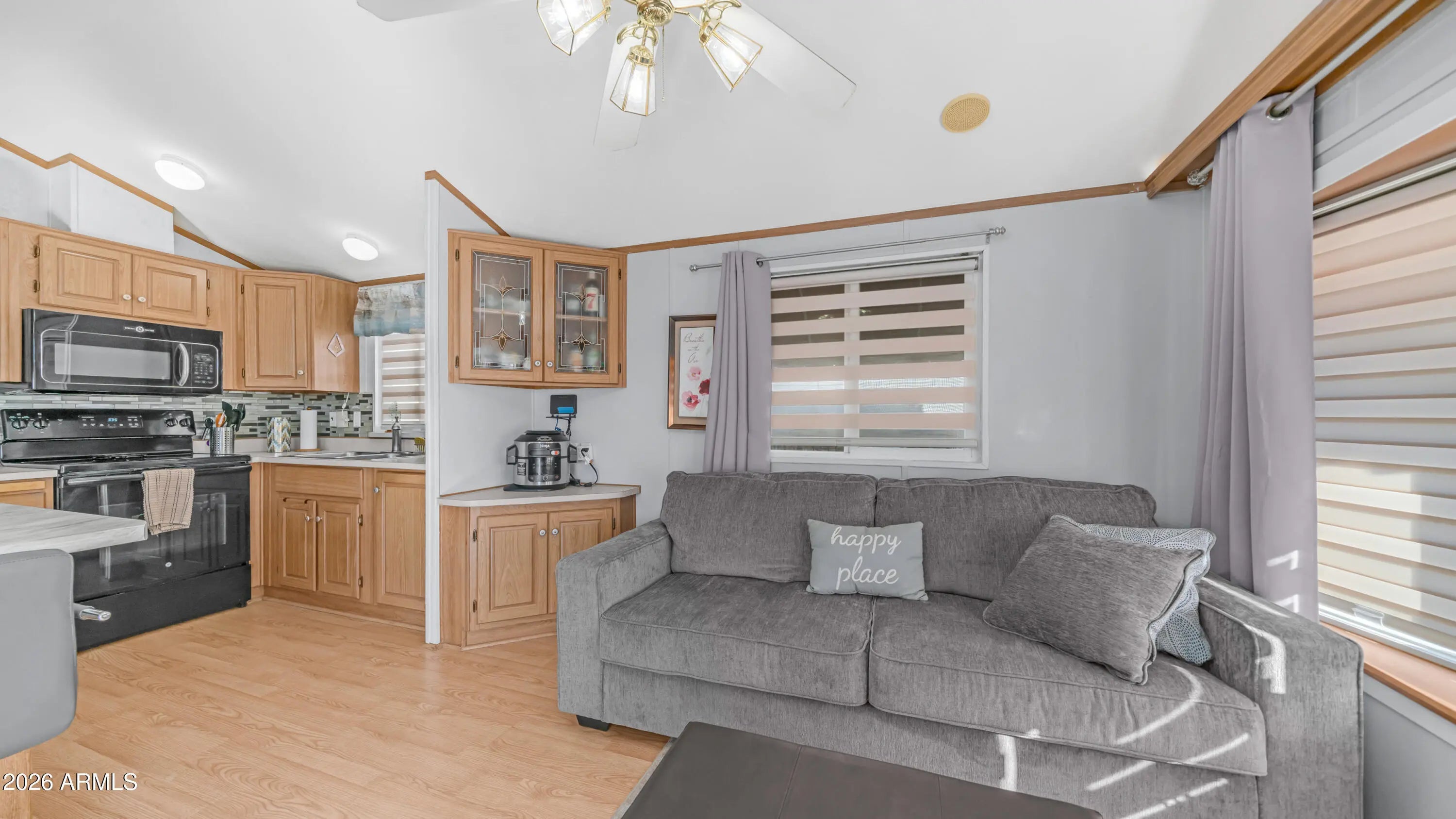 This is the one you have been waiting for. As you arrive you immediately notice how meticulously maintained it is, starting with the epoxy coated carport, newer window awnings, & updated heating & cooling system that give you peace of mind from day one. Step inside to vaulted ceilings & beautiful wood look laminate flooring that carry throughout the home, creating a bright open feel. The kitchen is thoughtfully designed with upgraded appliances including a full size flat top stove & microwave, pantry storage, upgraded sink fixture with garbage disposal, & even a water softener to make daily living easy. Dual pane windows with curtains & blinds allow in plenty of natural light while adding efficiency. In the bedroom you will find mirrored closet doors, built in drawer storage, & a high end electric adjustable queen size bed for ultimate comfort. The master bath features a walk in shower & tile flooring, while the hall offers a bonus linen closet for extra storage. Head into the spacious Arizona room where custom tiled stairs lead you into a bright inviting space with sliding doors at both the front & back, perfect for relaxing or entertaining. The second bathroom includes floor to ceiling cabinets that provide incredible additional storage. This home comes complete with laundry & everything you need to start enjoying immediately. Located in Golden Vista, you will have access to outstanding amenities, endless activities, & the perfect setting to soak up the Arizona winters & live the retreat lifestyle you deserve.