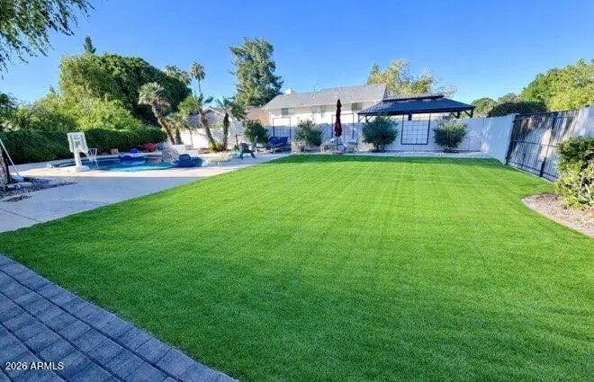 Classic brick home, corner lot, in Mesa's desirable Citrus Corridor within Orange Blossom Estates. Set on a generous cul-de-sac lot with grassy backyard built for entertaining & along with a generous pool. New custom Arcadia doors (2025) open to an extended covered patio with paver hardscape--perfect for relaxing or entertaining. Wood-look luxury vinyl plank flooring in the spacious primary bedroom and family room, plus plantation shutters throughout (2021). The hall bathroom has been beautifully remodeled (2021) to the studs. Interior highlights include a stone wood-burning fireplace, pocket doors in the family room, and a large walk-in pantry. Interior and exterior painted in (2022). A welcoming home ready for your personal touches. See upgrade list for additional features! NO HOA !!