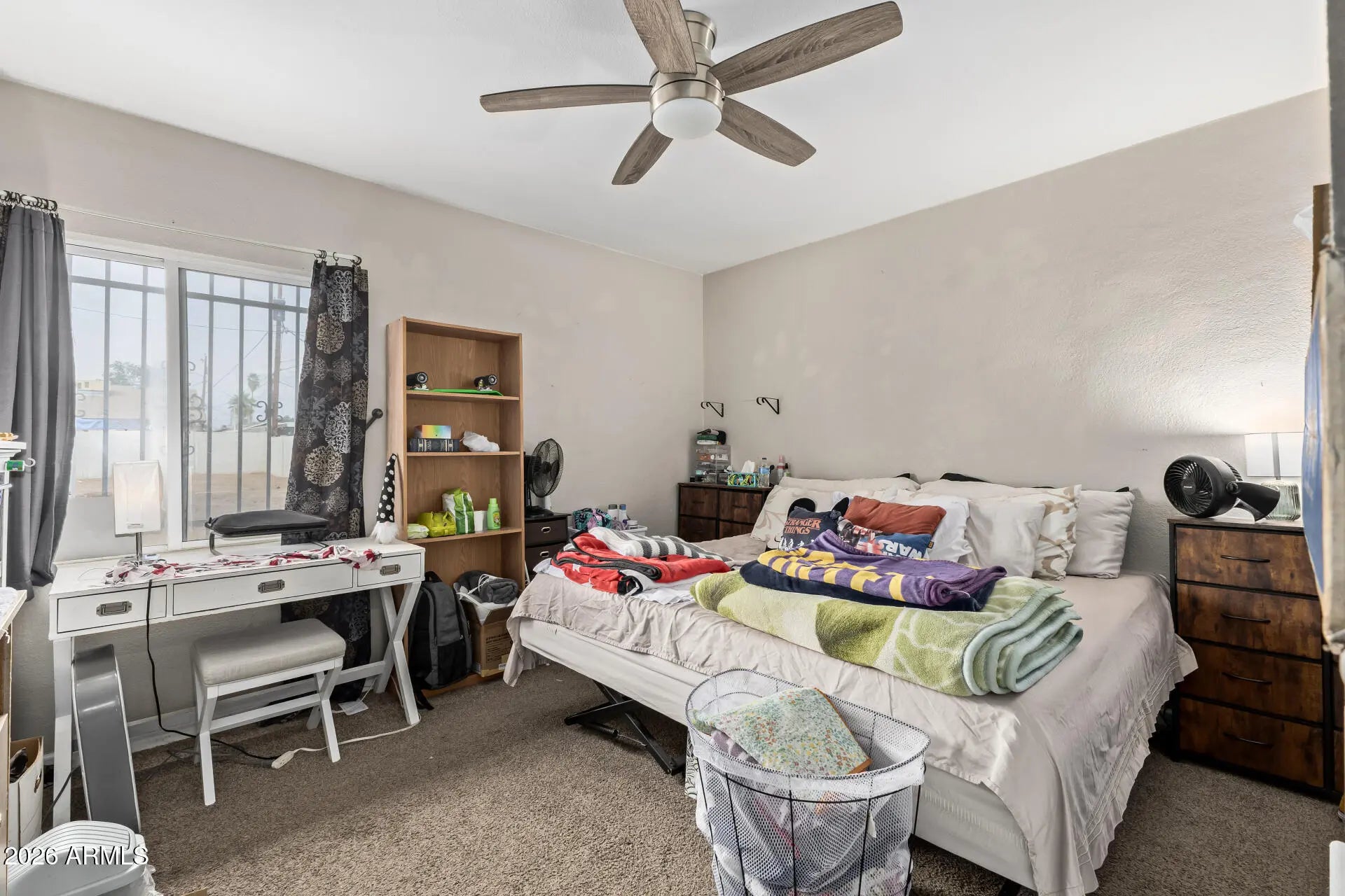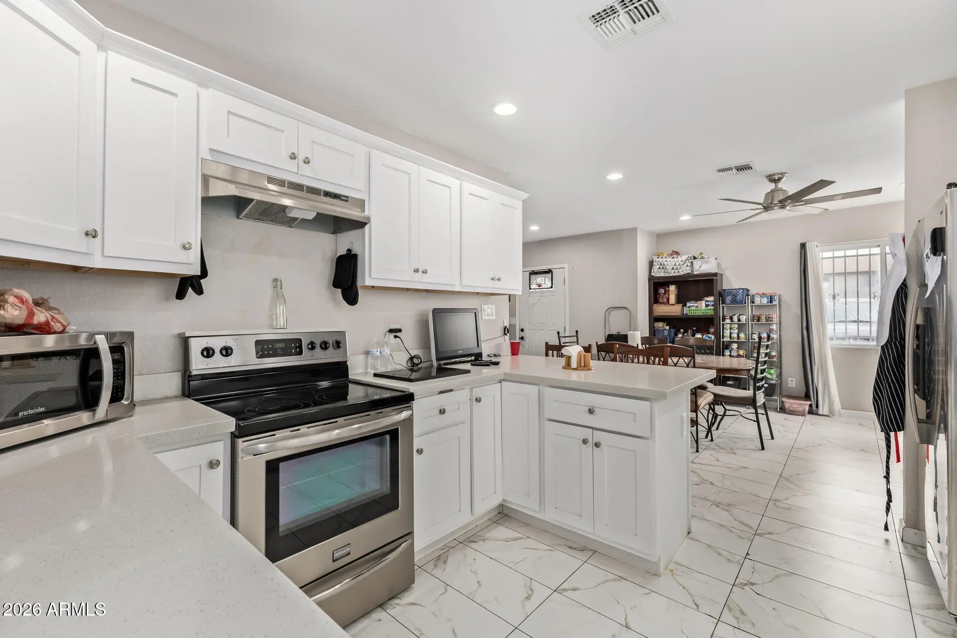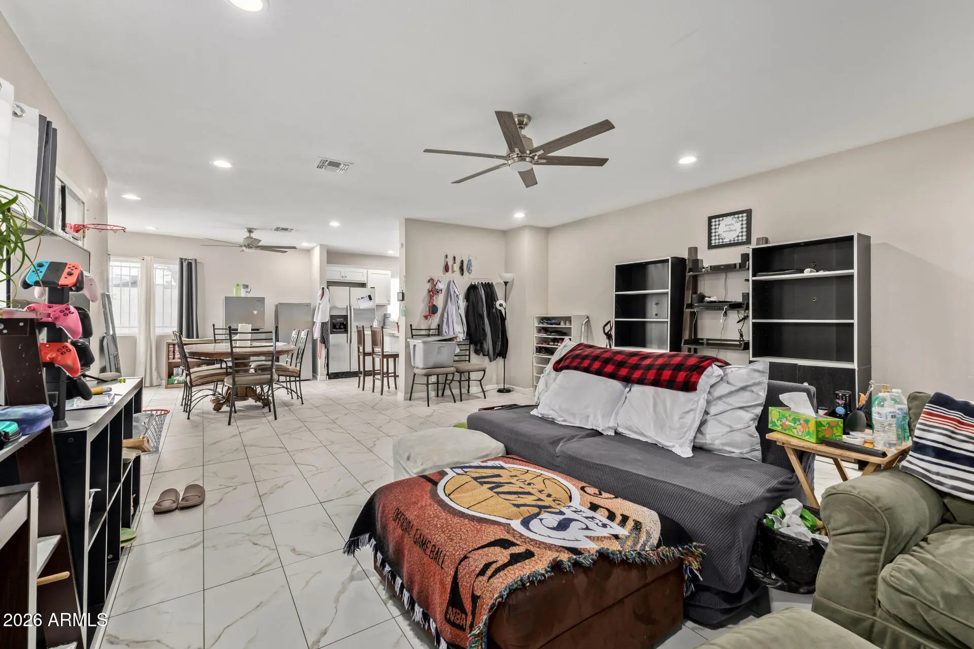 Situated on an expansive lot with abundant space for RVs, trailers, and multiple vehicles. The generous outdoor area offers endless possibilities for expansion, recreation, or future development. Conveniently located near I-17 freeway access and close to GCU. The home features marble-style flooring, modern bathrooms with large walk-in showers, and a bright white kitchen with stainless steel appliances. A basement adds valuable extra space for storage, a home gym, or additional living areas. The property includes a separate guest house with a full white kitchen, two bedrooms, one bathroom, and a dedicated laundry room ideal for rental income, multi-generational living, or a home office setup.