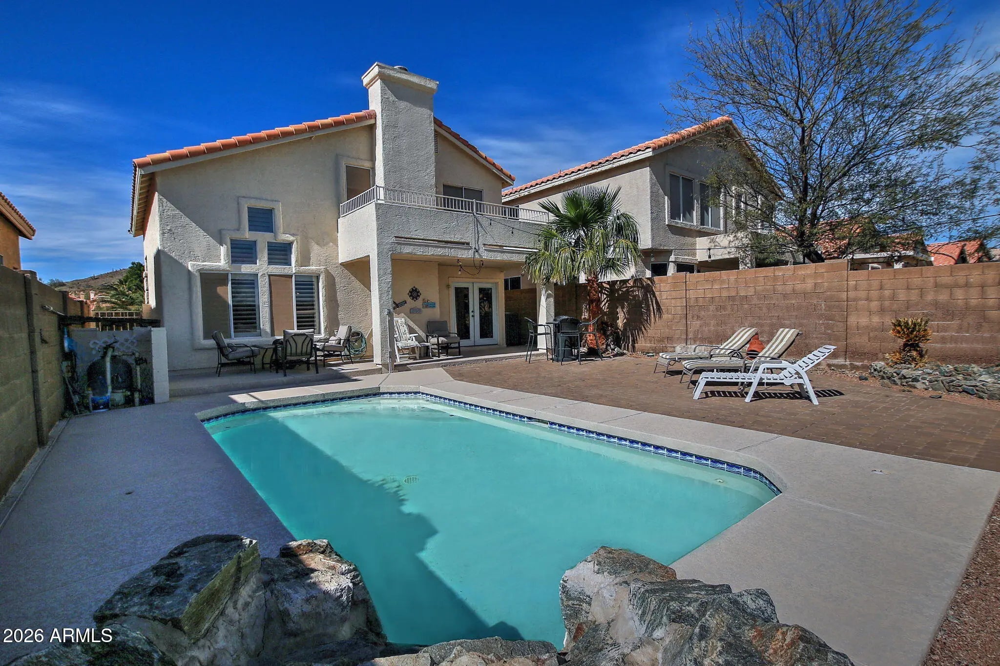 Step into this stunning two-story home. Featuring an open floor plan designed for entertaining. The home flows seamlessly from the living area to the kitchen to the backyard with outdoor pavers and newer cool decking (2 years old). Primary Bedroom has a balcony overlooking the backyard. Beautiful tile and wood flooring throughout, wood shutters throughout, AC installed in 2023 with 7 years warranty left, pool pump has recently been replaced,.. All appliances included, No neighbors behind, close access to 202 highway, walking paths.